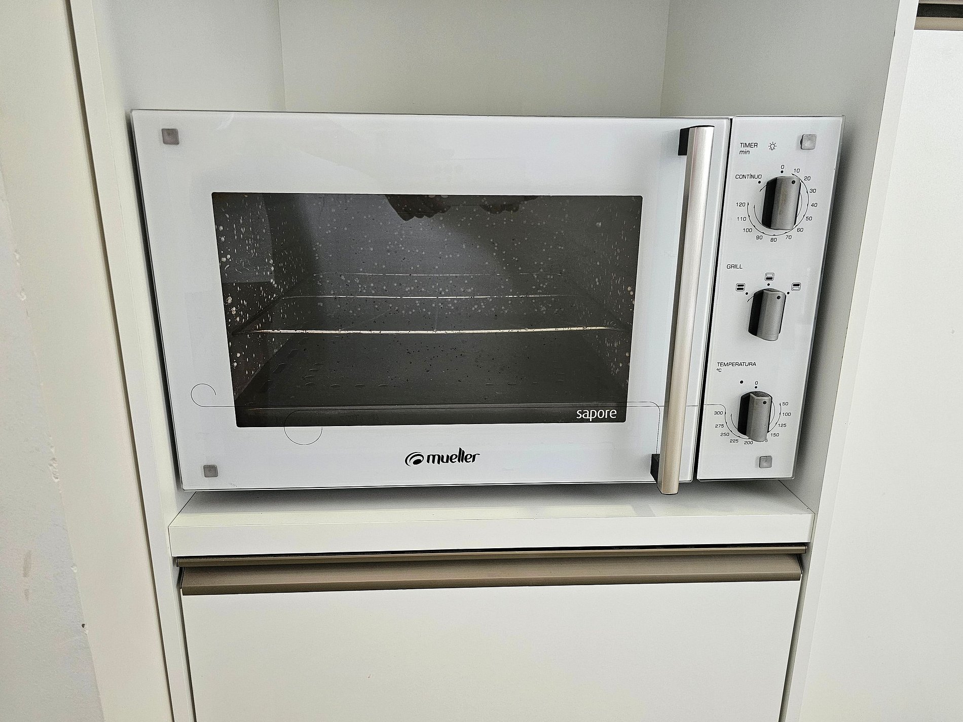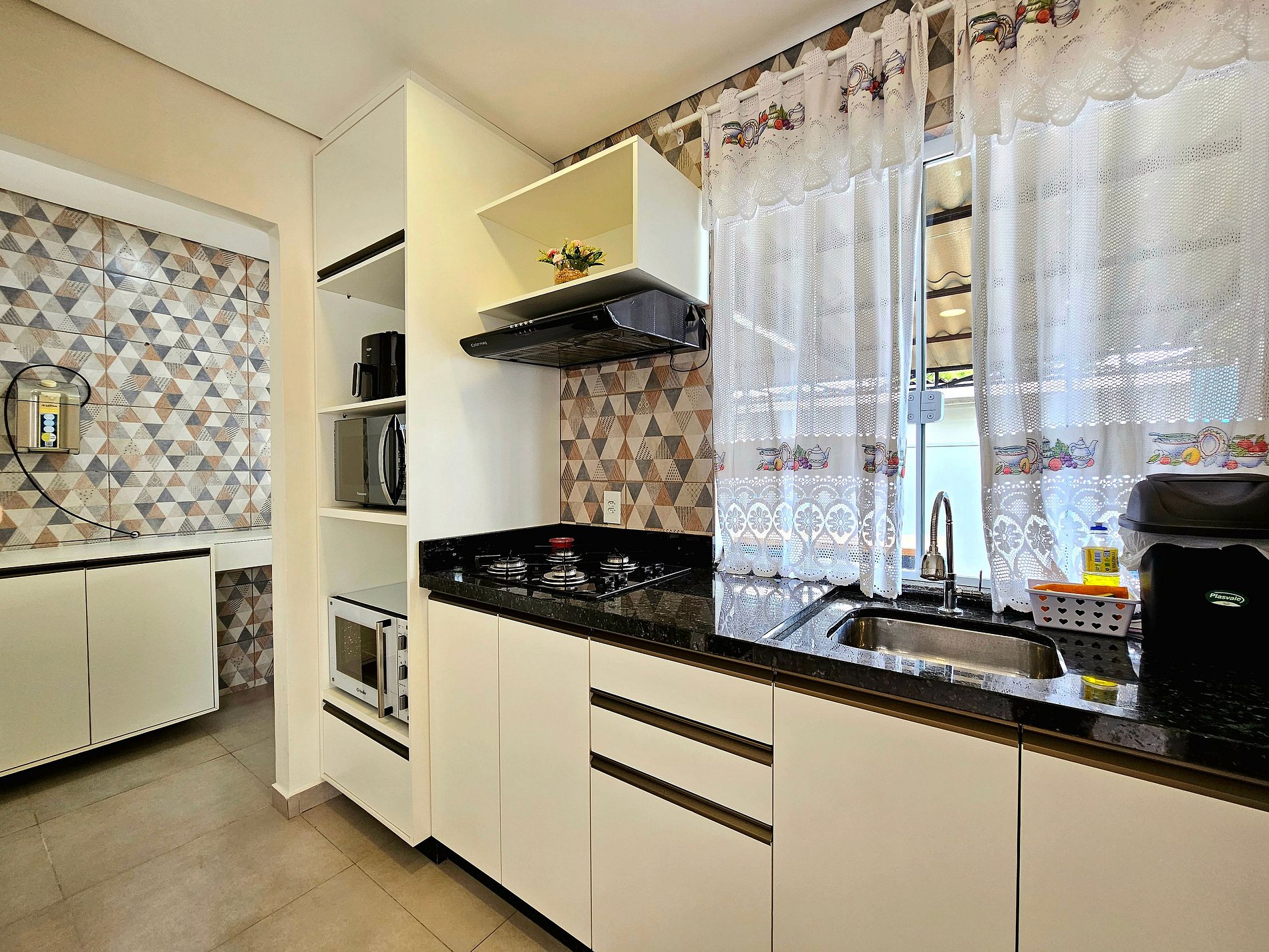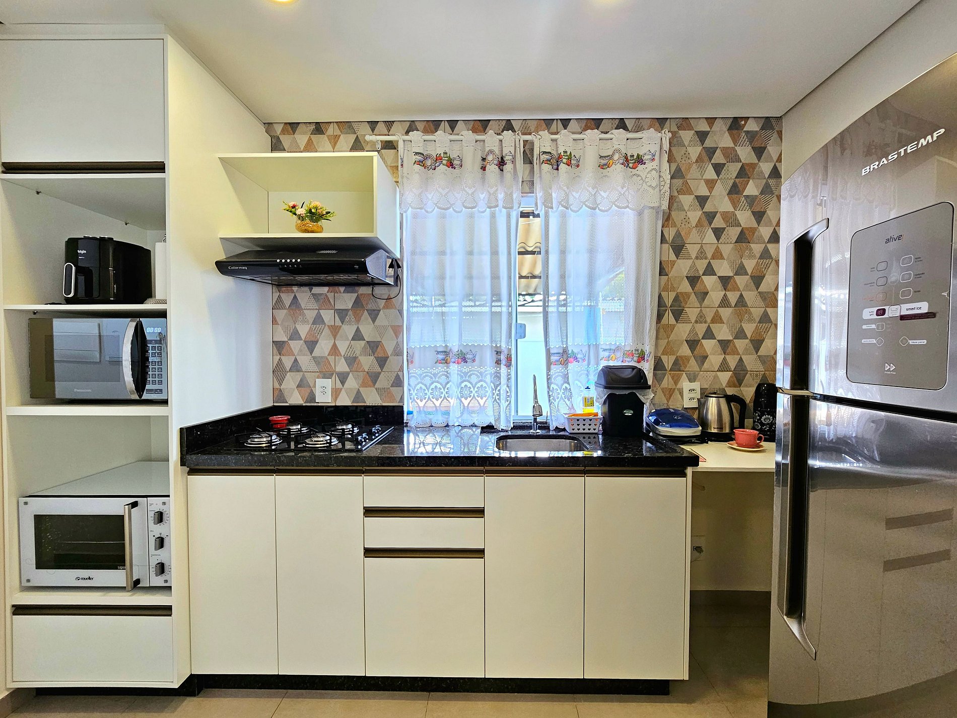 Cozinha completa com utensílios e louças para as refeições, microondas, liquidificador, sanduicheira, temos filtro de agua também.