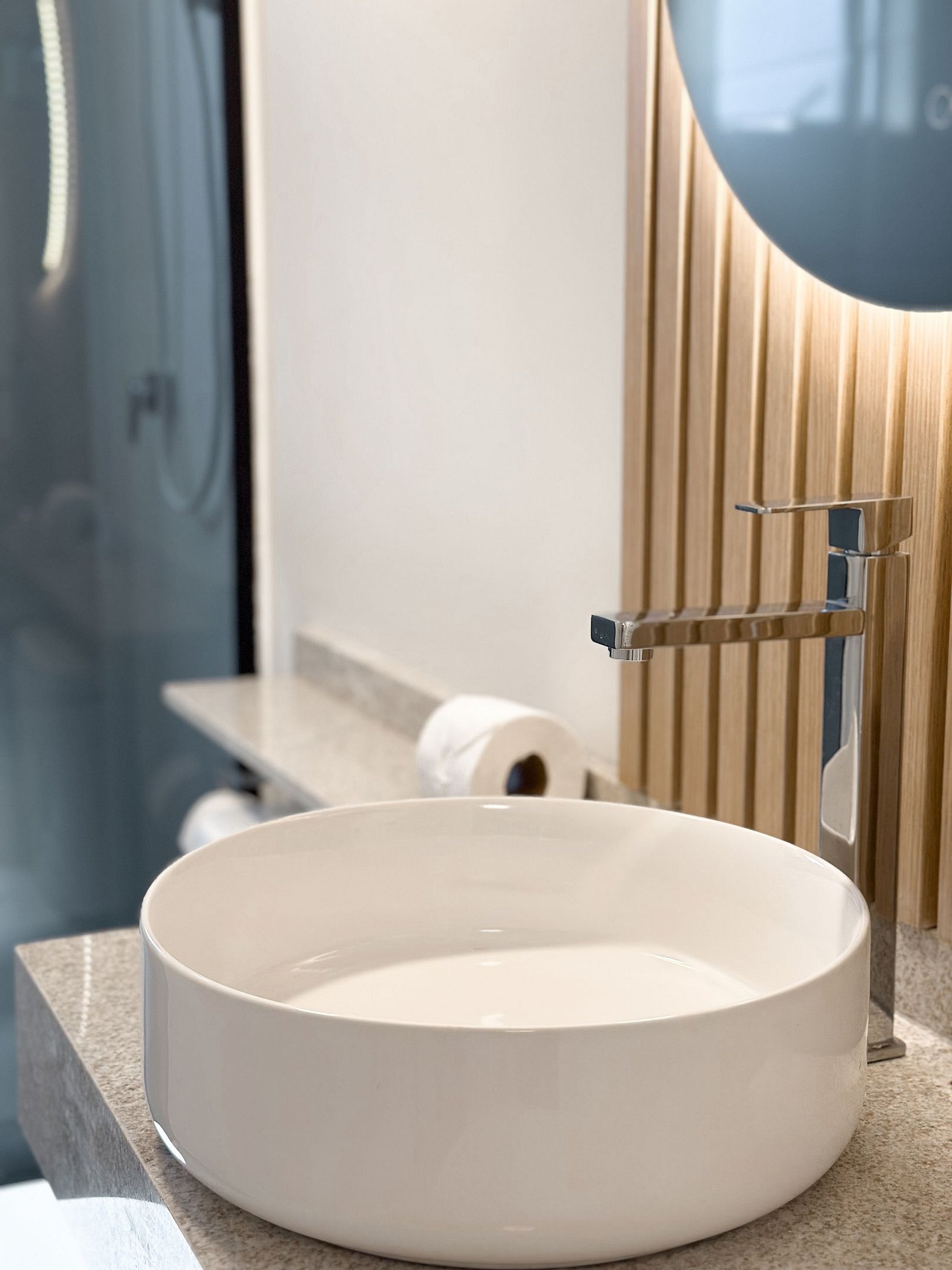Um verdadeiro santuário privativo, com revestimento em madeira ripada, espelho retroiluminado, cuba de design sobre bancada em pedra e ducha.