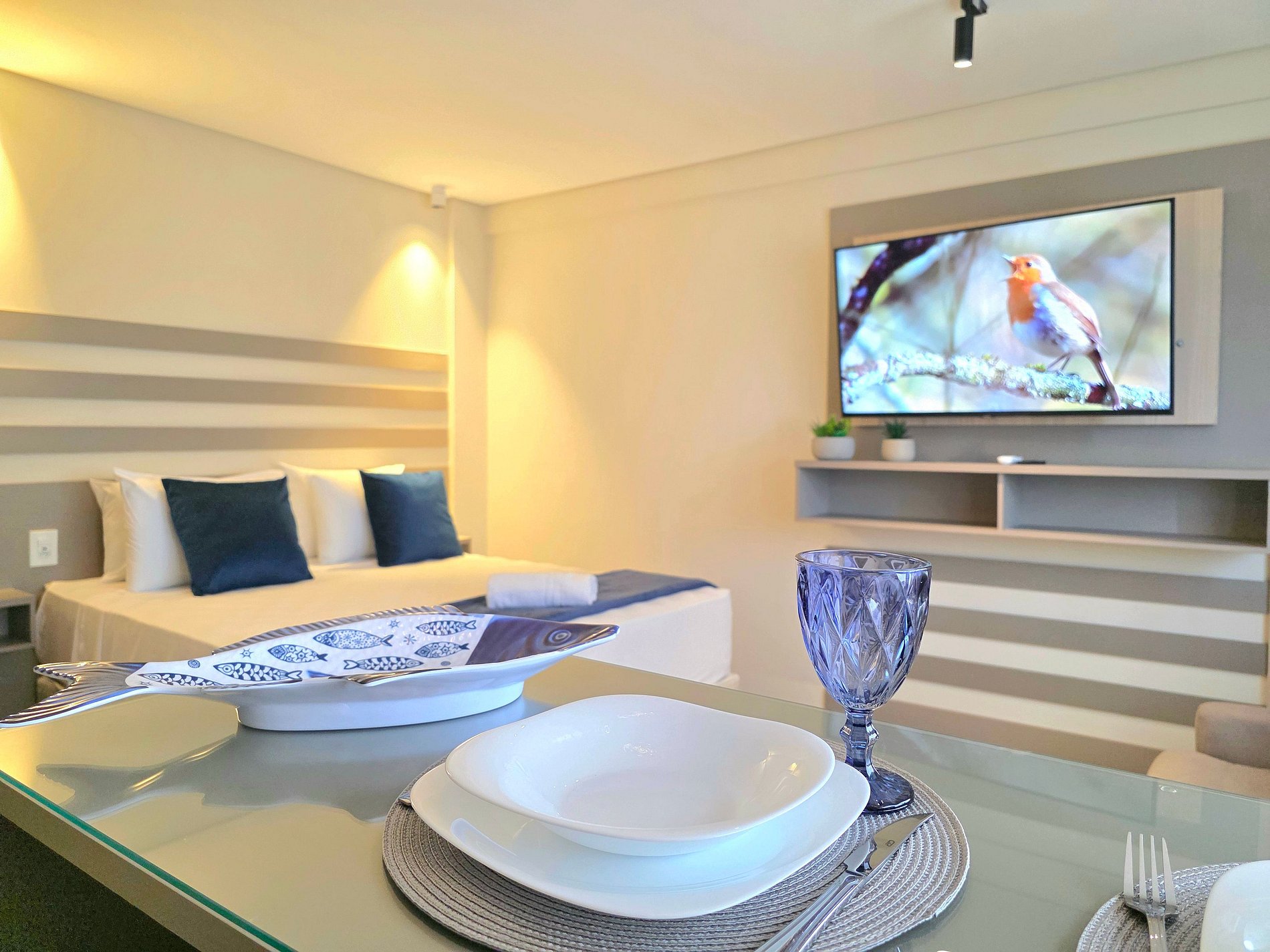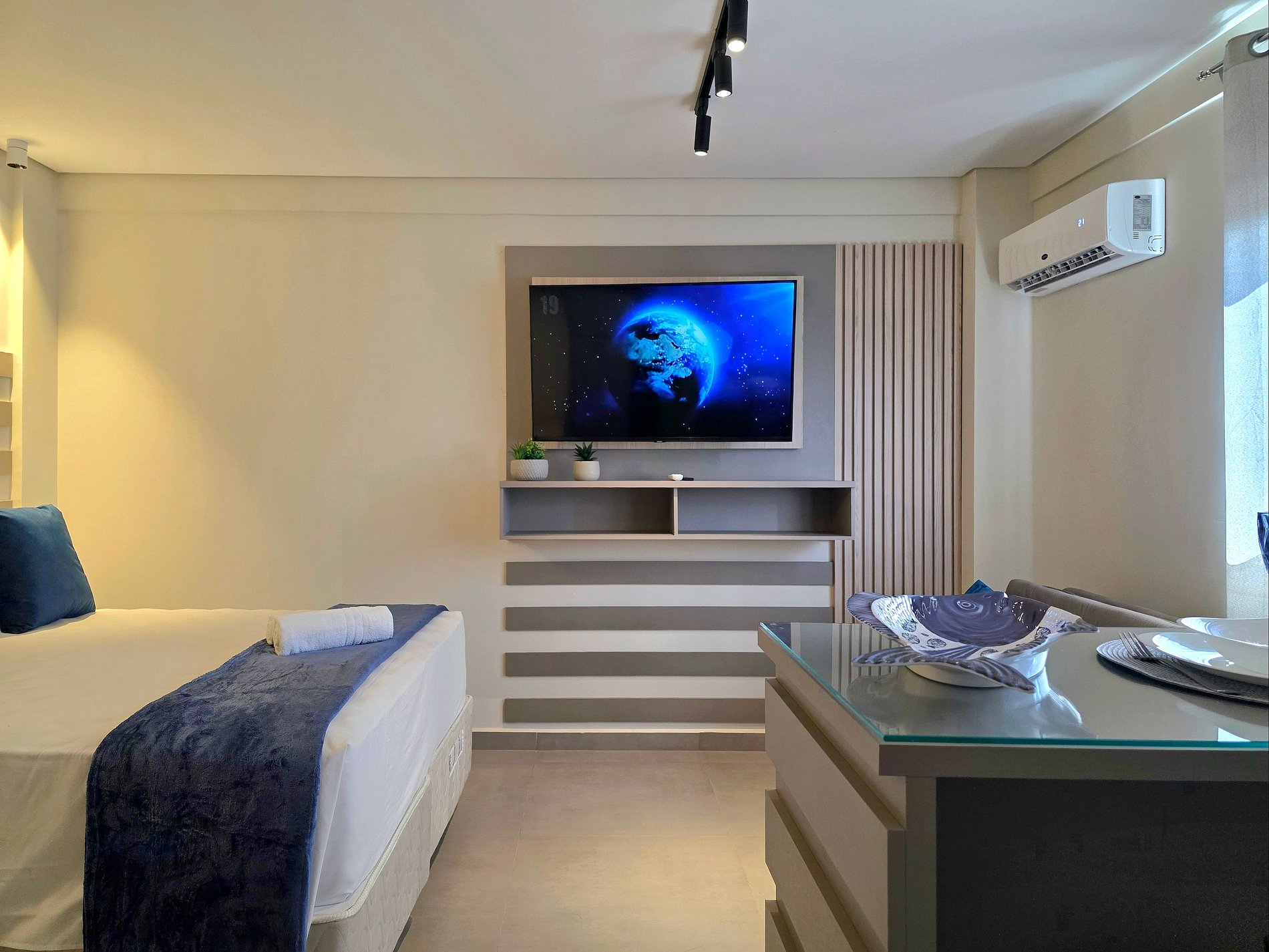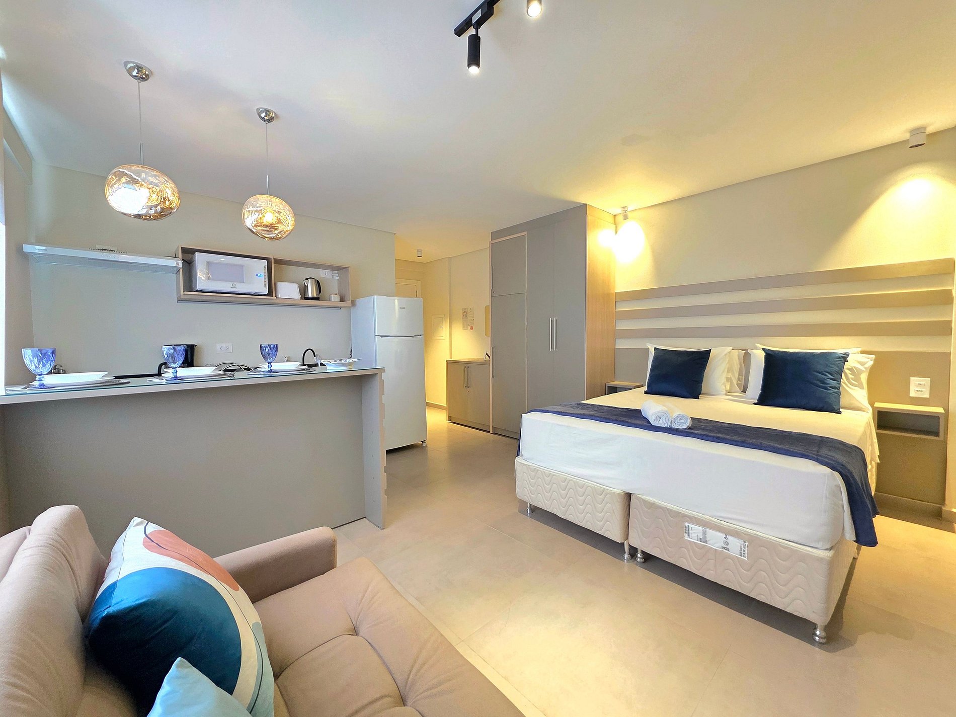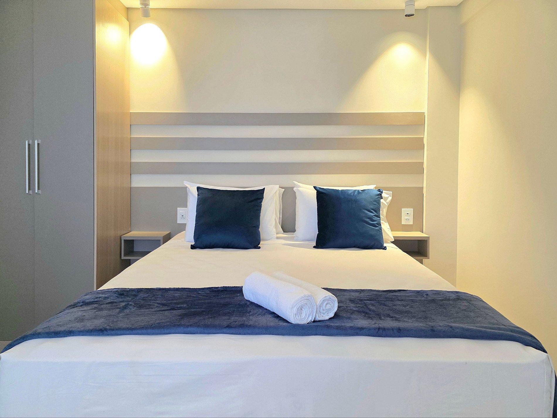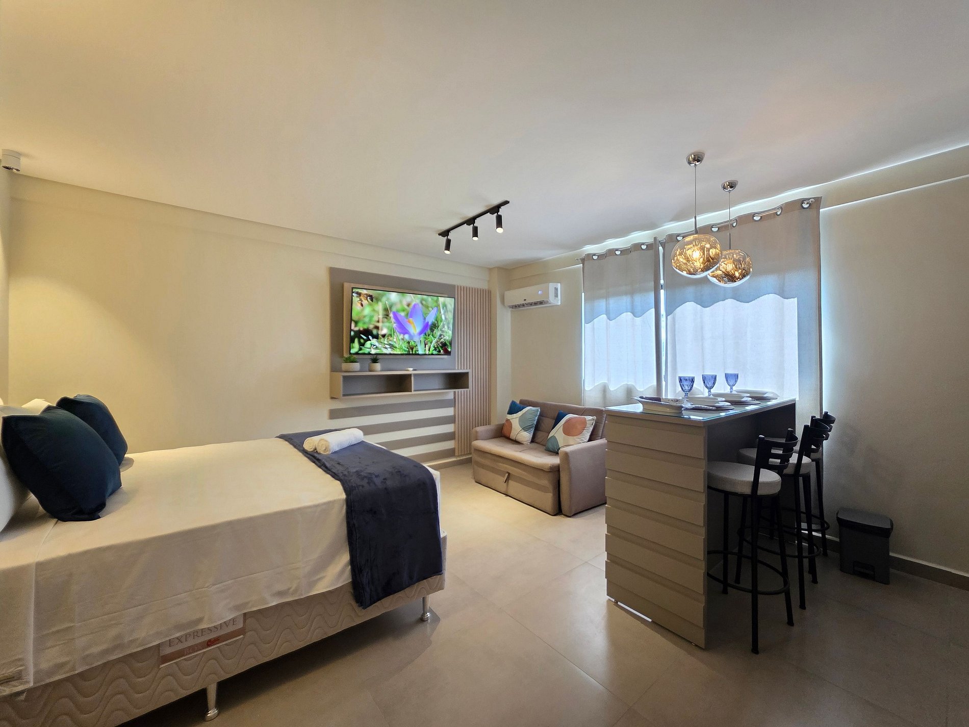 Petra Studio Suite captura a essência geológica dessa maravilha natural e a traduz em um espaço de design interior. Localizado no coração urbano de Foz, este studio é um refúgio de sofisticação, onde a paleta de cinzas minerais e azuis profundos convida à calma absoluta. Capacidade para até 3 pessoas, com cama e sofá-cama. Pensado para viajantes ou casais que valorizam estética, descanso profundo e total conectividade com a cidade, sem abrir mão do luxo de um edifício com amenities.