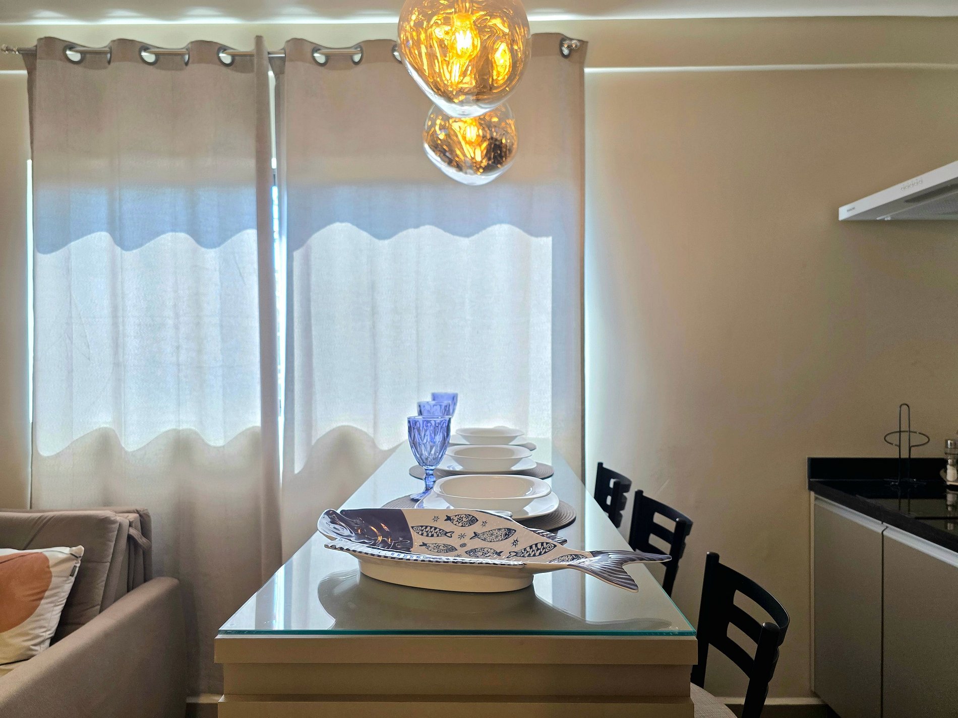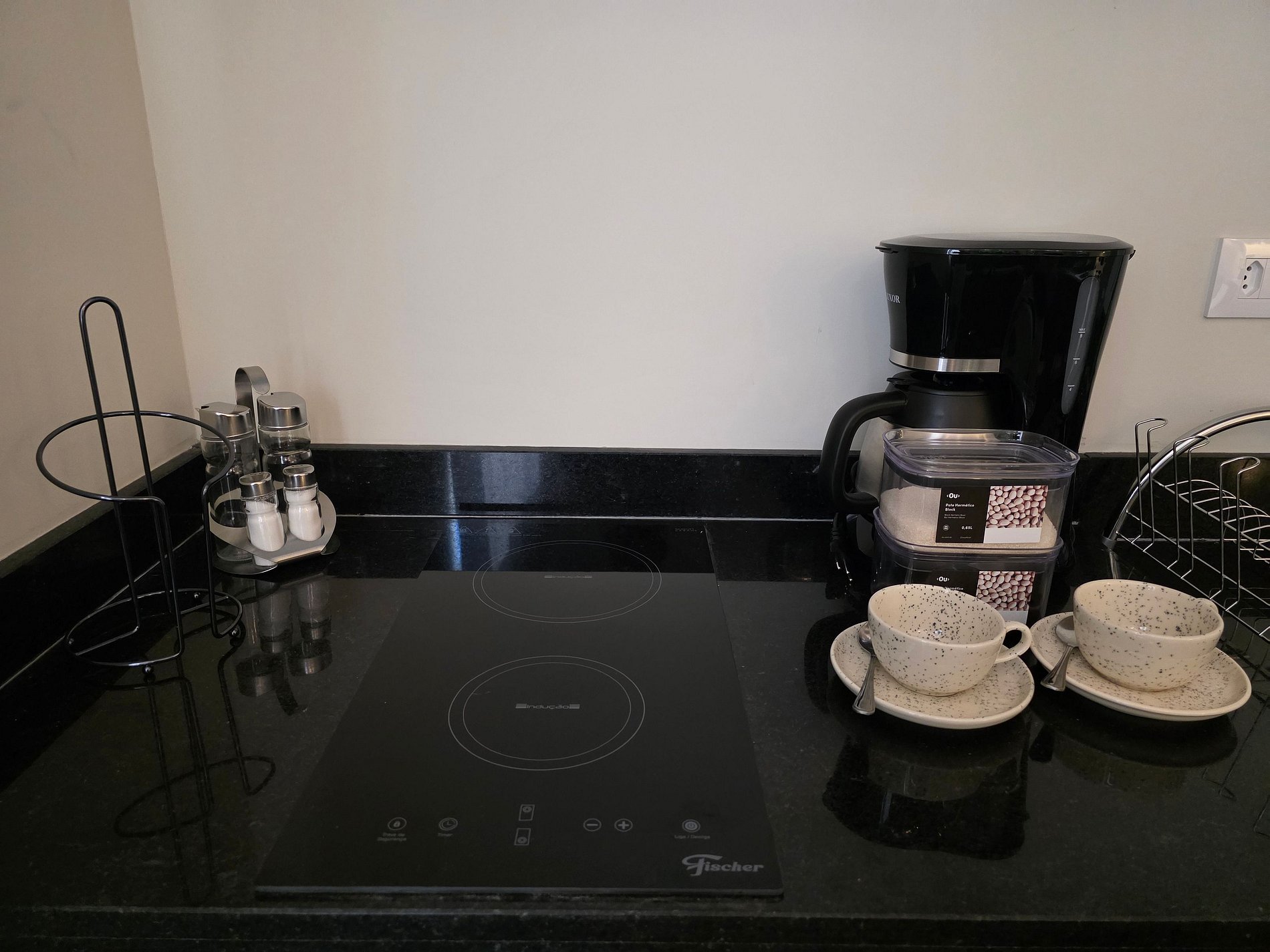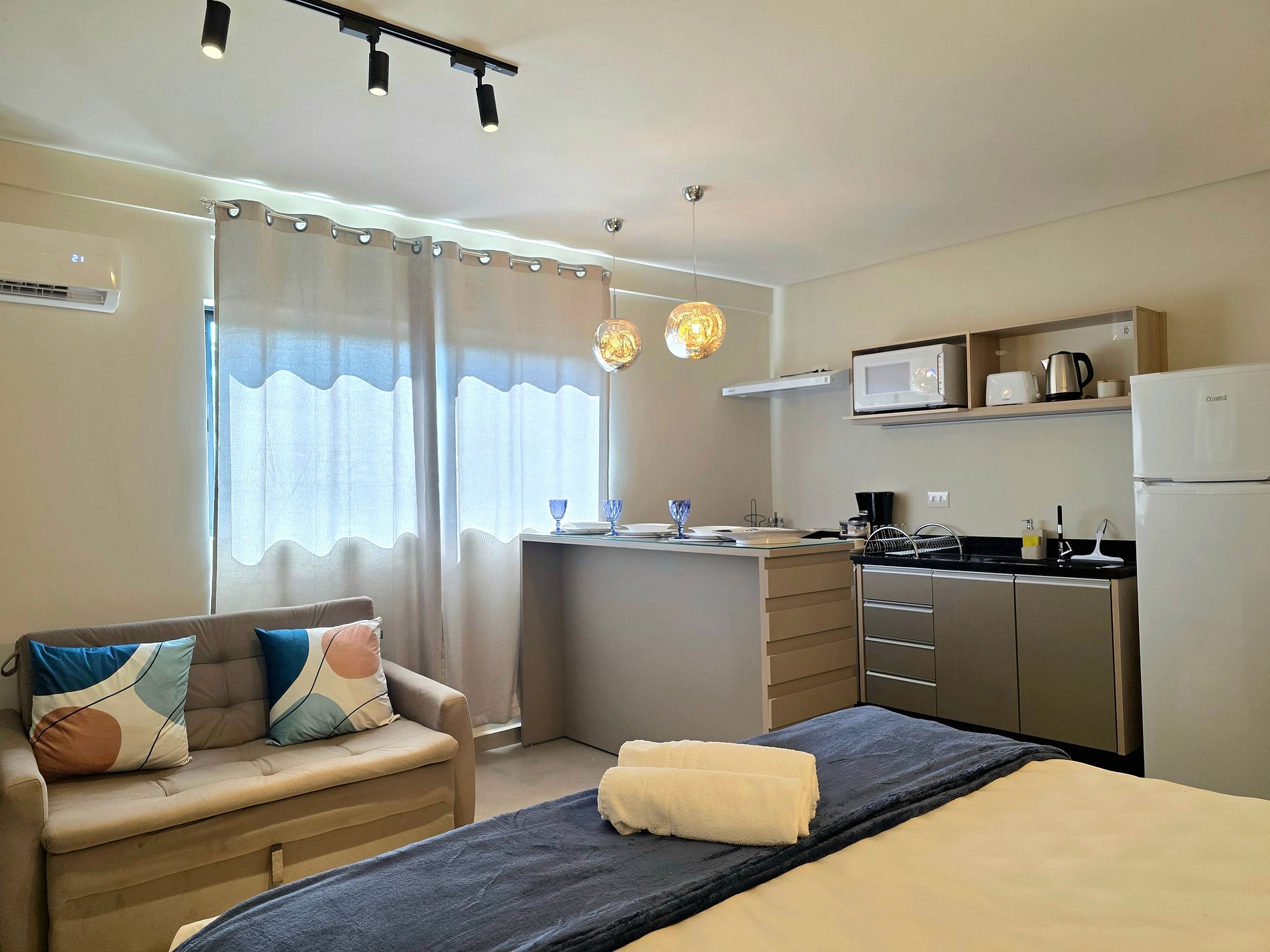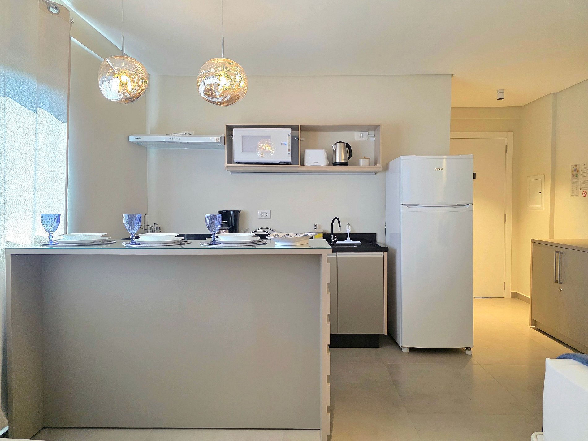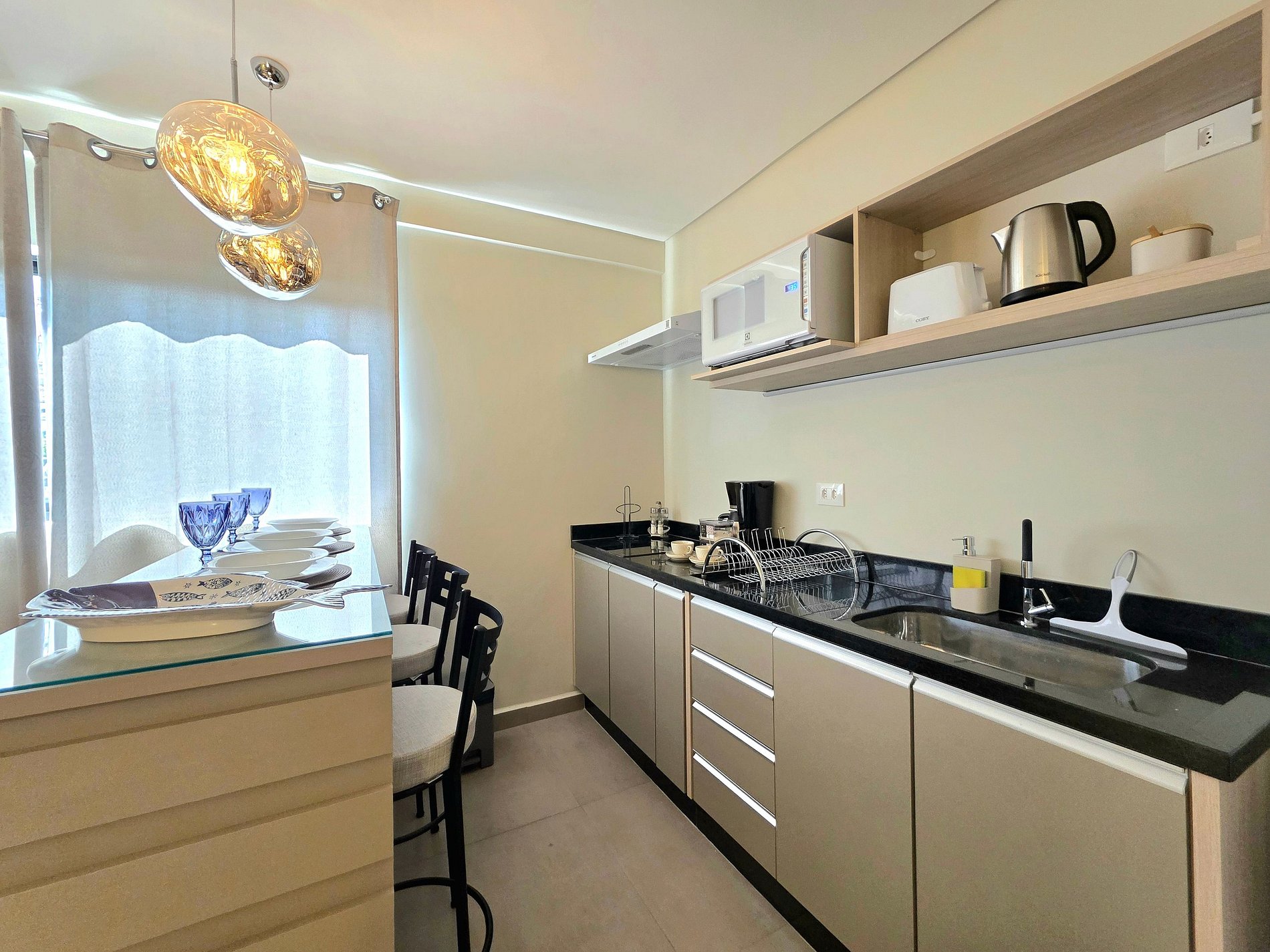 * Cozinha de chef: Totalmente equipada para os amantes da gastronomia. Conjunto completo de cozinha (micro-ondas, geladeira, purificador de ar e cooktop elétrico por indução), panelas de aço inox, frigideiras antiaderentes, cafeteira elétrica para suas manhãs, taças de cristal e louças completas.