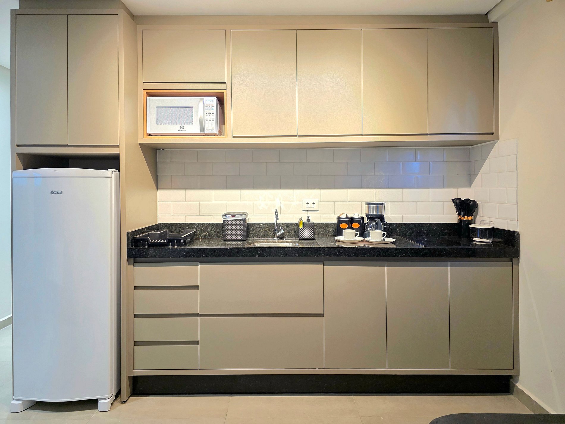 Equipamentos disponíveis: micro-ondas, liquidificador, sanduicheira, cafeteira elétrica e Airfryer.