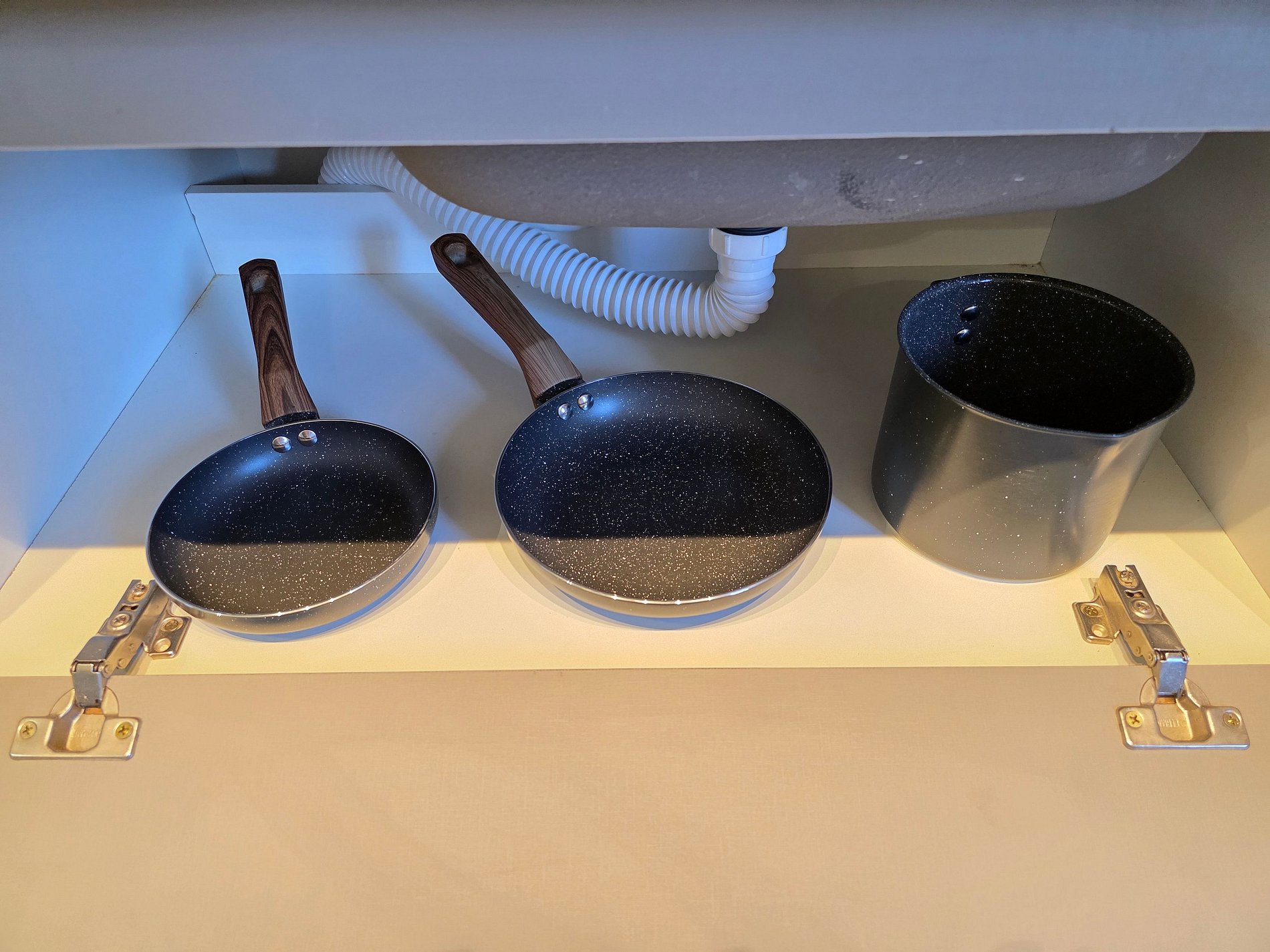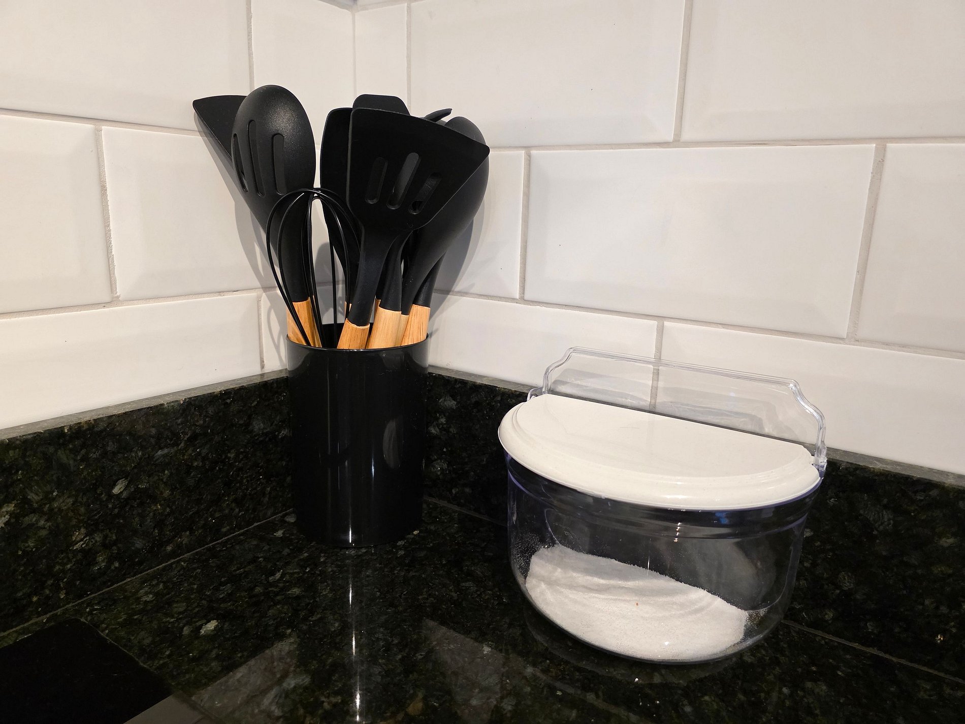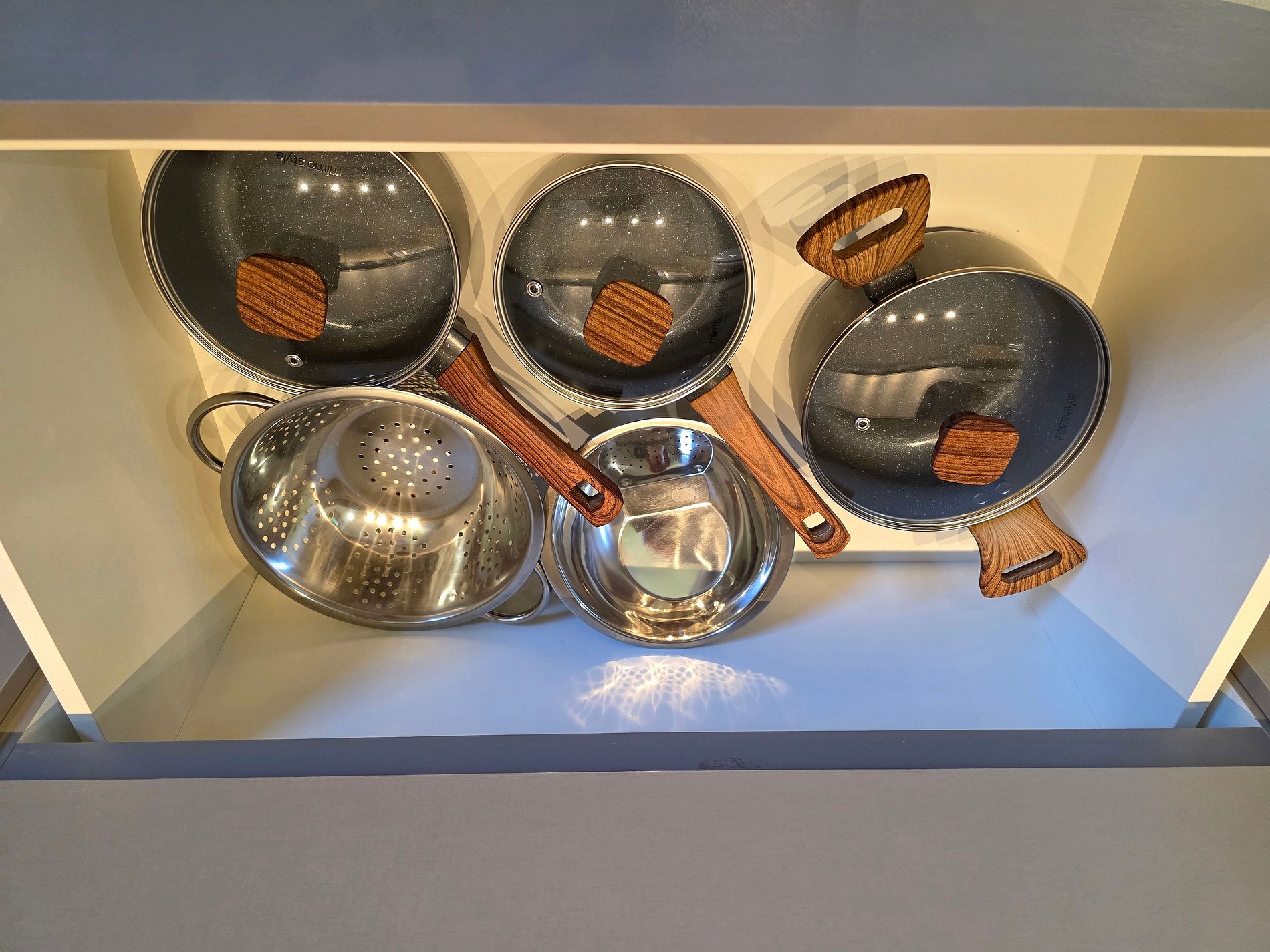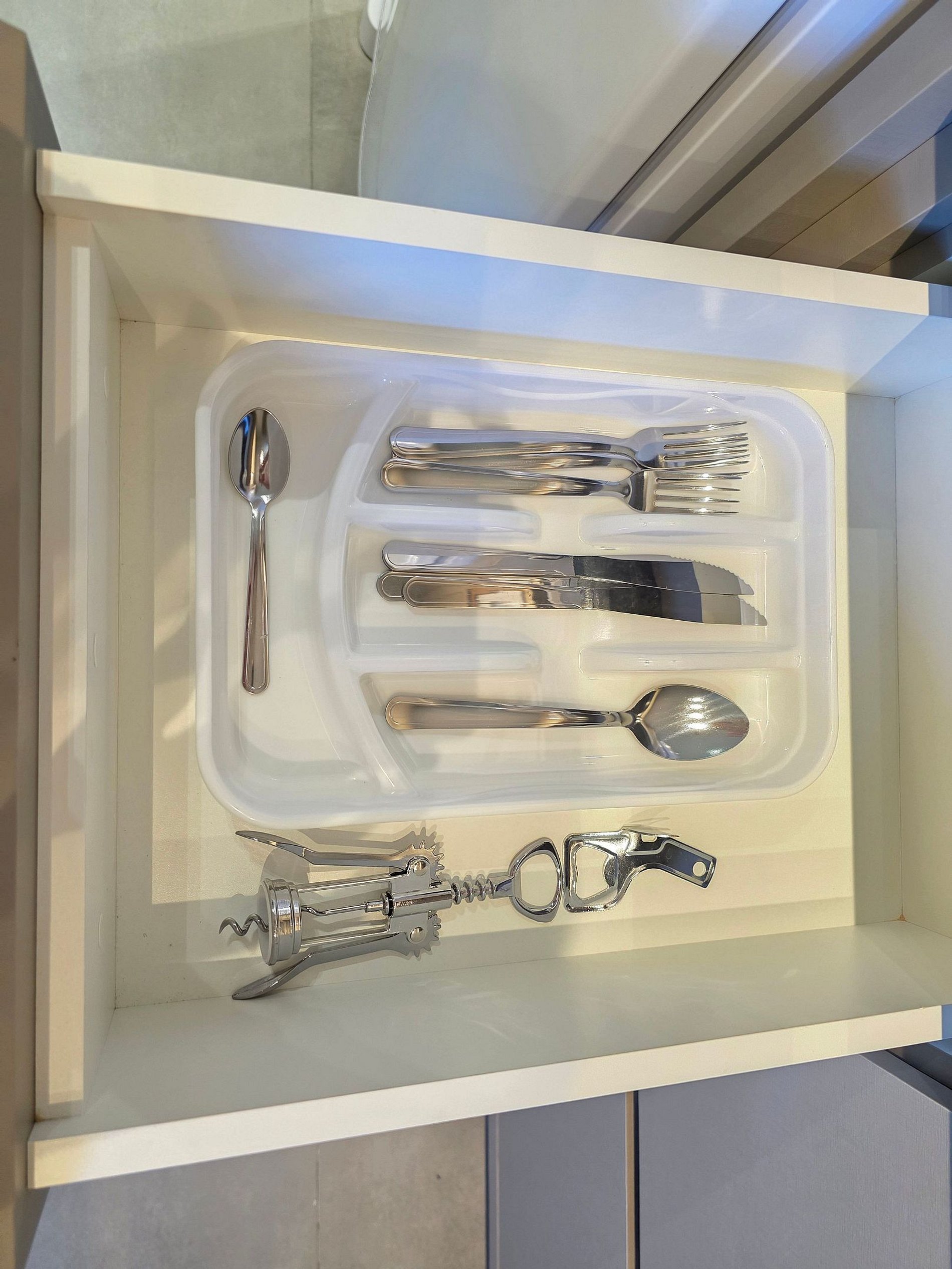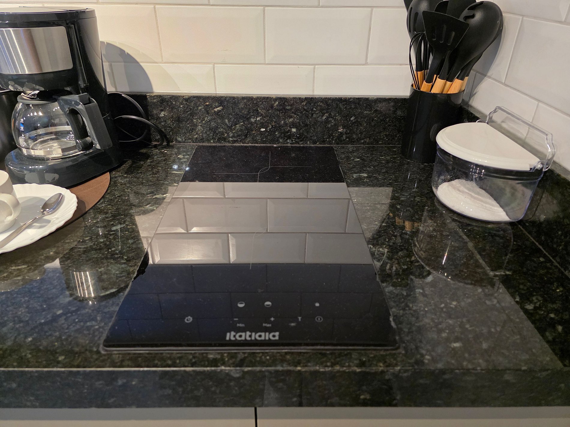 Cozinha completa com utensílios e louças para refeições.