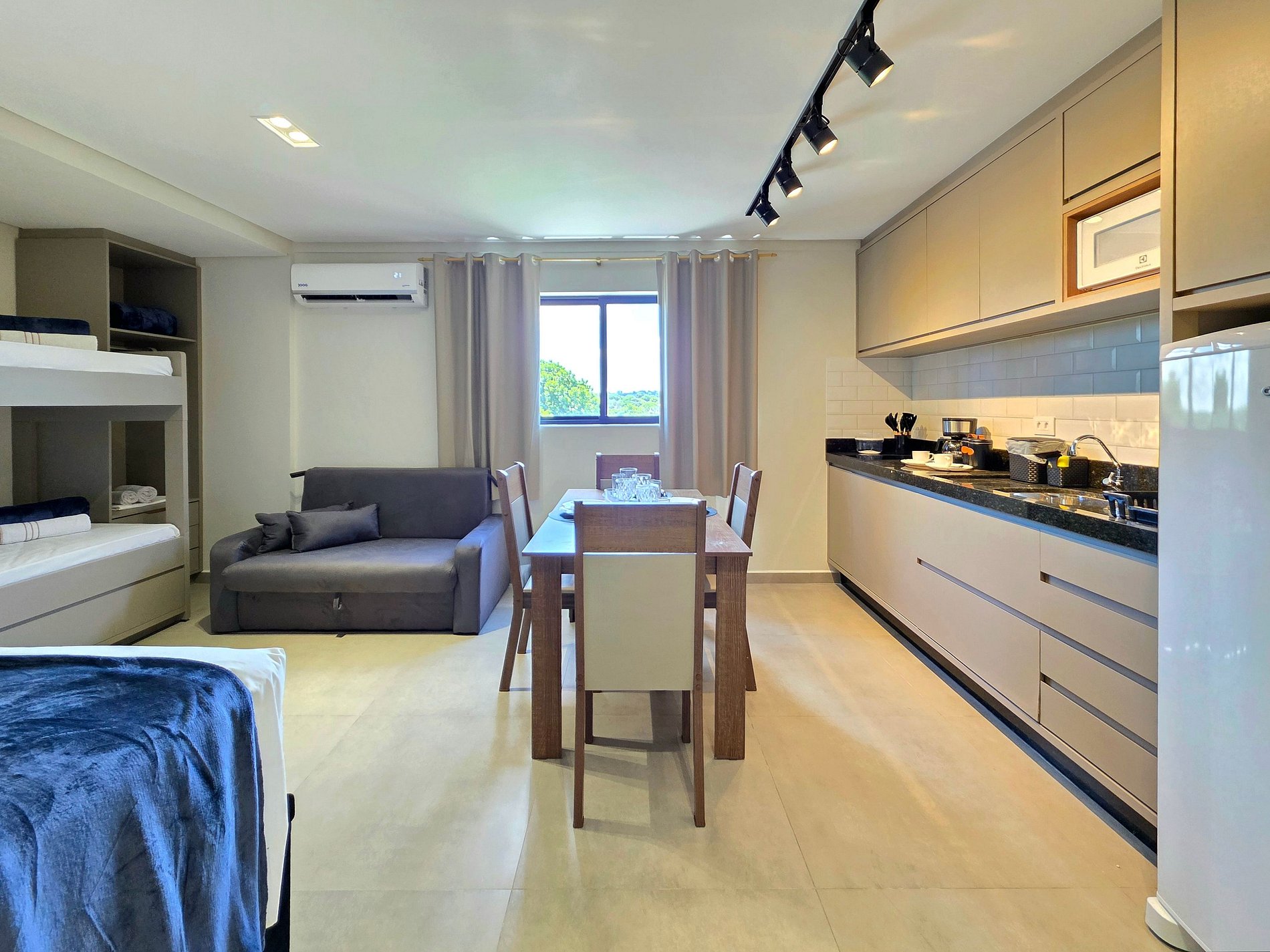 Equipamentos disponíveis: micro-ondas, liquidificador, sanduicheira, cafeteira elétrica e Airfryer.