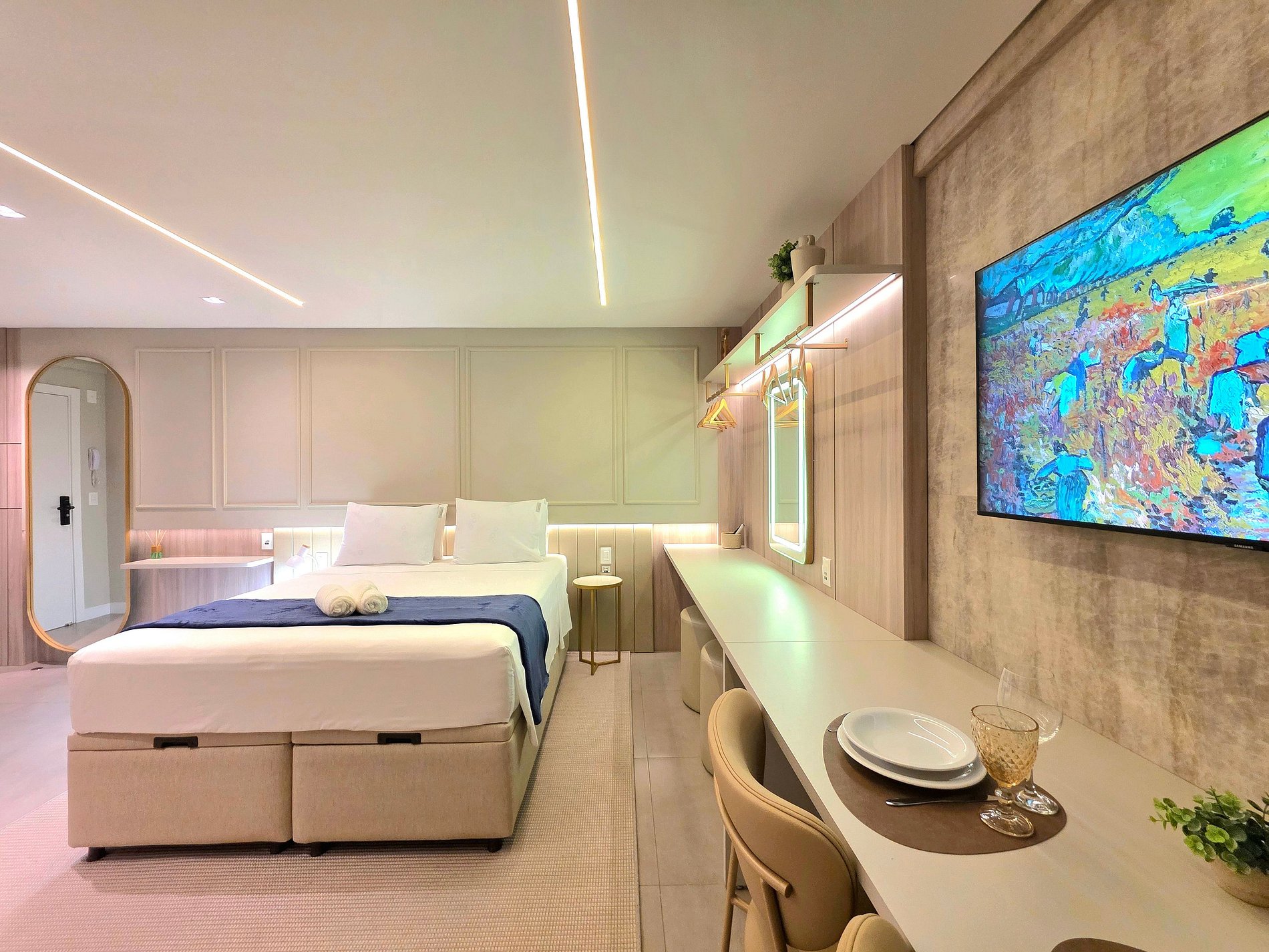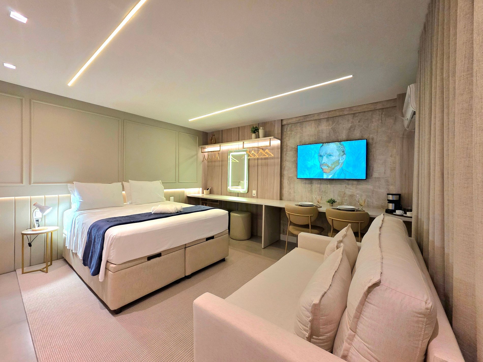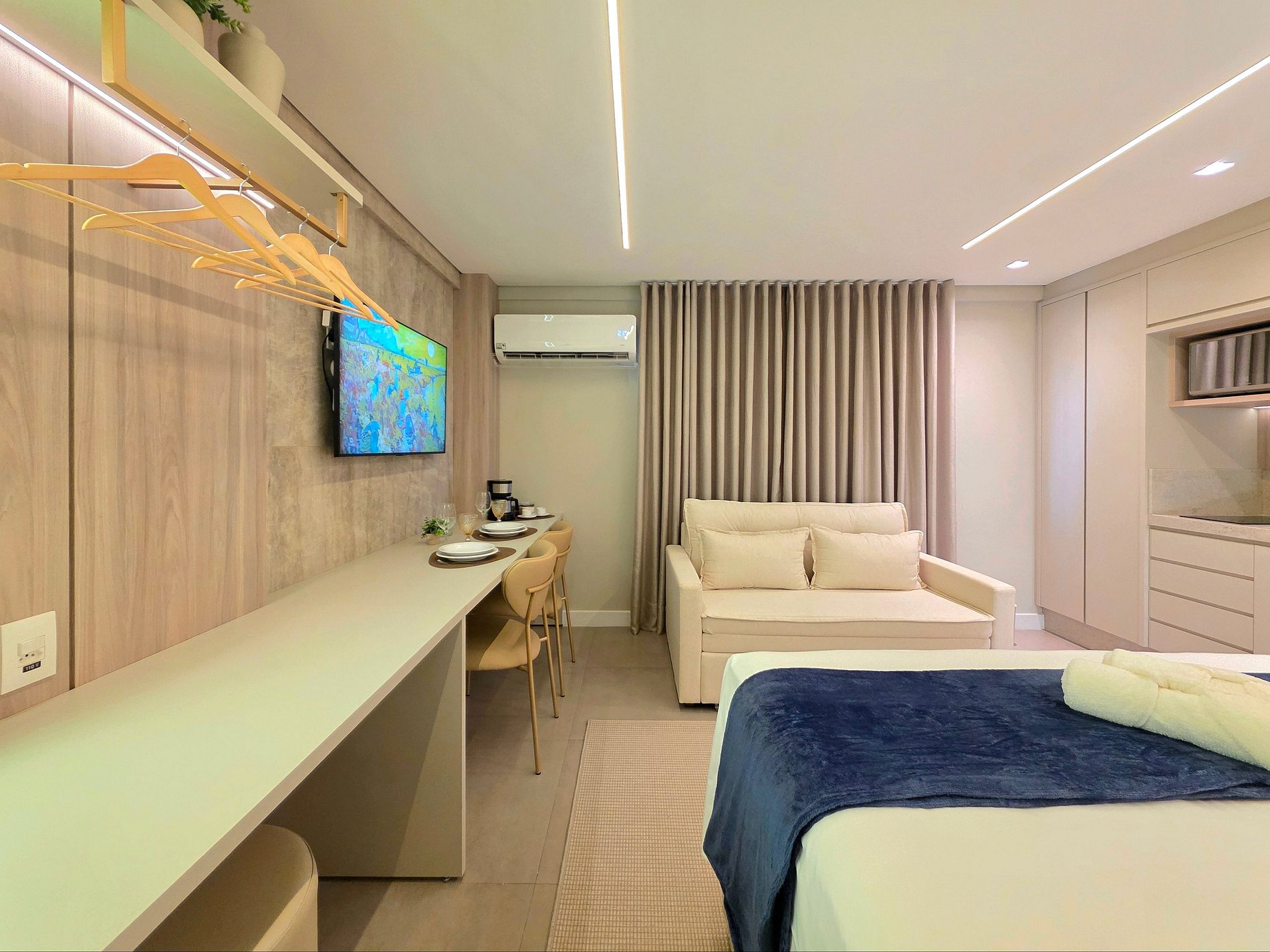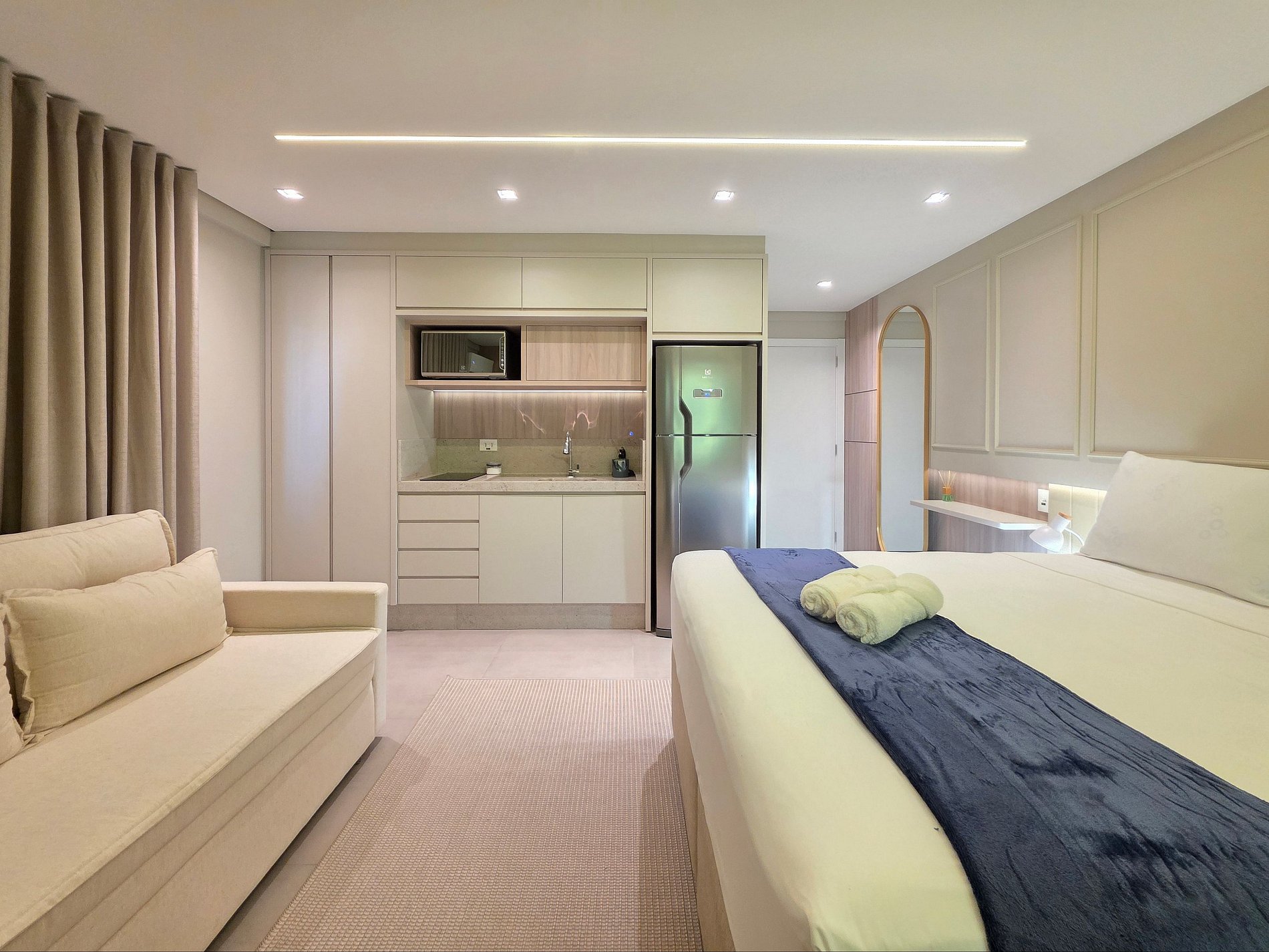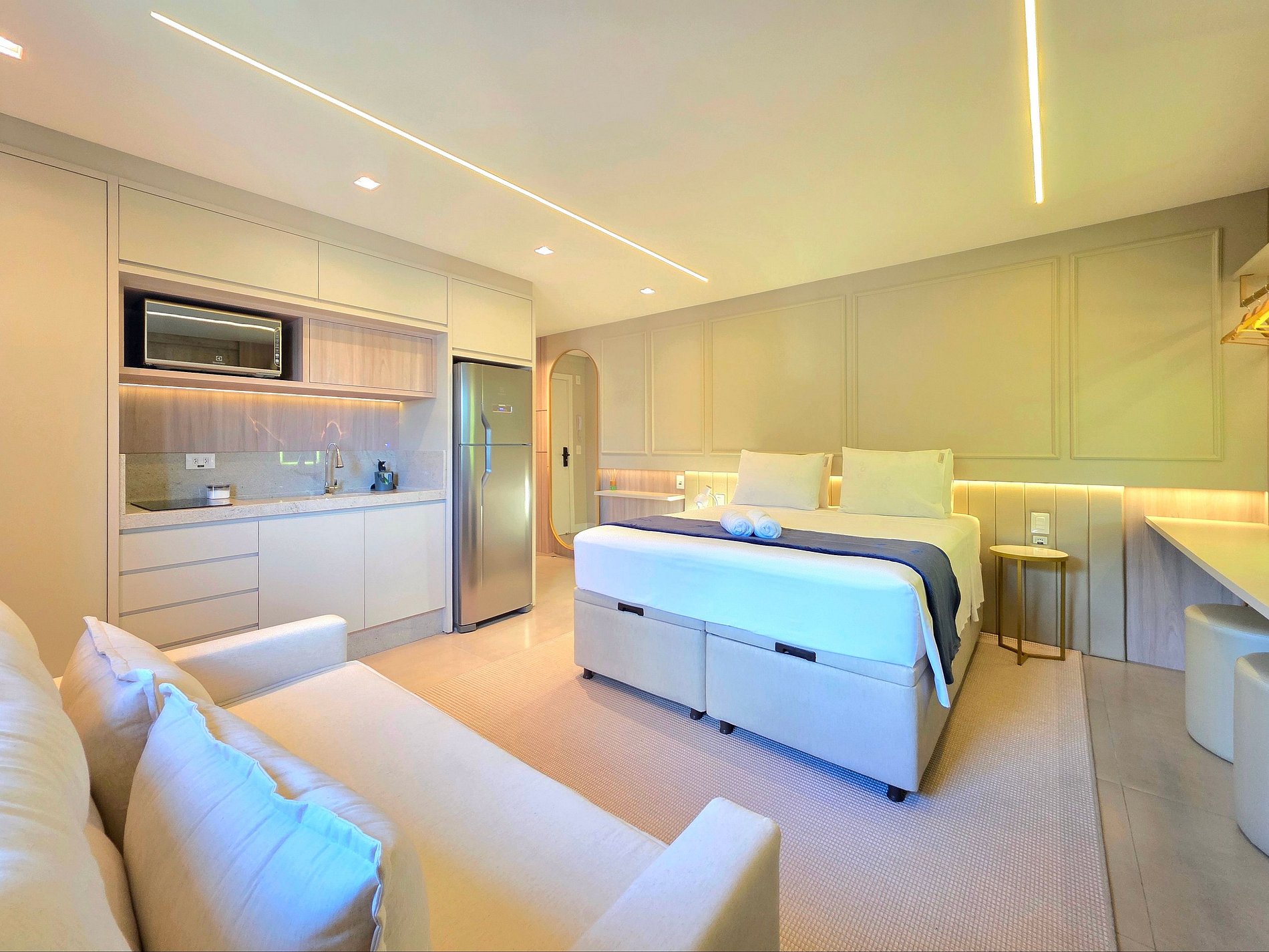 Apartamento Studio novíssimo de alto padrão, onde cada detalhe foi pensado para proporcionar conforto, charme e bem-estar. Finamente mobiliado, climatizado e envolto por uma atmosfera acolhedora, está a poucos passos da principal avenida gastronômica da cidade. Com elevador e vaga de garagem, oferece localização privilegiada, a 10–25 minutos dos principais atrativos. Anfitriões dedicados a proporcionar uma experiência impecável, com atenção a cada detalhe.