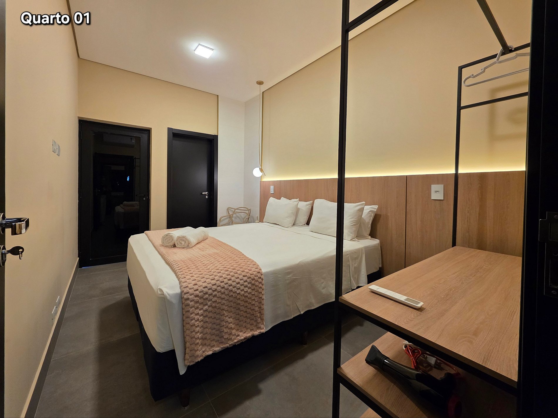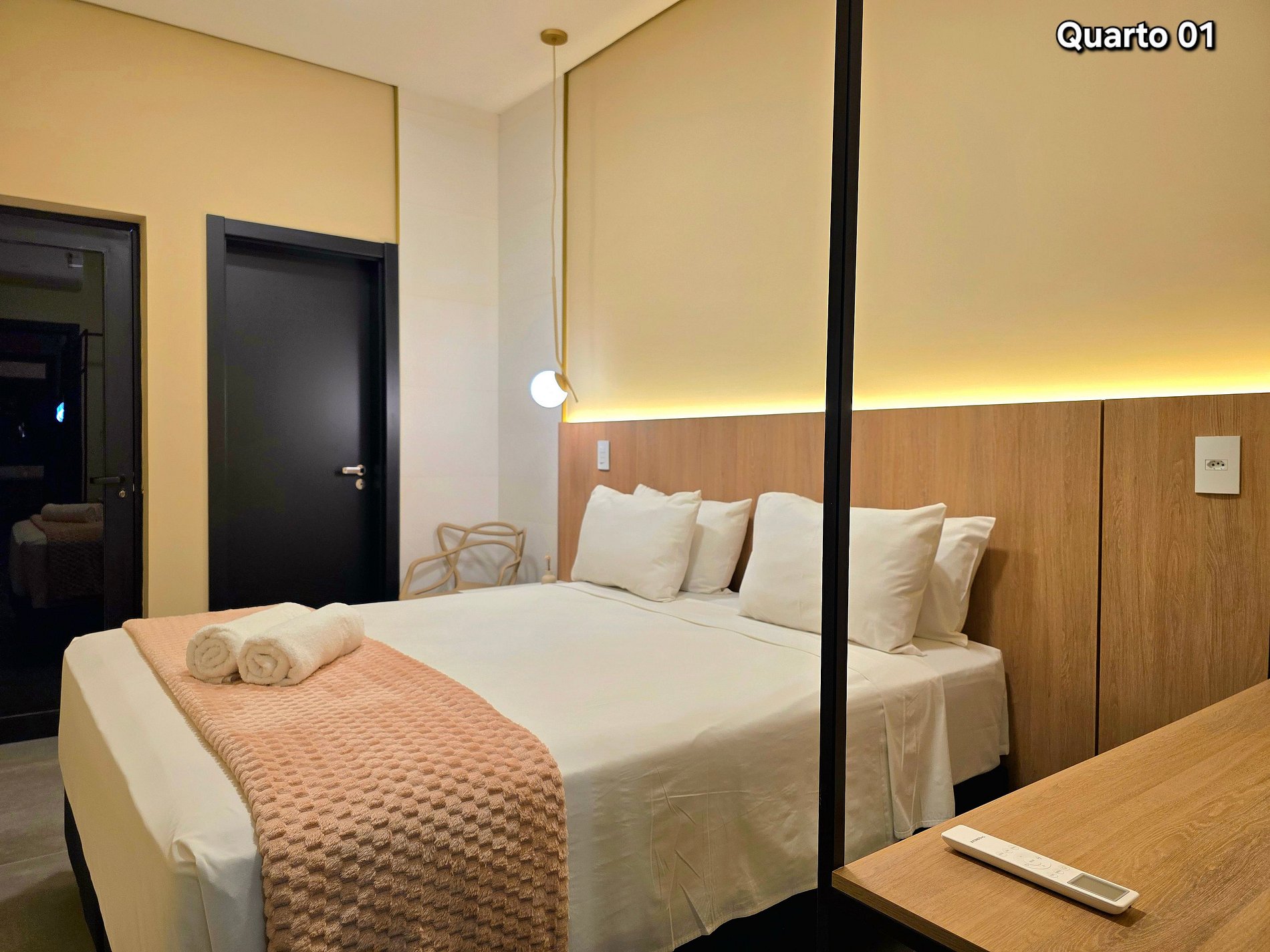 Quarto 01 (Suíte): 01 cama queensize (com banheiro e ar condicionado)
