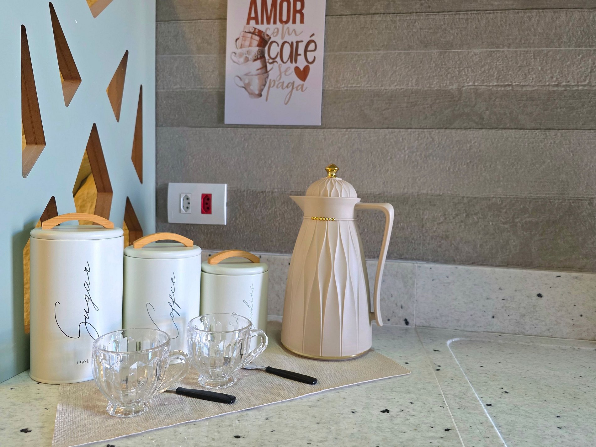 Cozinha completa com utensílios e louças para as refeições, fogão, microondas, sanduicheira, liquidificador.