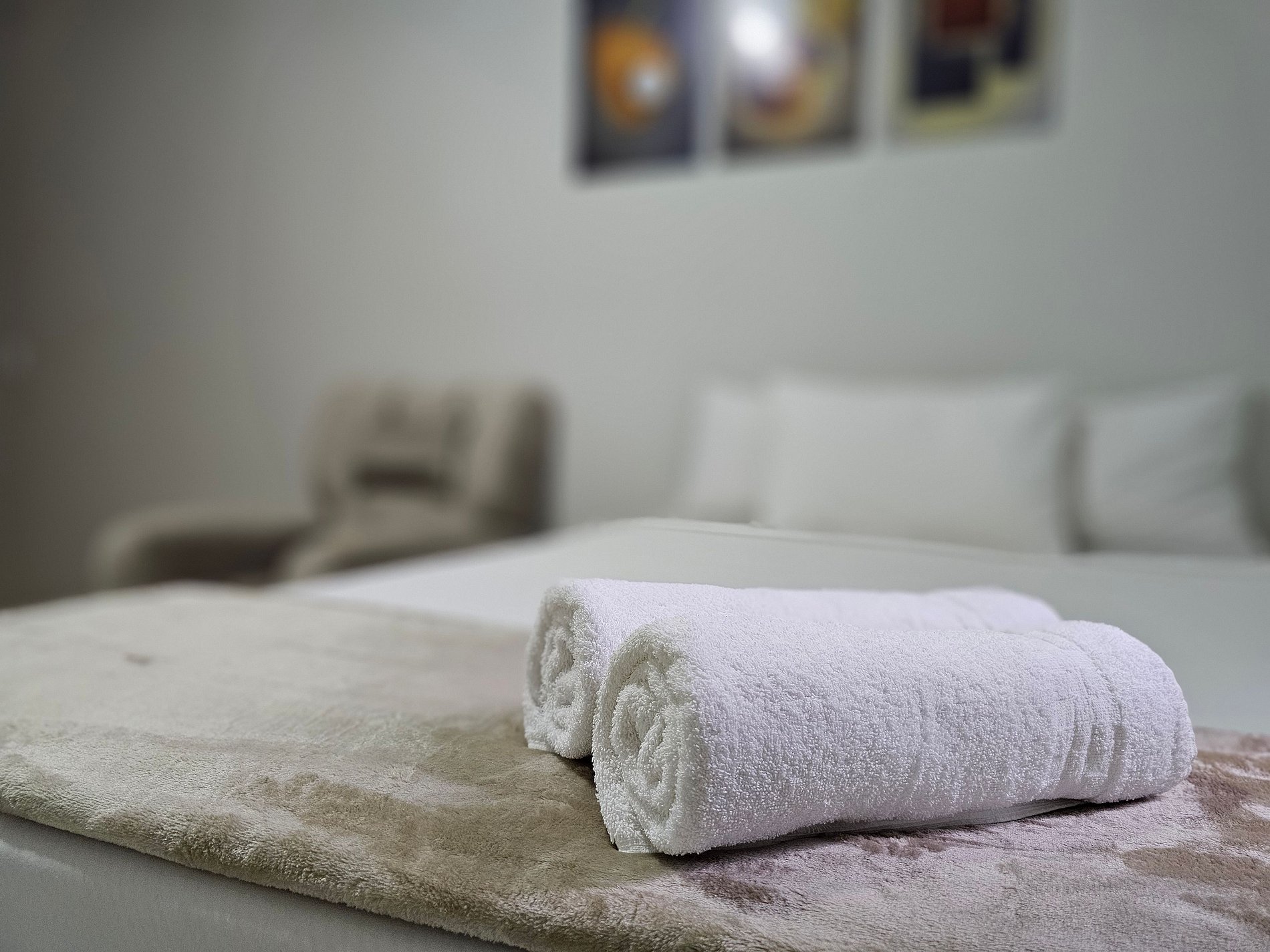 Toalhas de banho (01 por hospede, independente da quantidade de diárias) e 01 de rosto por banheiro