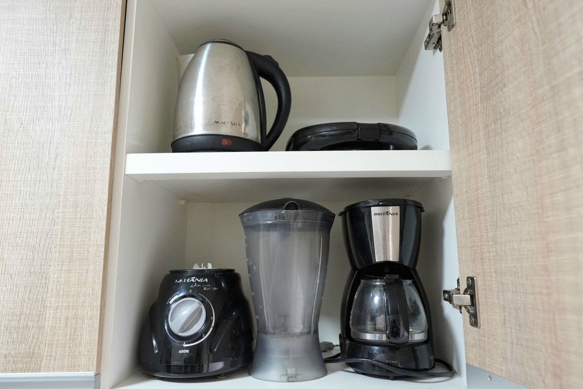 Cozinha completa com utensílios e louças para as refeições, microondas, sanduicheira, liquidificador, cafeteira elétrica e chaleira elétrica.