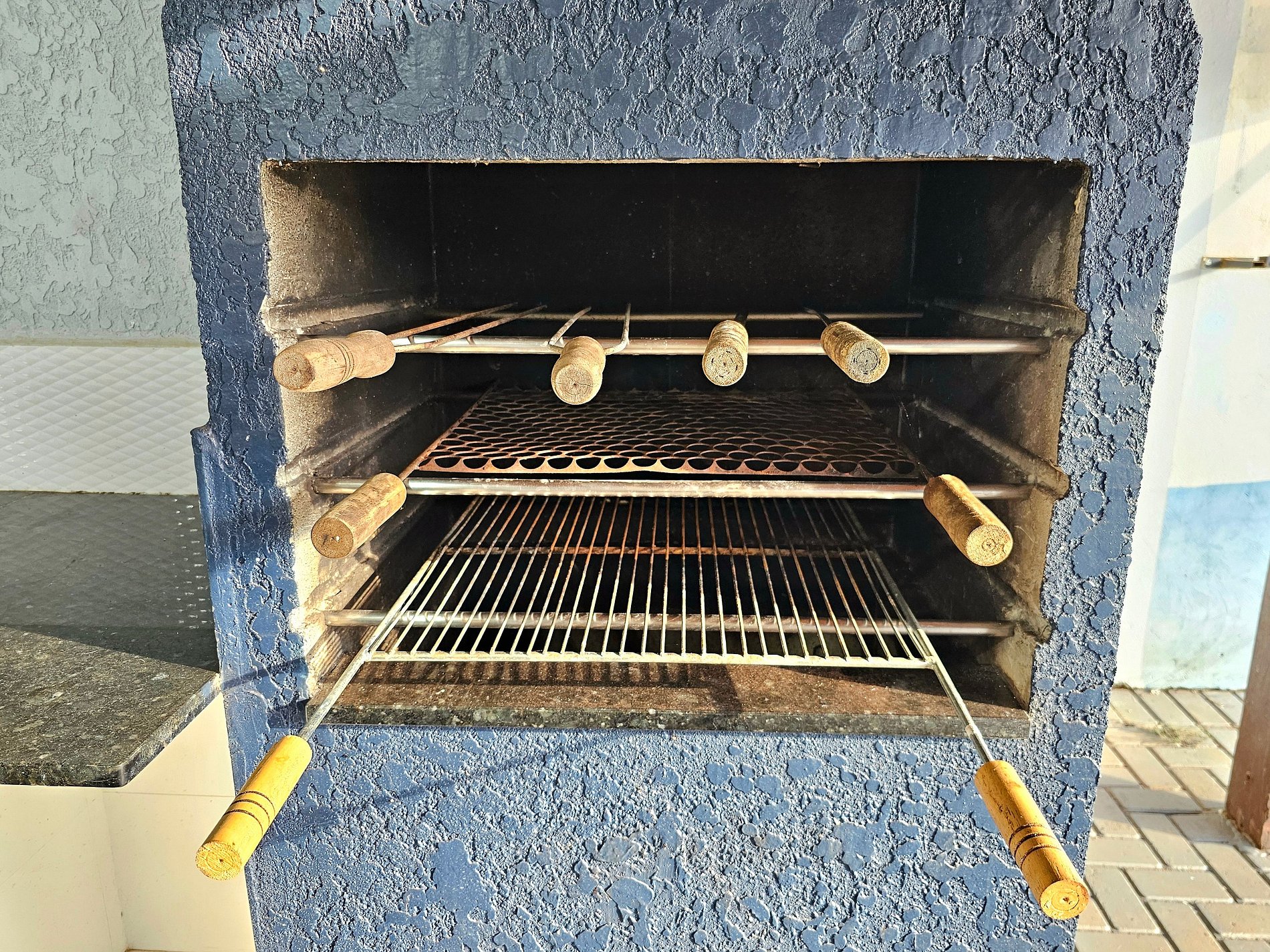 Churrasqueira com grelha e espetos.