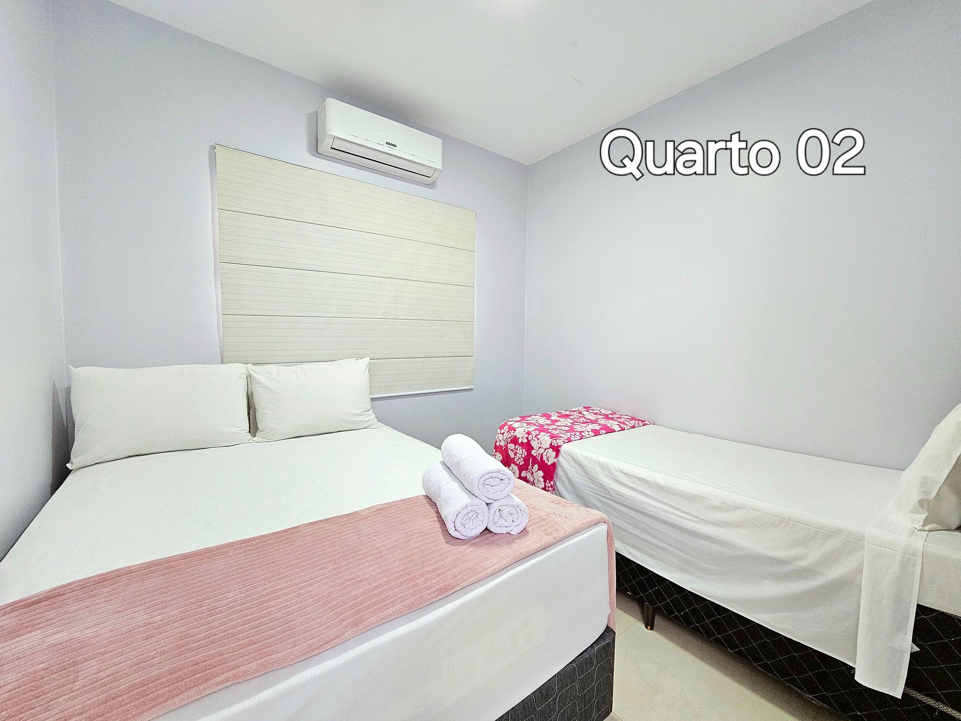 Quarto 02: 01 cama de casal + 01 de solteiro, ar condicionado.
