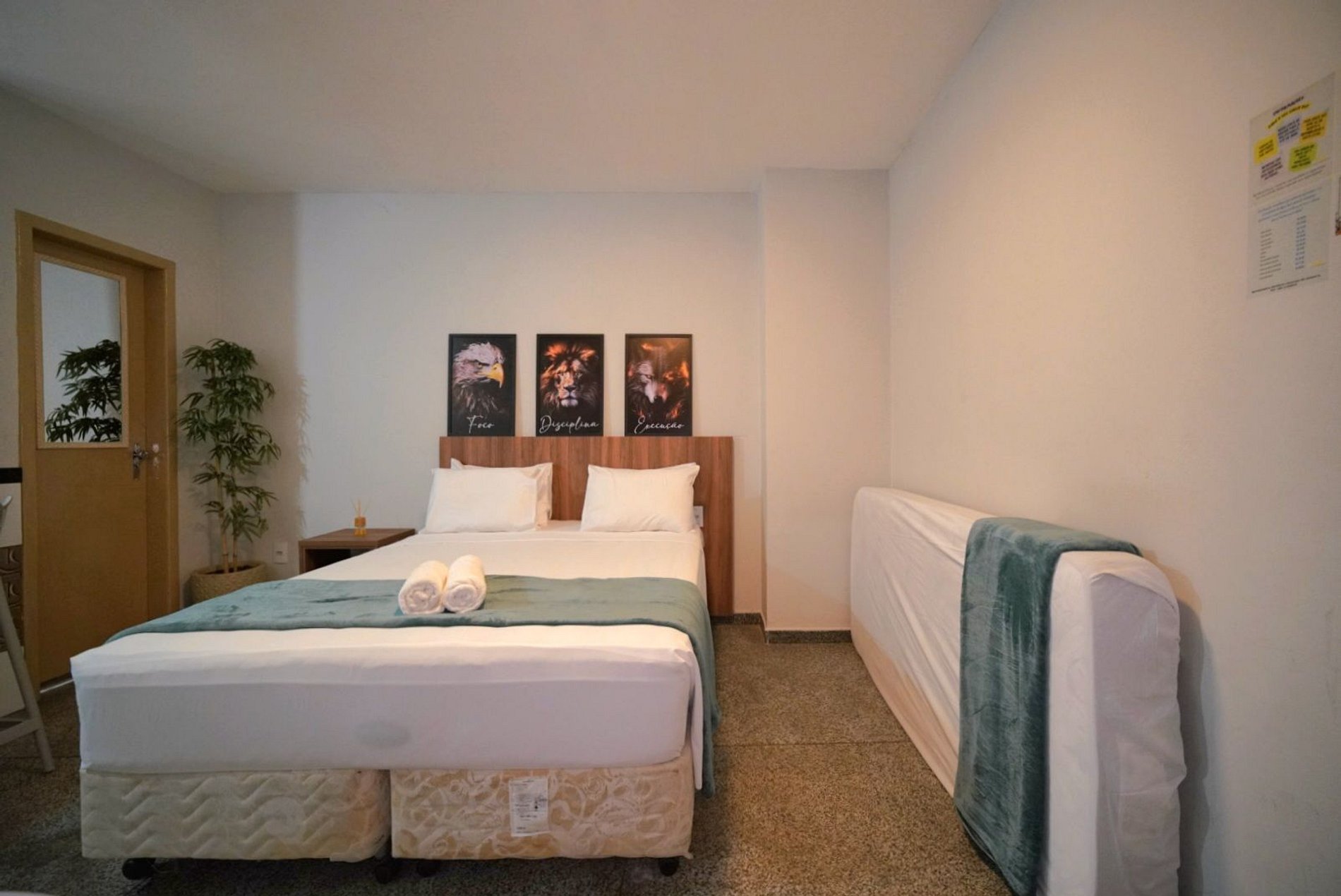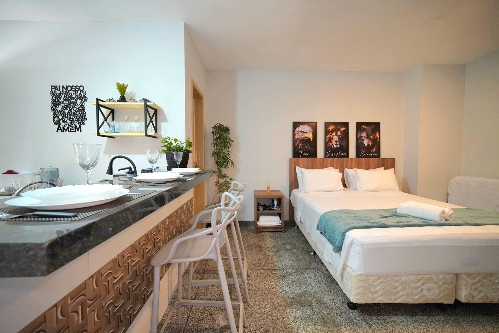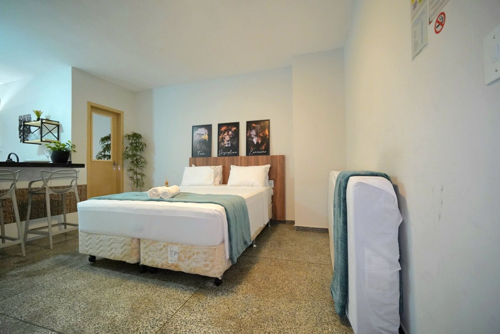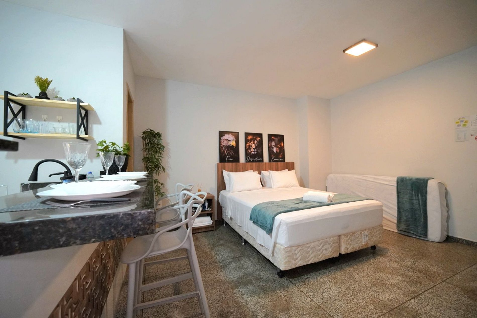 Studio: 01 cama queensize + 01 cama solteiro com ar condicionado + cozinha + banheiro (ambiente integrado)