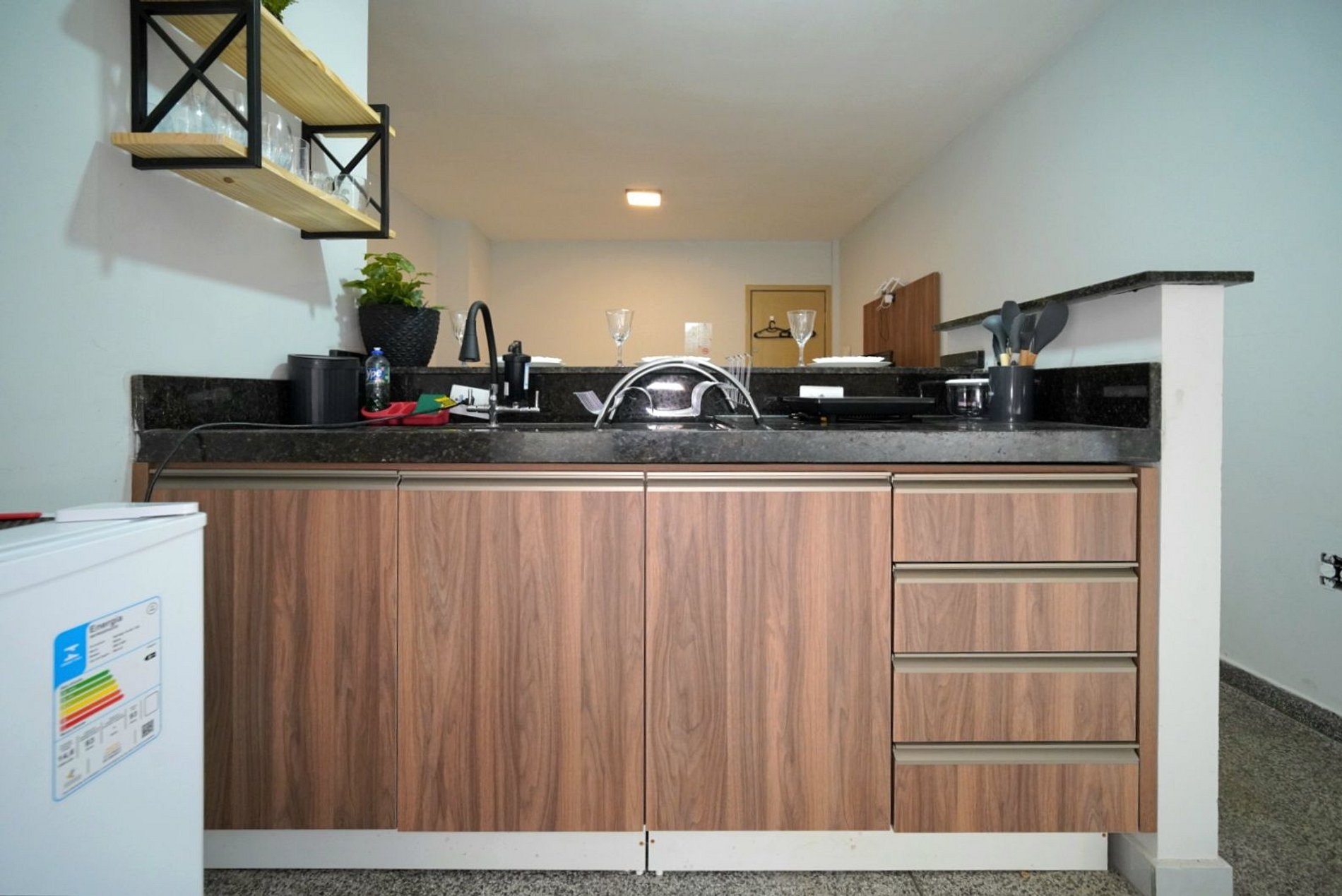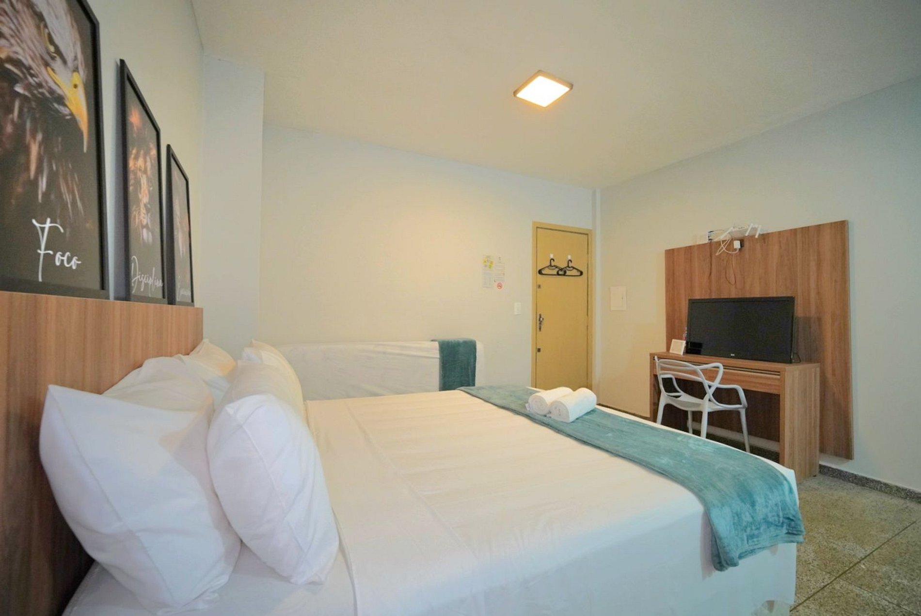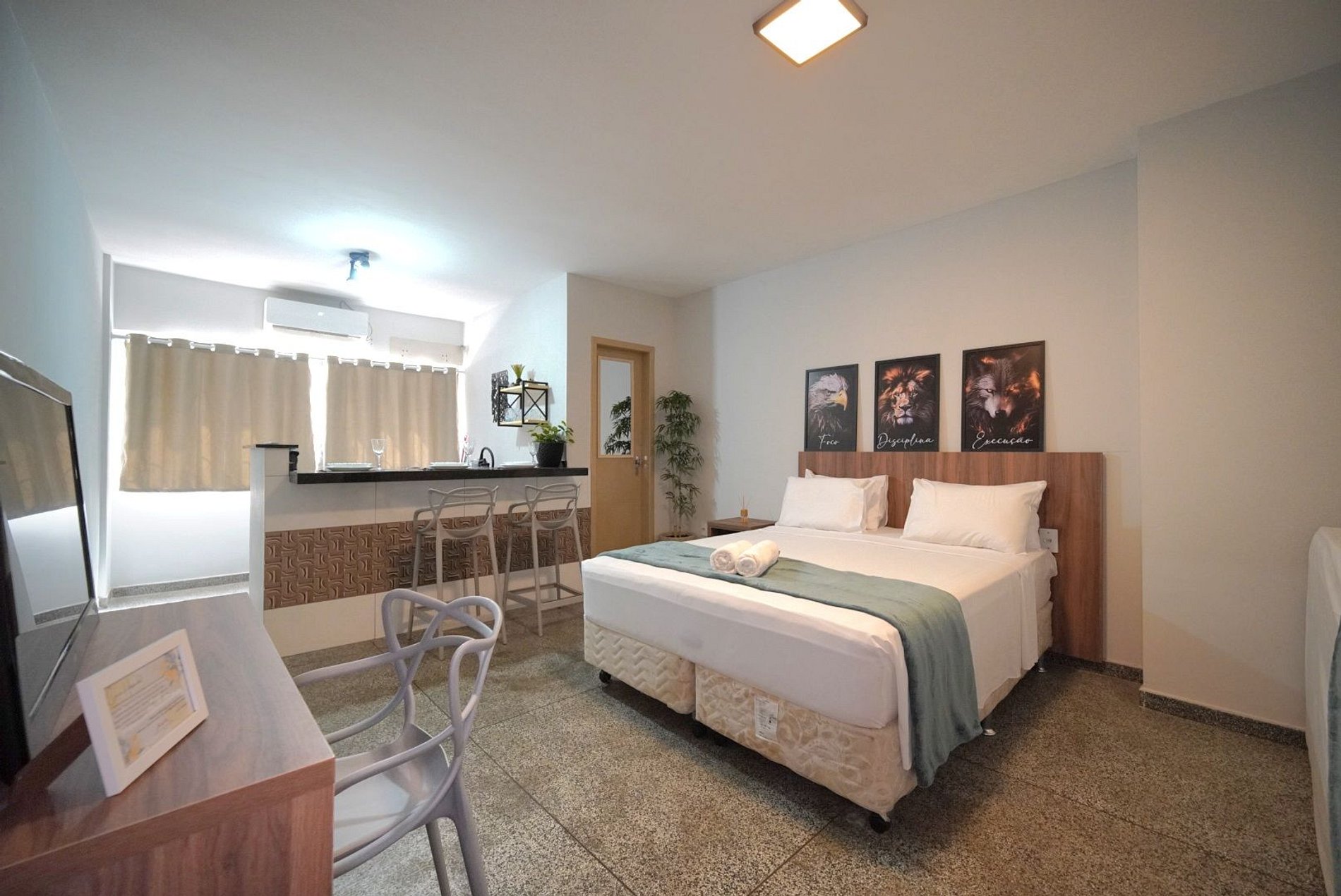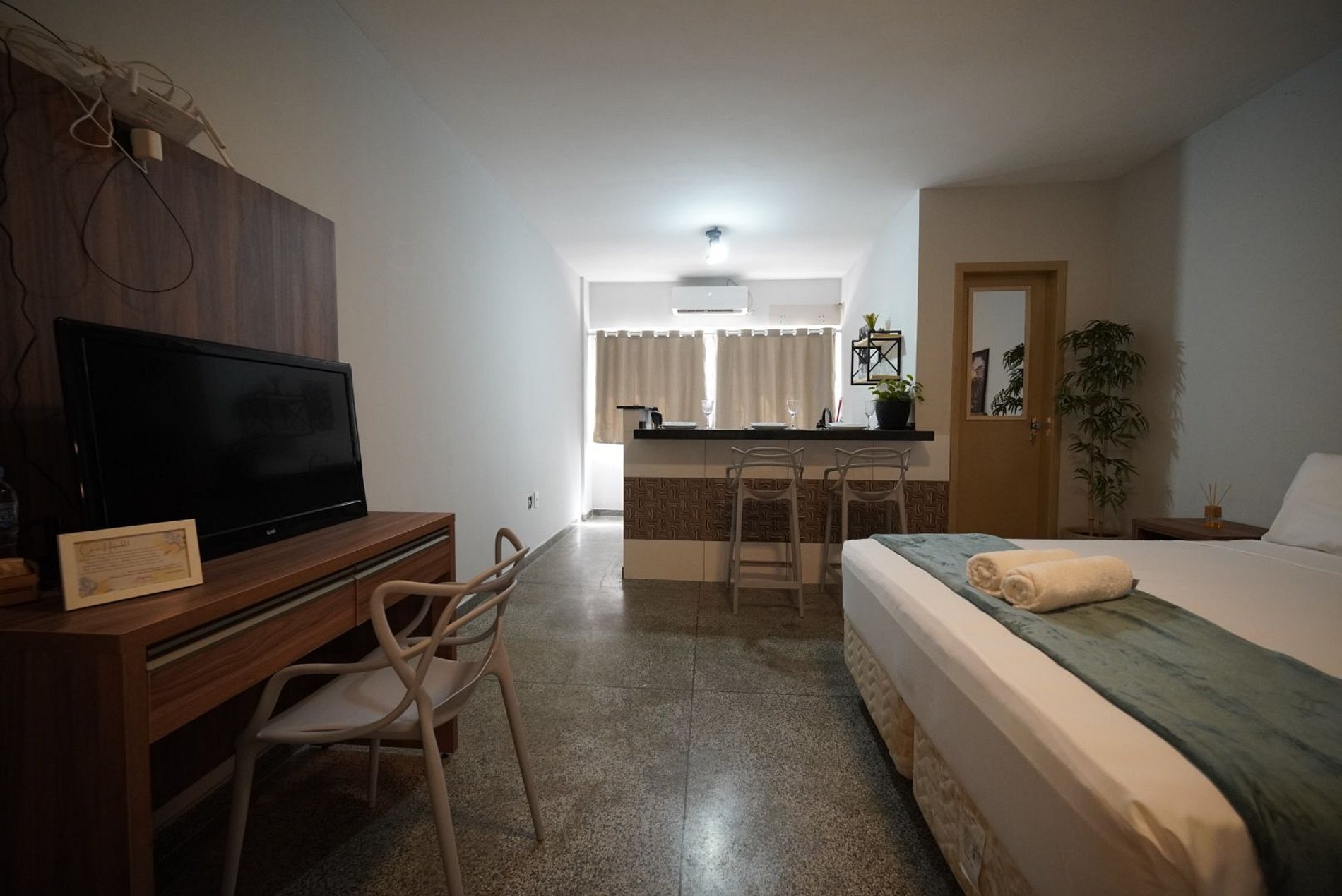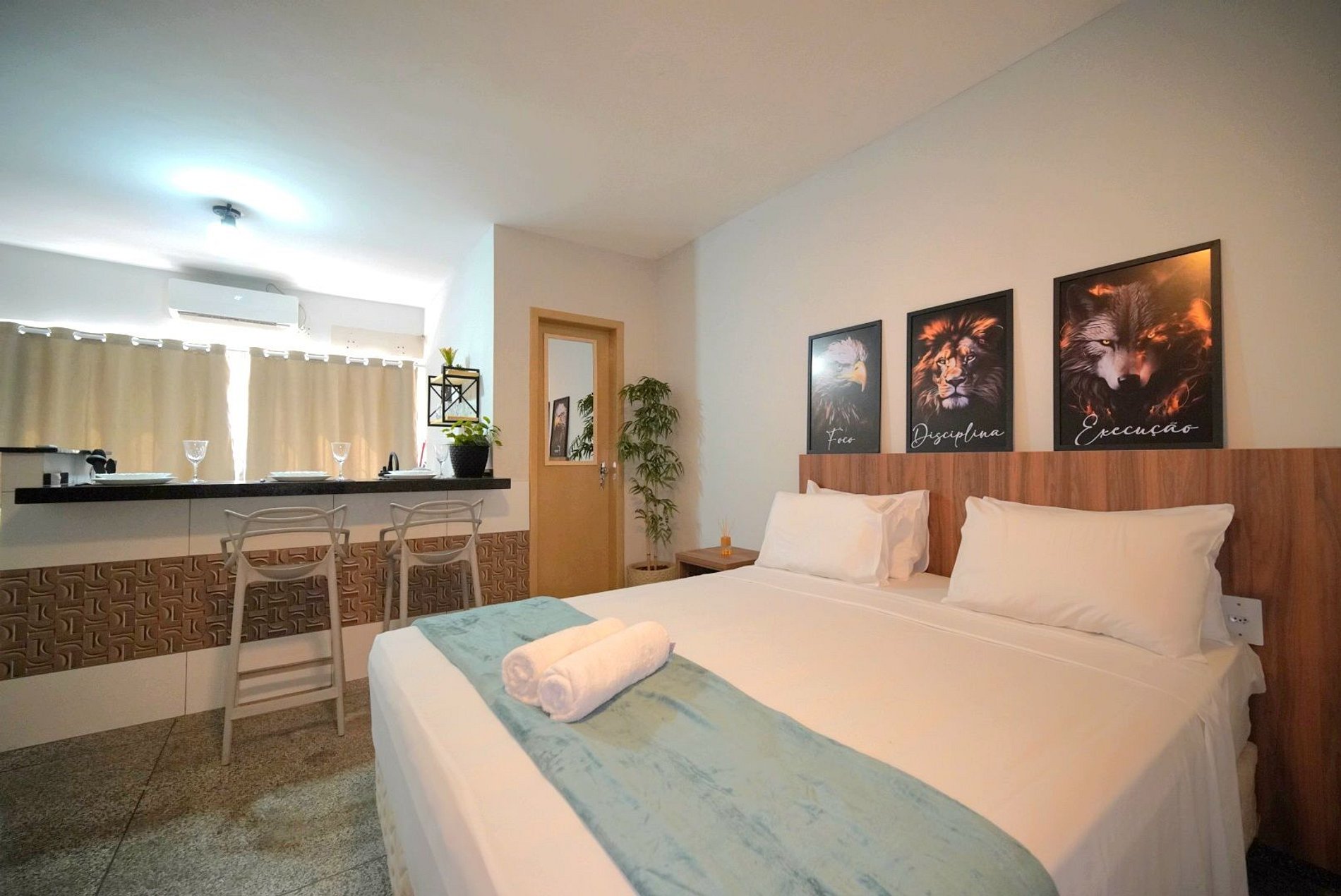Studio: 01 cama queensize + 01 cama solteiro com ar condicionado + cozinha + banheiro (ambiente integrado)