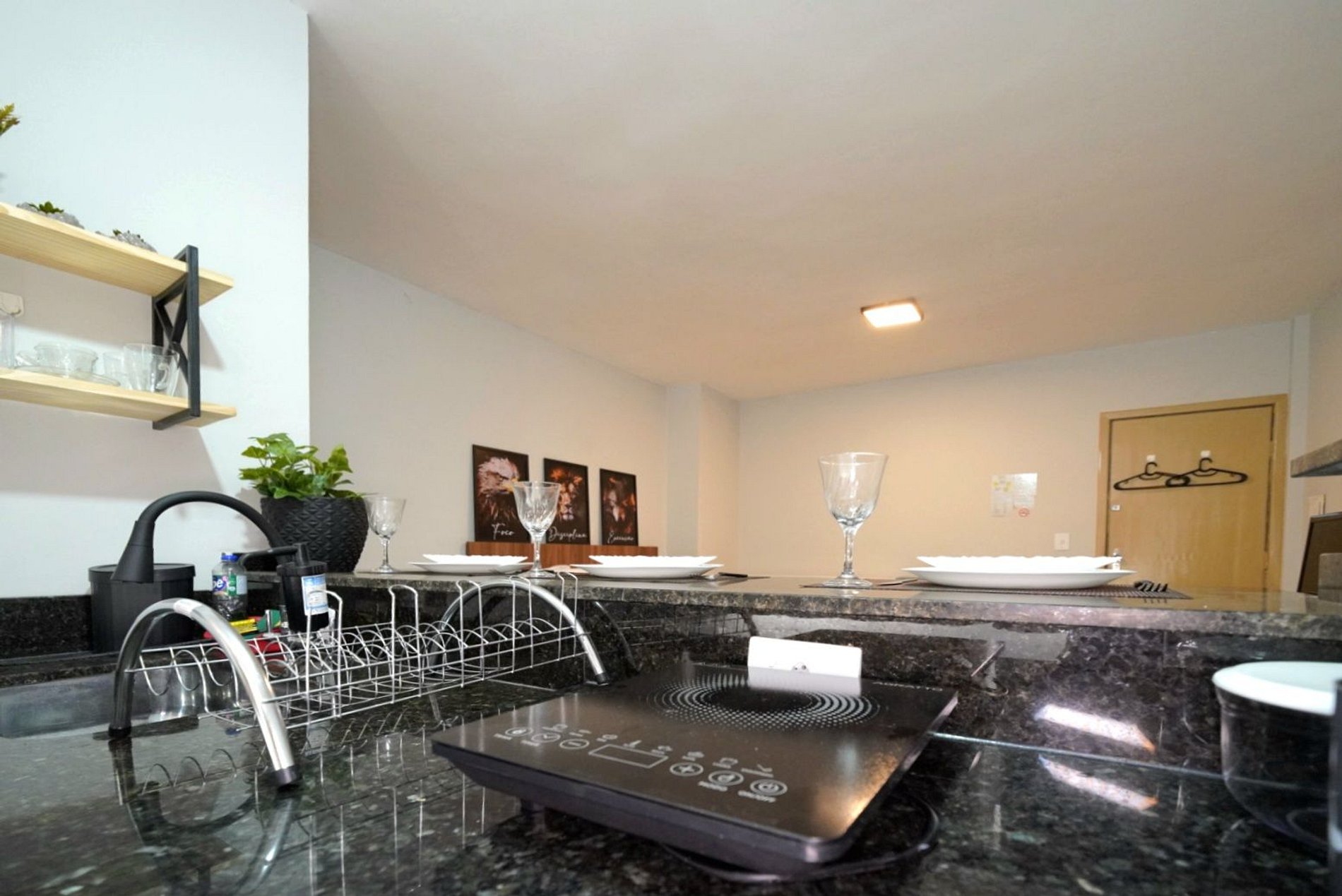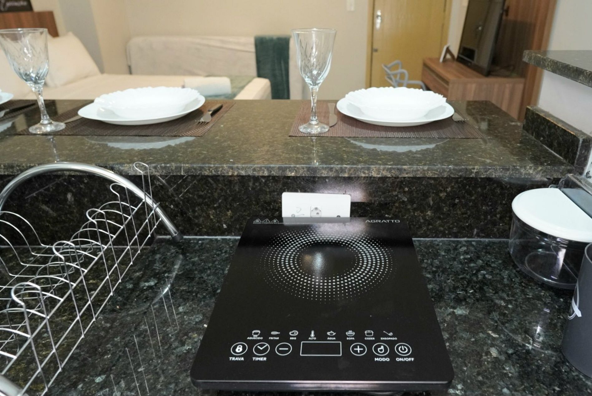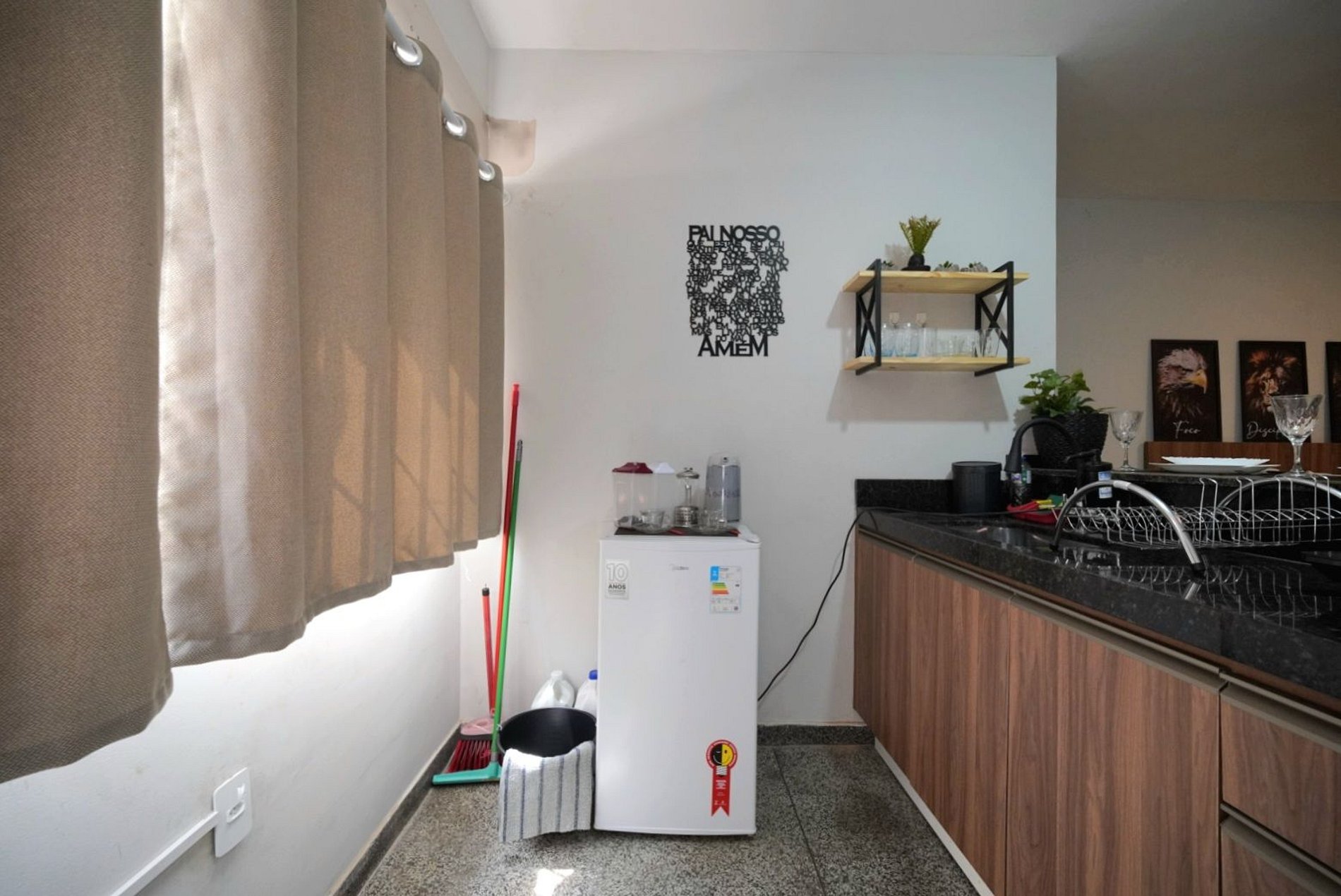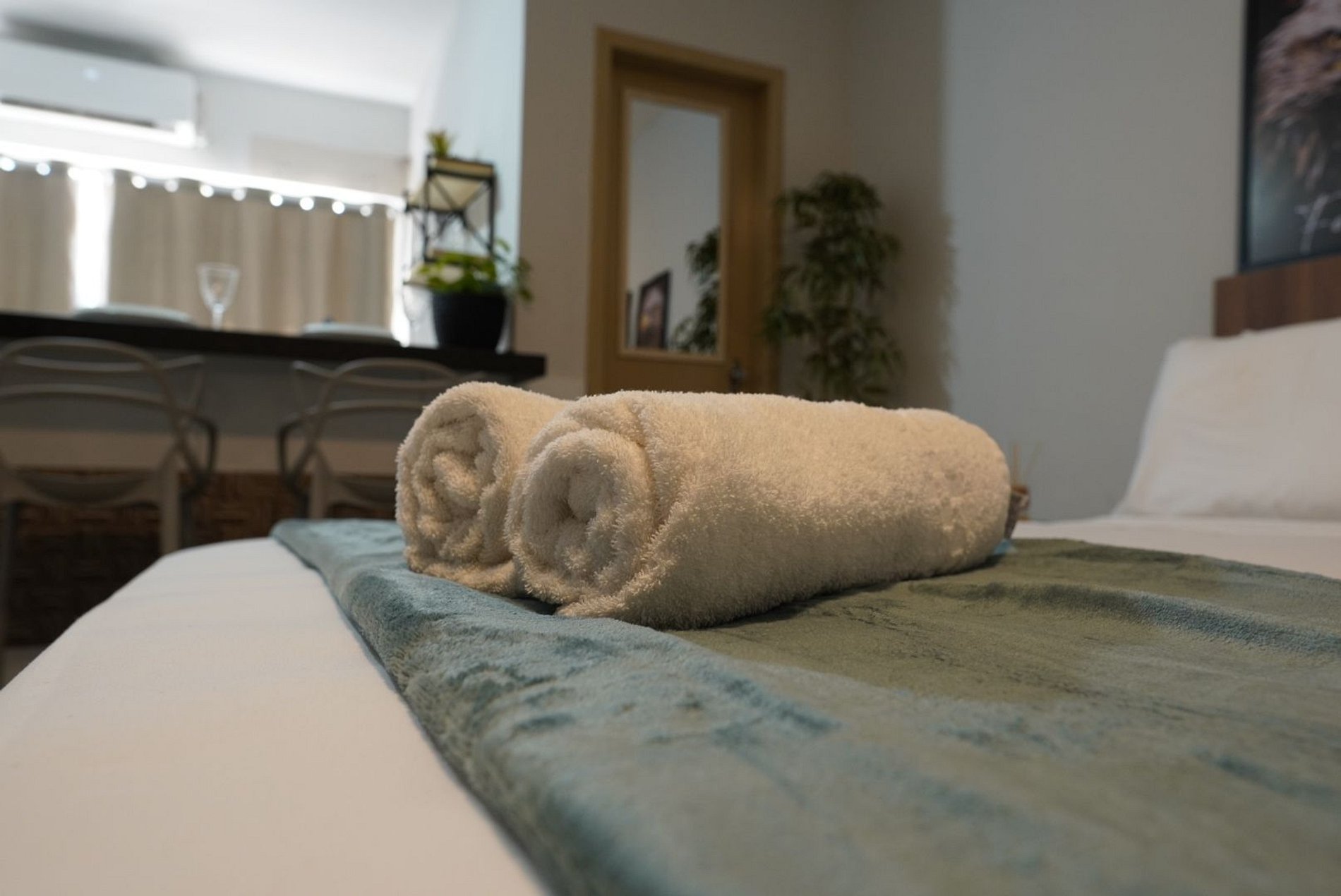 Studio: 01 cama queensize + 01 cama solteiro com ar condicionado + cozinha + banheiro (ambiente integrado)