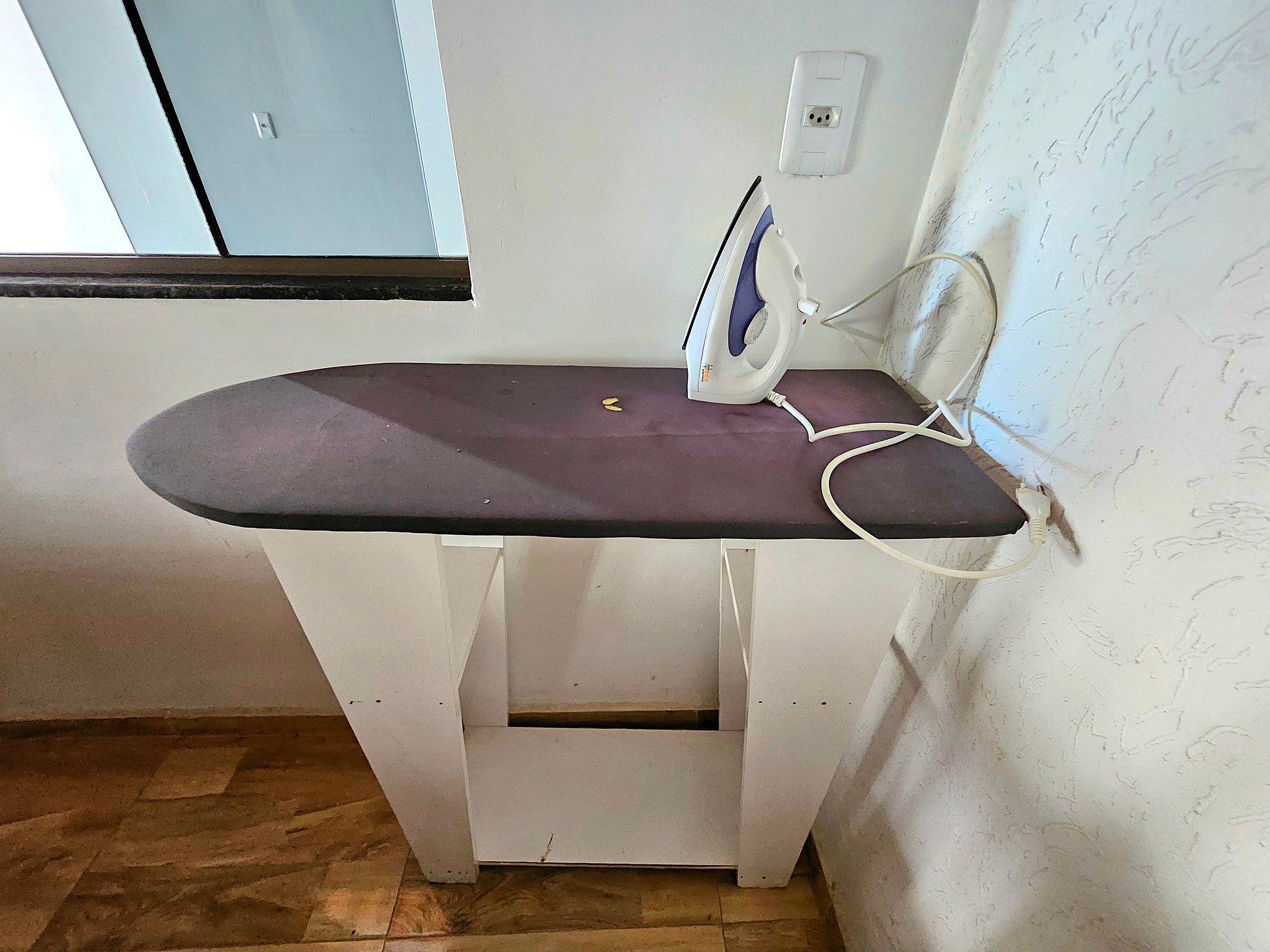 Ferro de passar com mesa de apoio.
