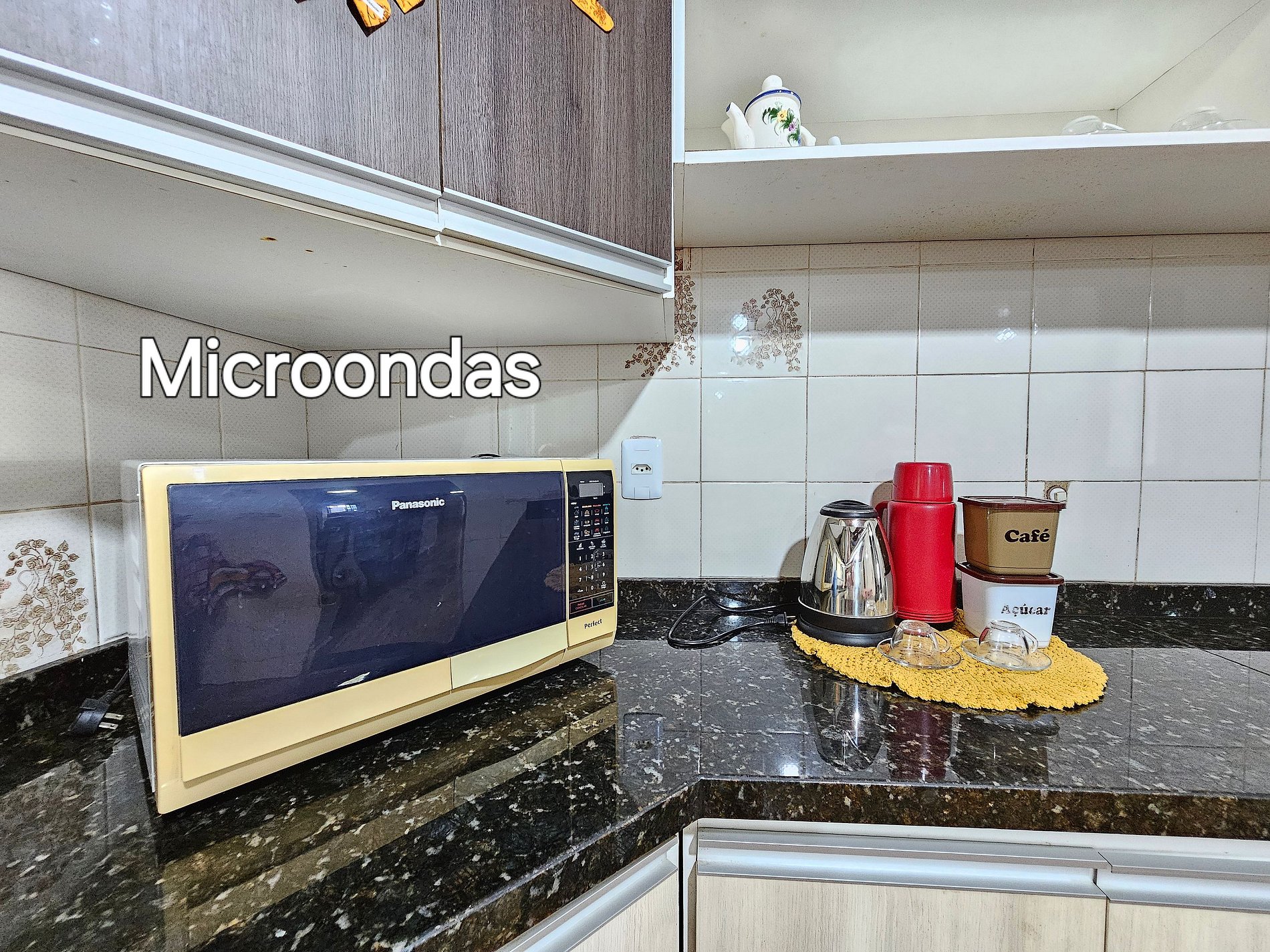 Cozinha completa com utensílios e louças para as refeições, fogão, microondas, sanduicheira, liquidificador.