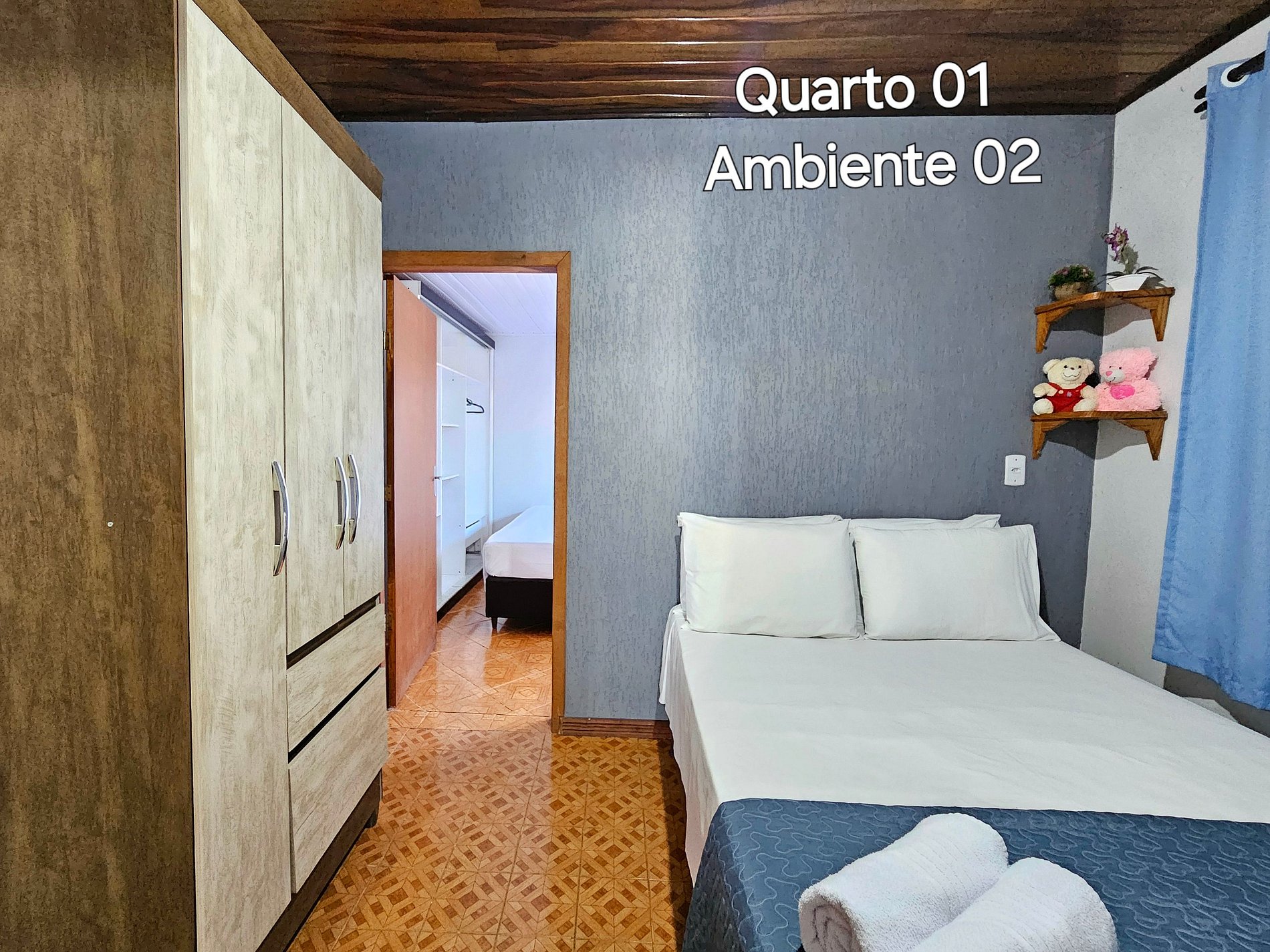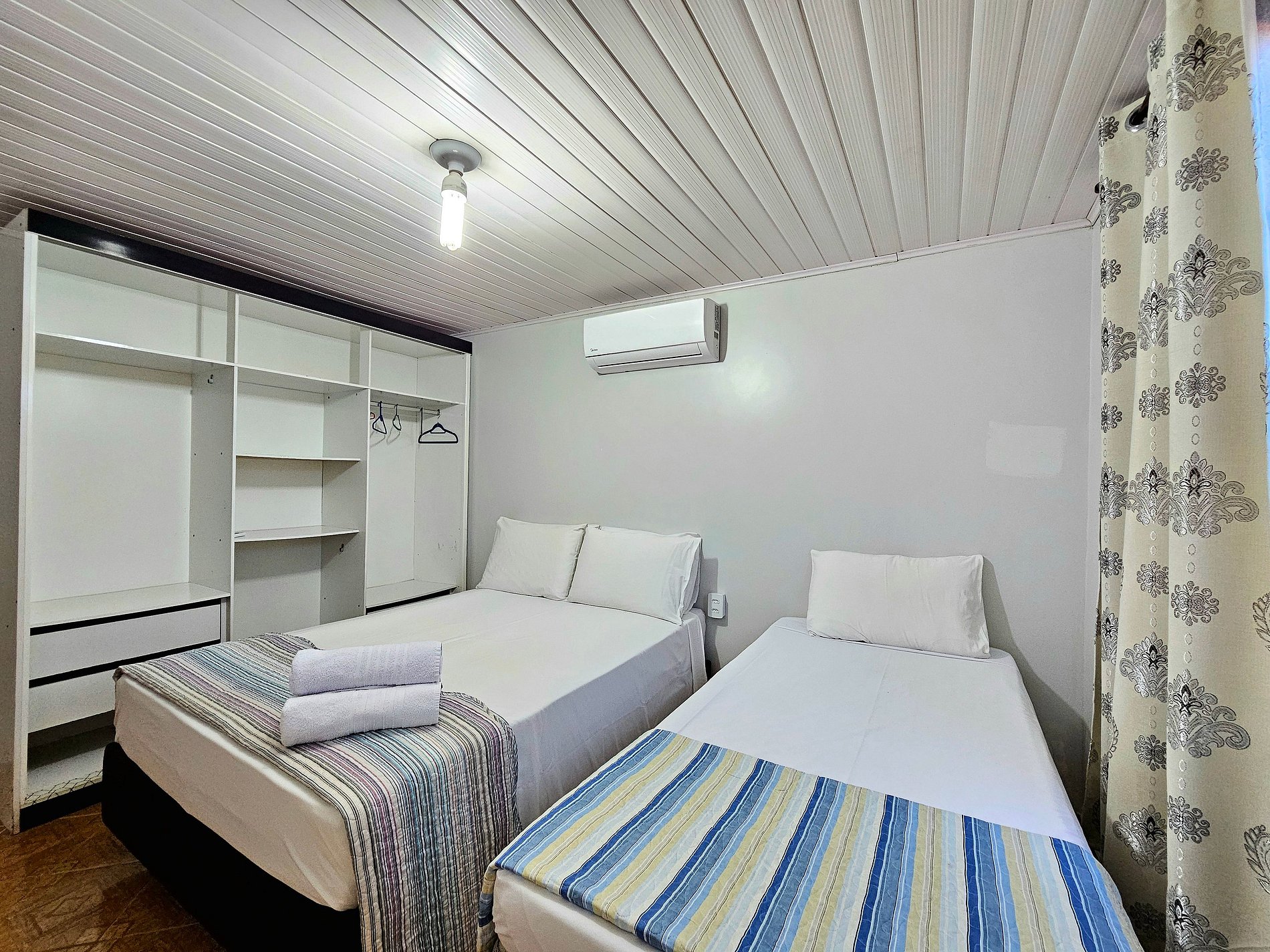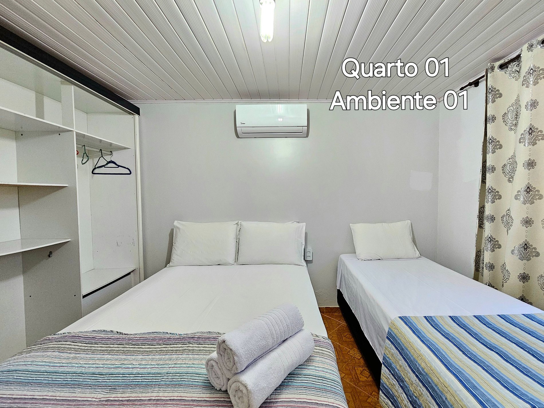 Quarto 01: 02 Ambientes - cada um com ar condicionado - Ambiente 1 (1 cama de casal + 1 de solteiro), Ambiente 2 (1 cama de casal).
