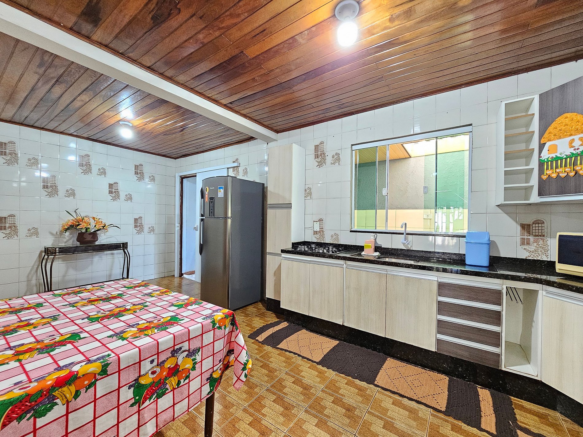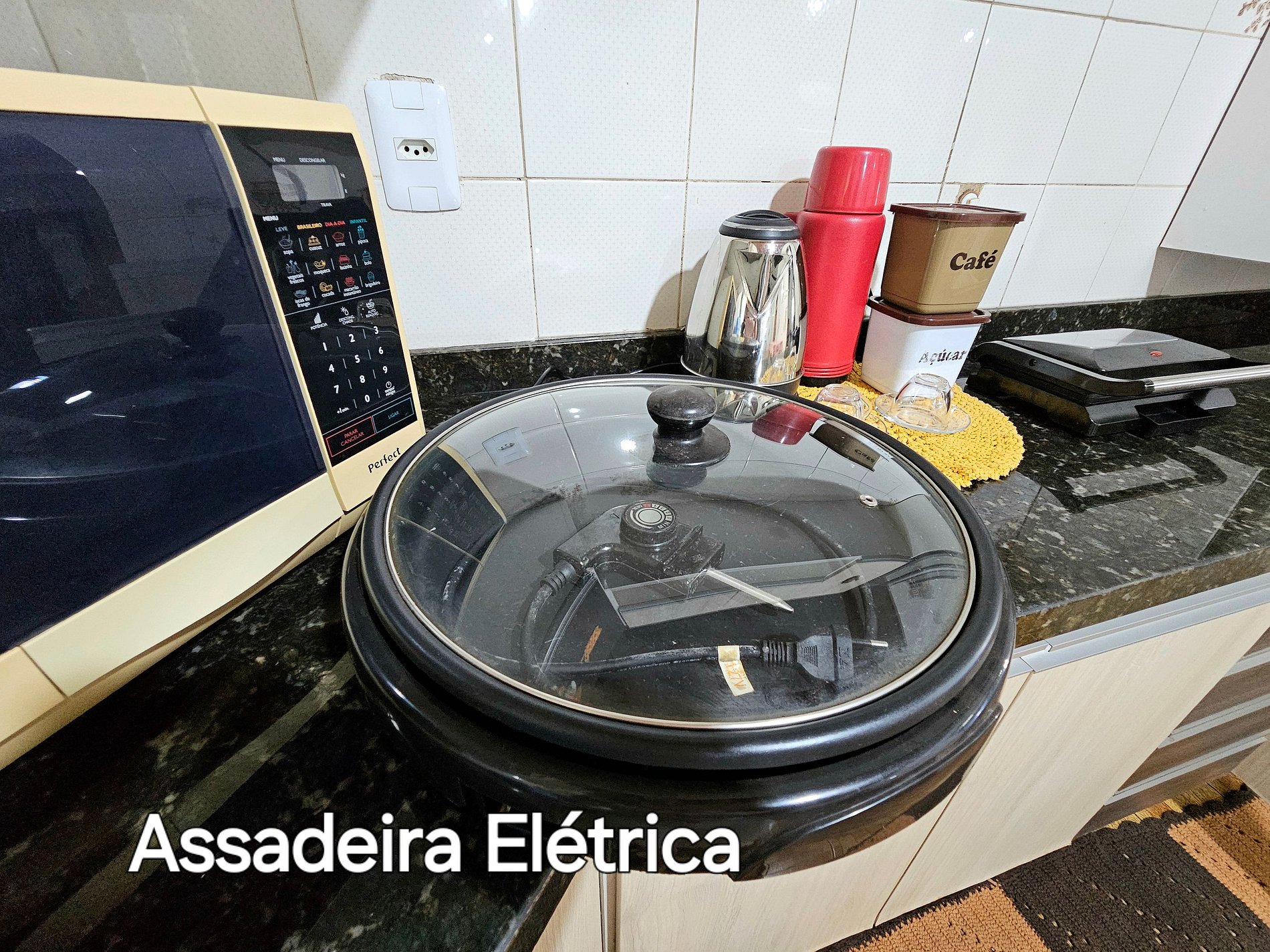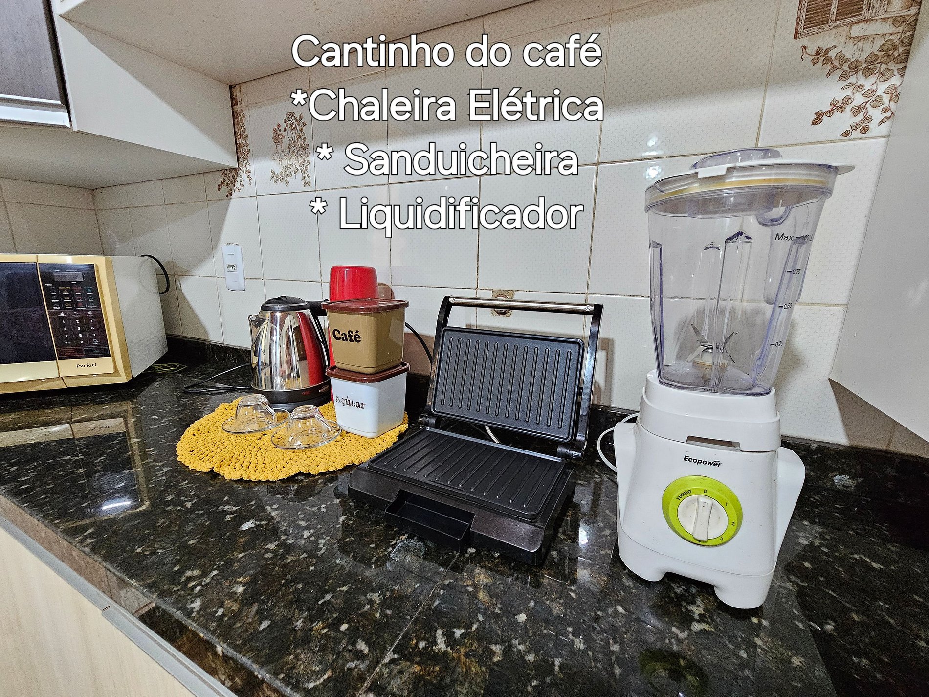 Cozinha completa com utensílios e louças para as refeições, fogão, microondas, sanduicheira, liquidificador.