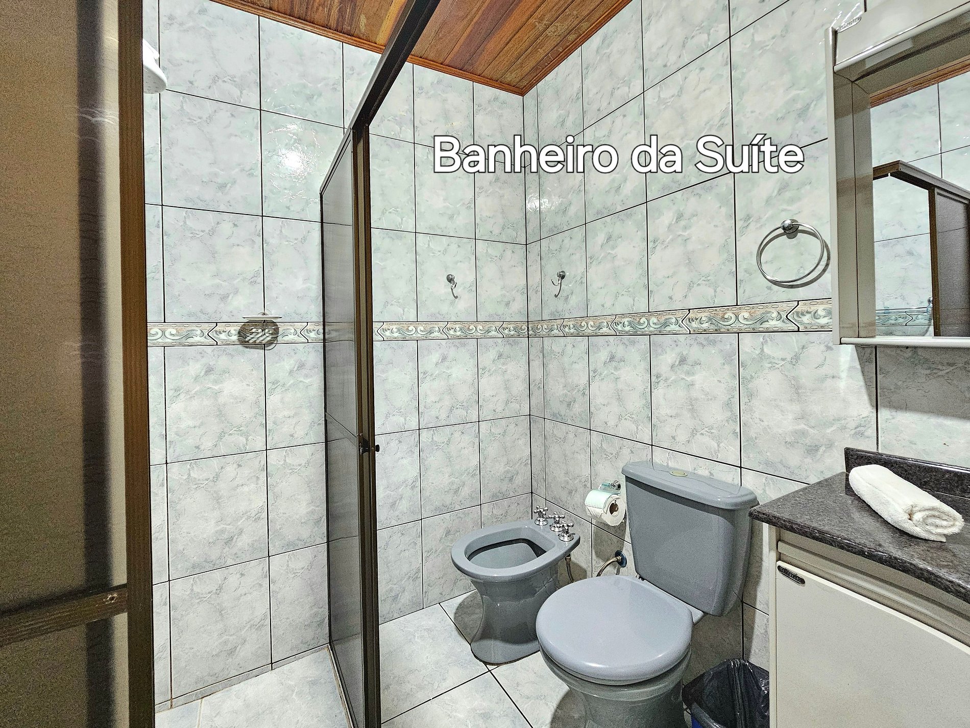 02 banheiros completos (com o da suíte) + 01 banheiro na churrasqueira - sem chuveiro)