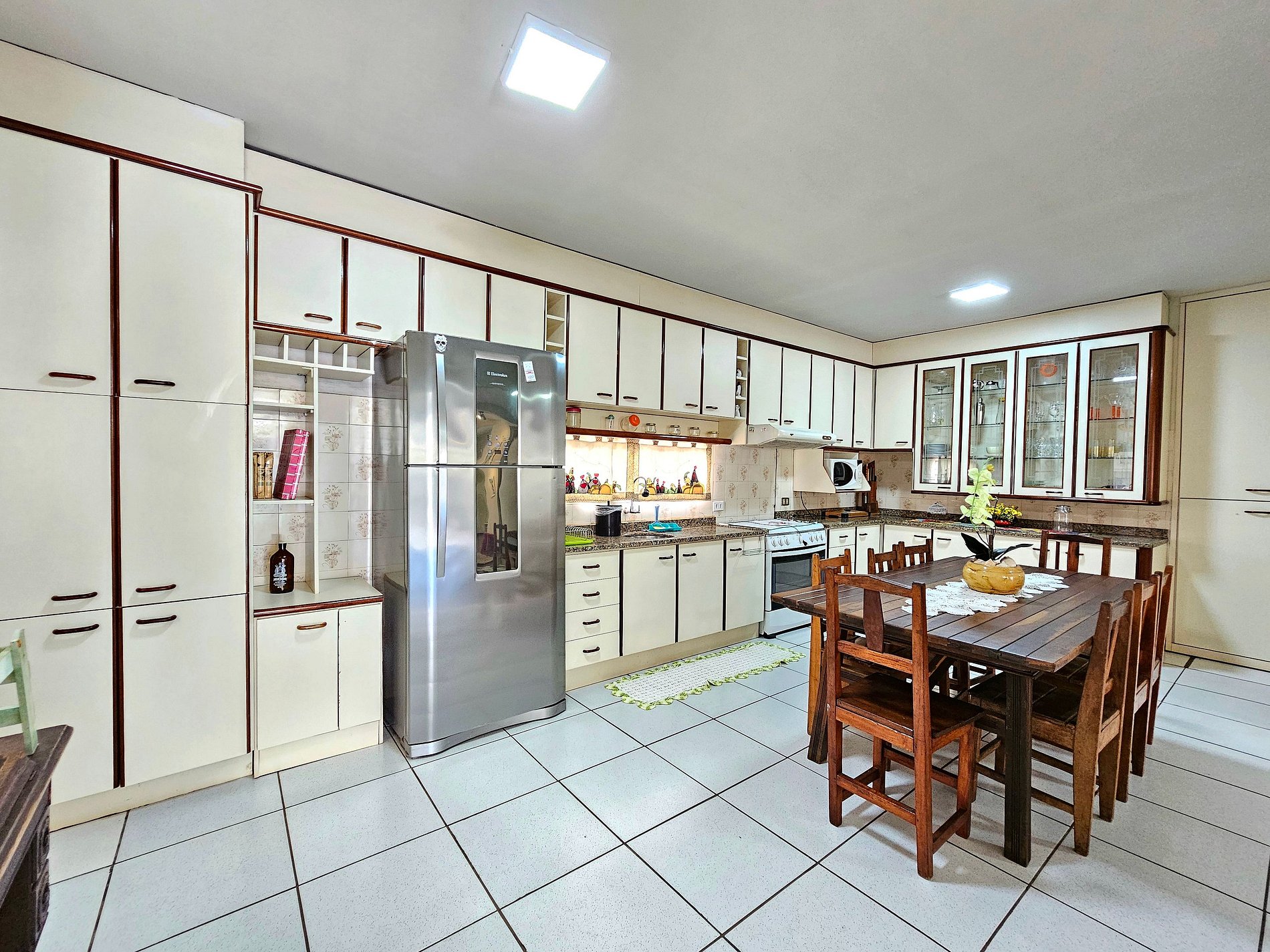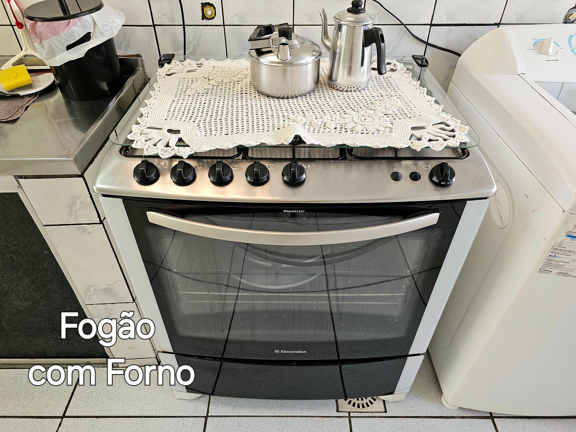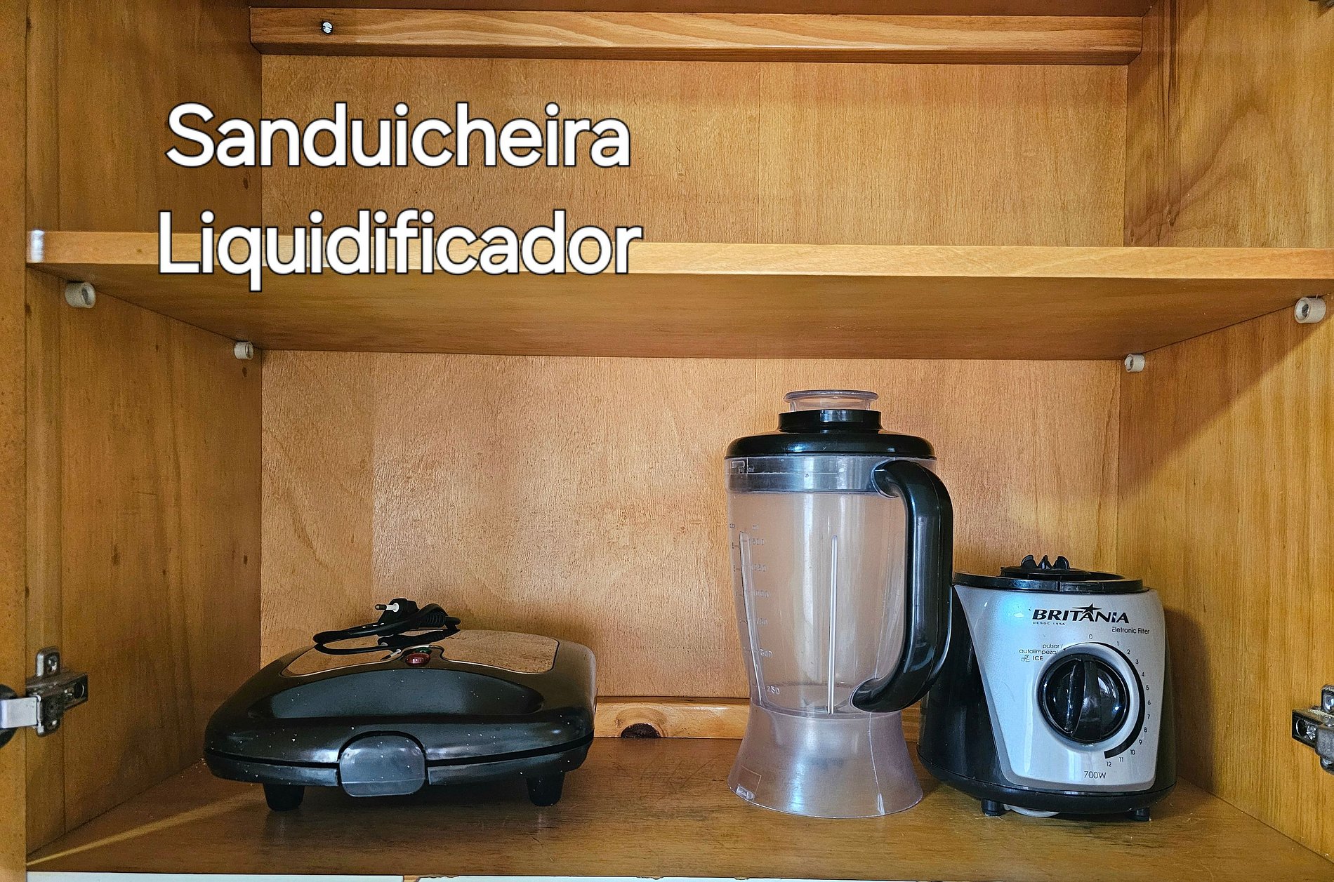 Cozinha completa com utensílios e louças para as refeições, microondas, forno, liquidificador.