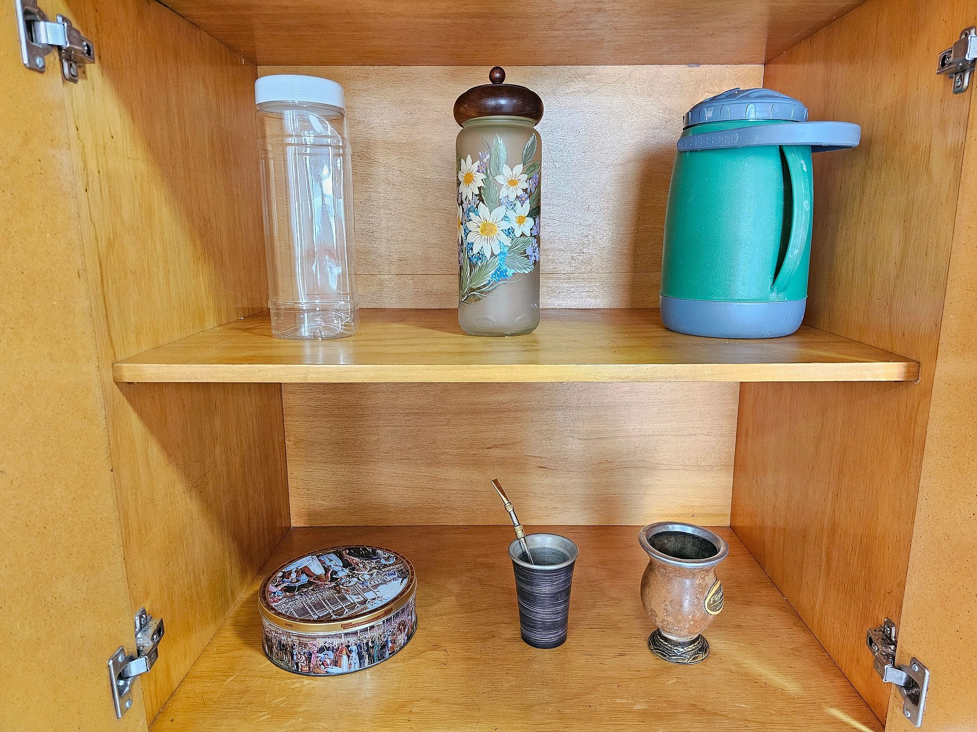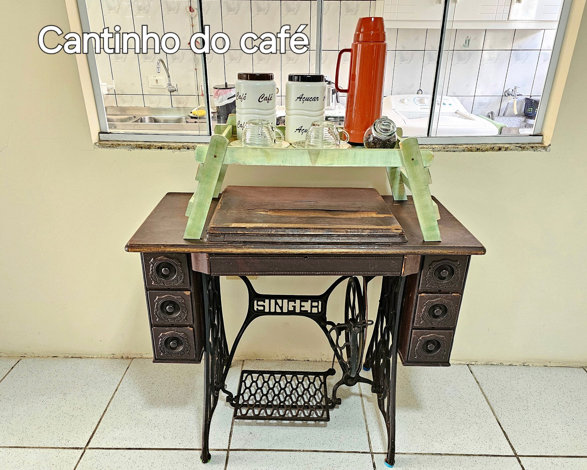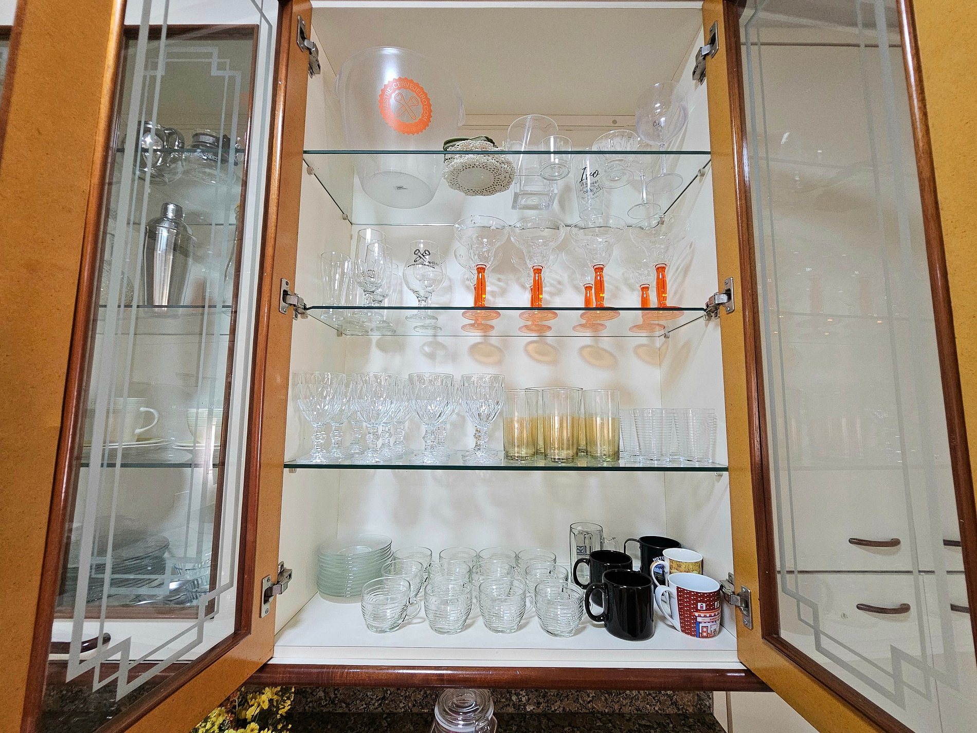 Cozinha completa com utensílios e louças para as refeições, microondas, forno, liquidificador.