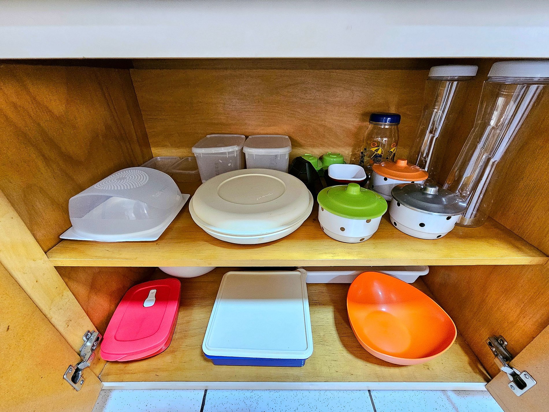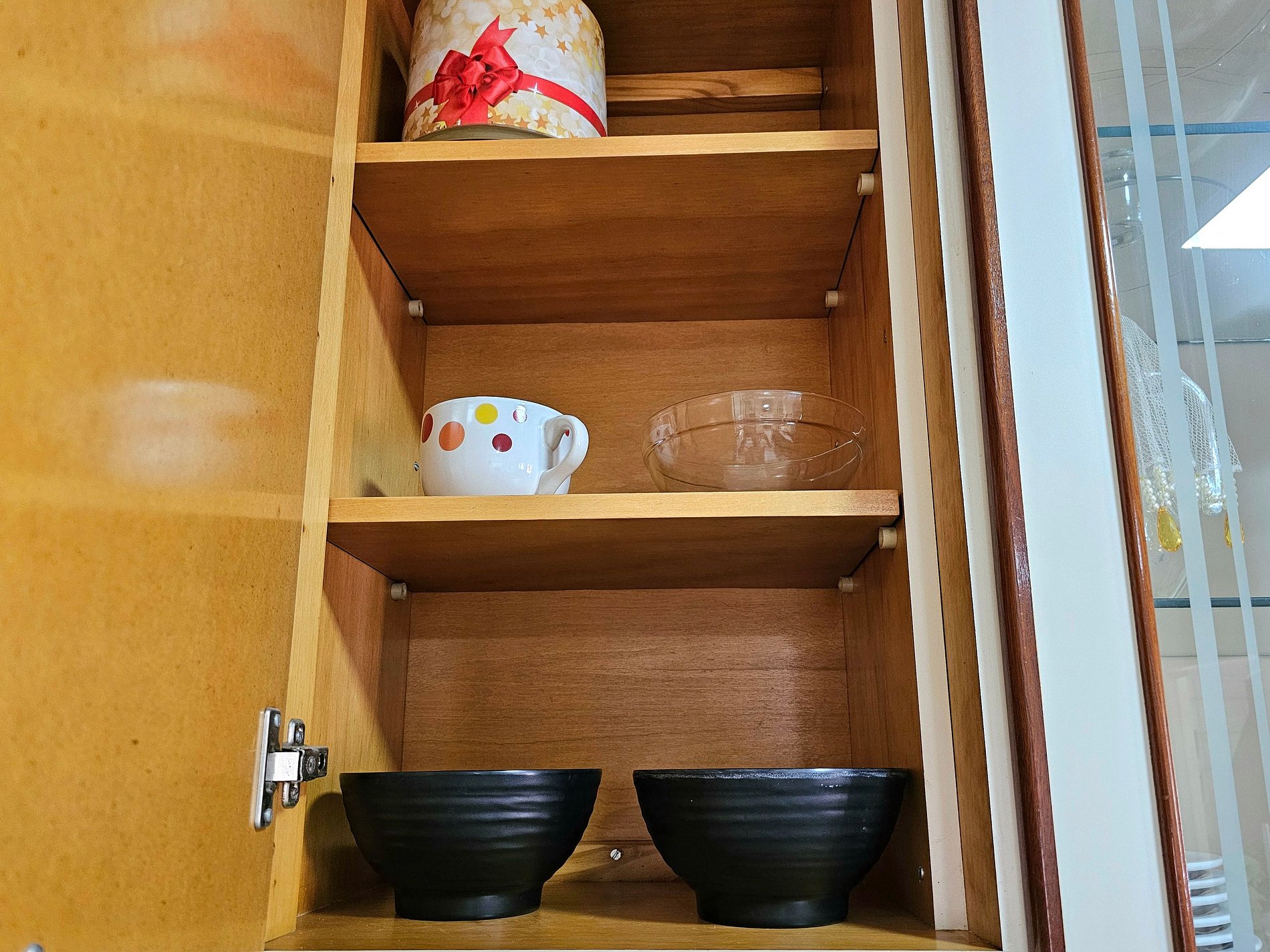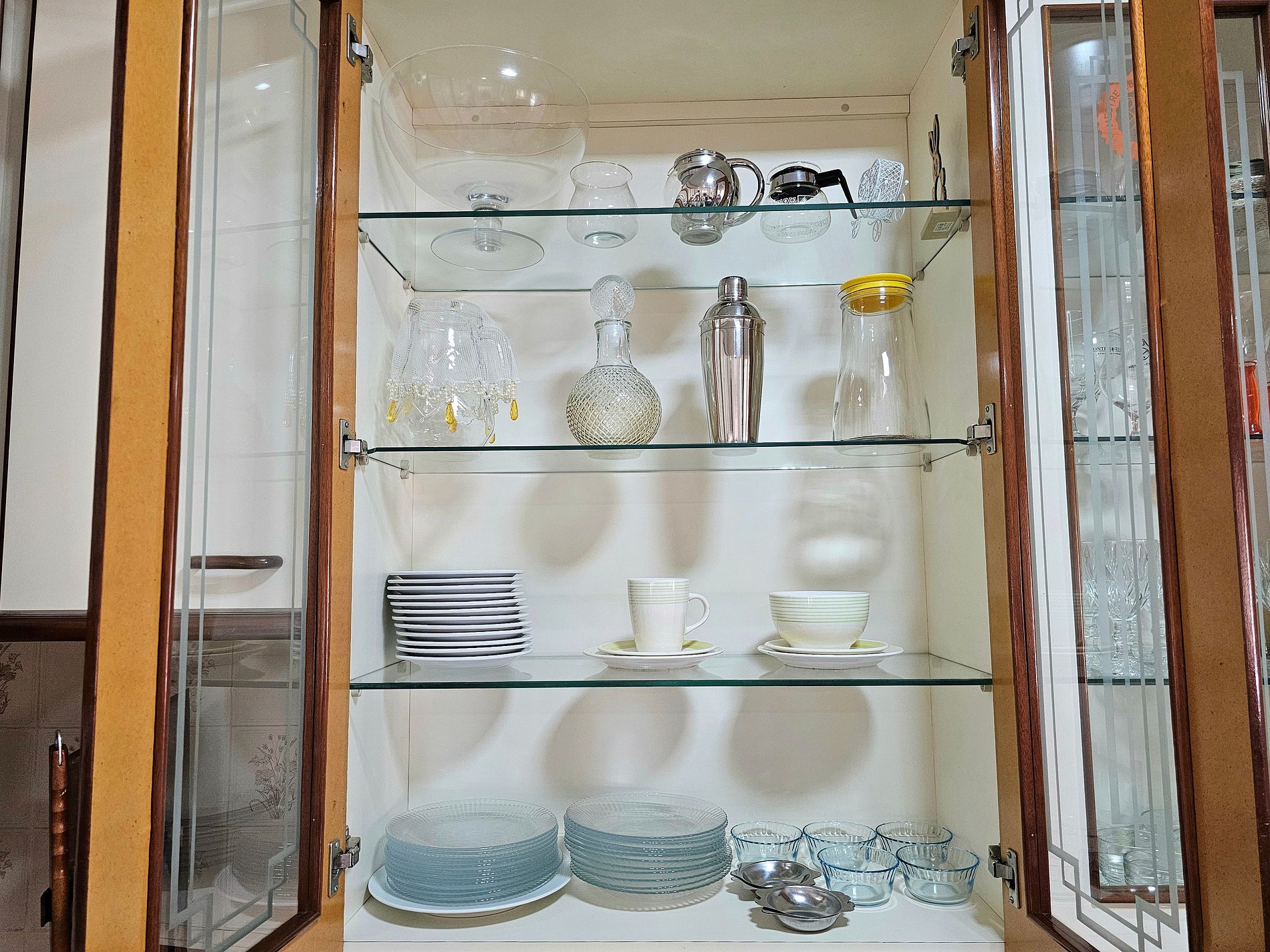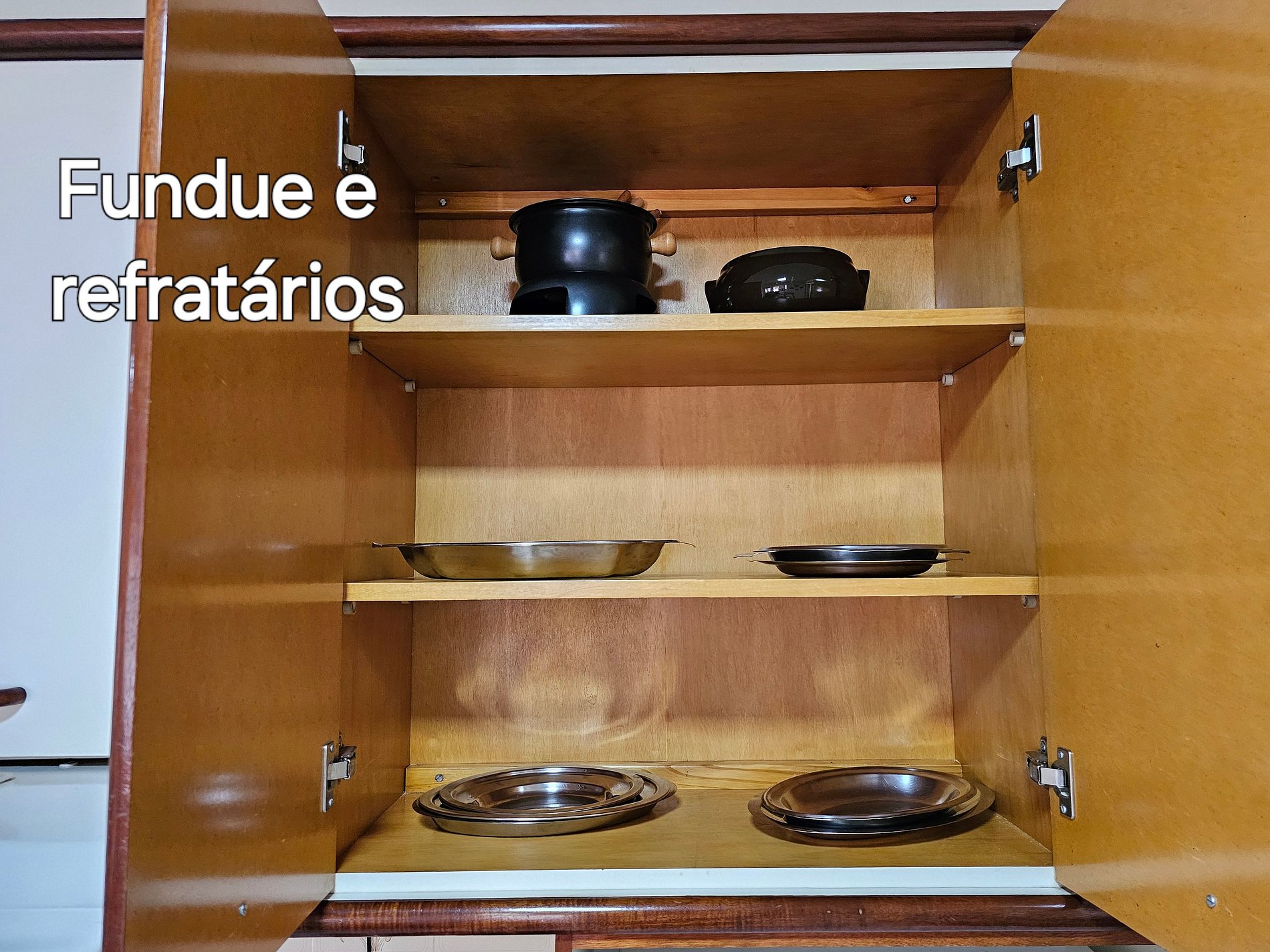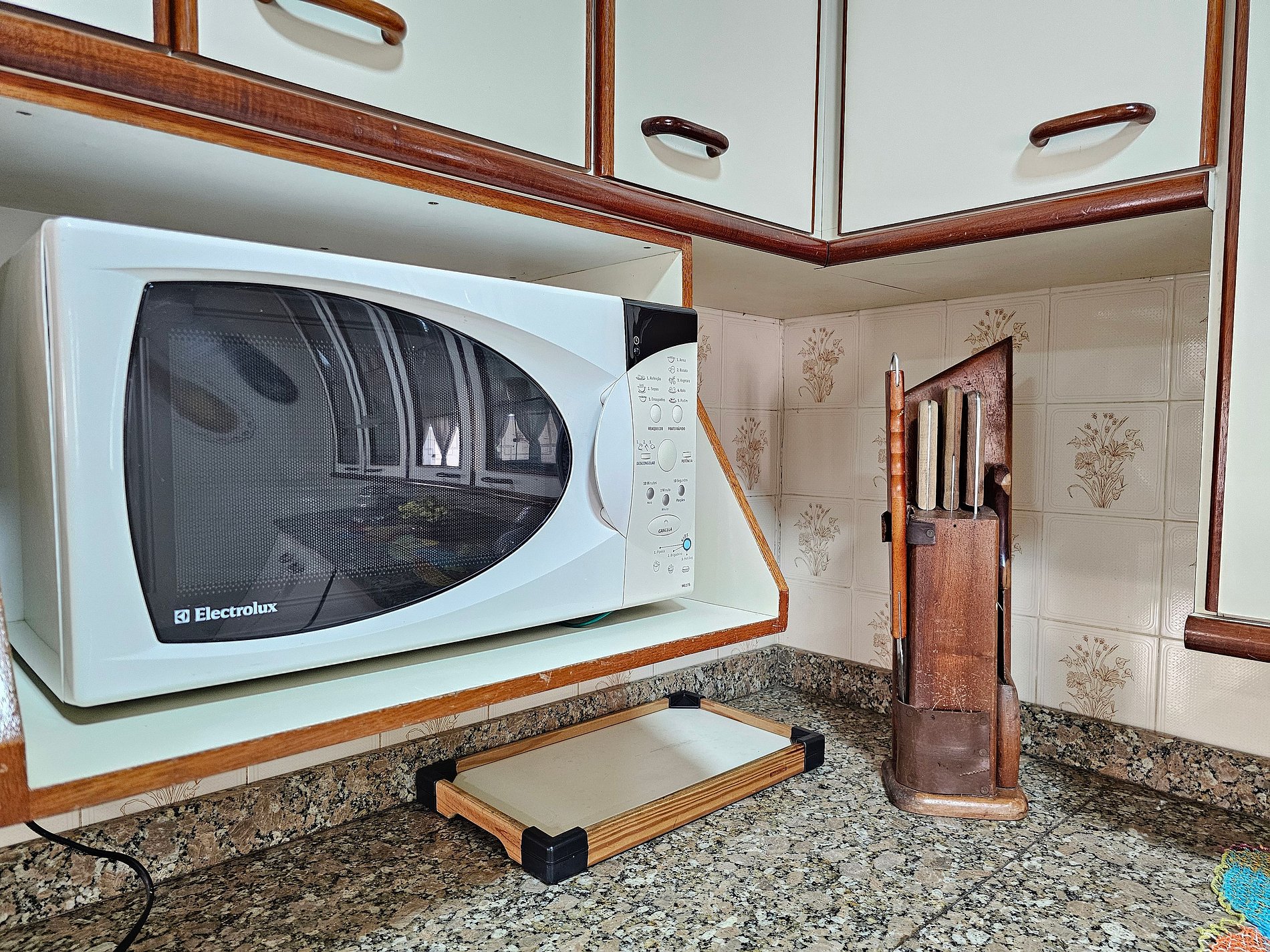 Cozinha completa com utensílios e louças para as refeições, microondas, forno, liquidificador.