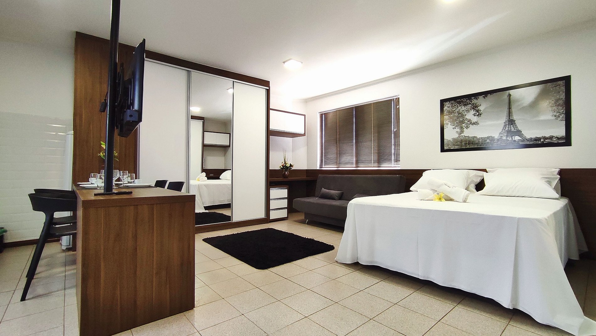 Lindo Studio novinho no coração de Foz do Iguaçu, cama de primeiríssima qualidade para casal podendo ser transformada em 2 camas de solteiro. Wifi e garagem incluído. Tudo muito próximo, como farmácia, padaria 24h, restaurantes, supermercados, terminal de onibus, shopping, comercio em geral. 20 minutos das Cataratas, 15 minutos do Paraguai/Itaipu. Ficamos em um prédio residencial e tranquilo, segundo andar sem elevador. Somos anfitriões comprometidos em fazer da sua estadia a melhor experiência