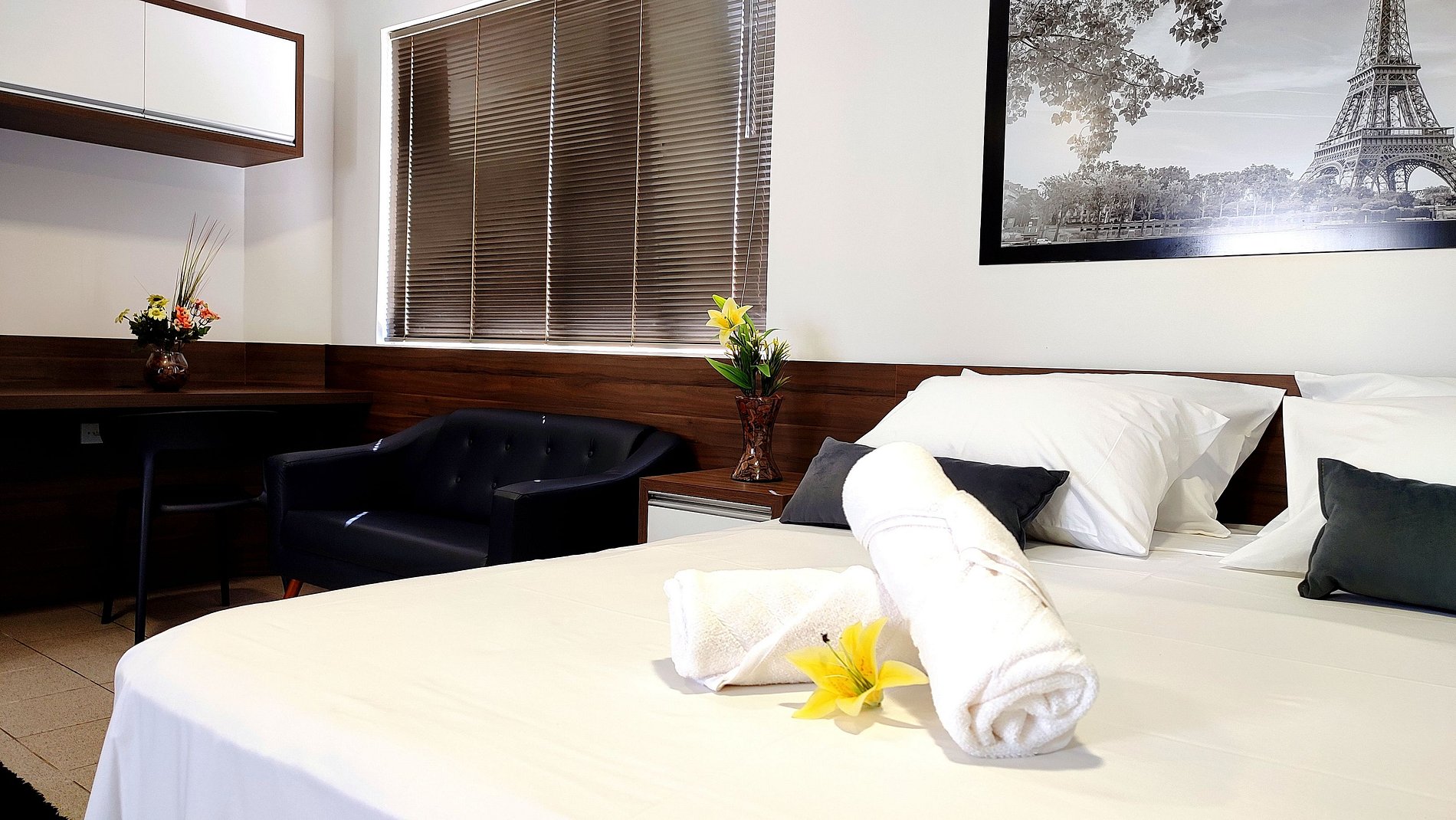 01 cama KING SIZE (conforme a necessidade preparamos com 02 camas de solteiro.