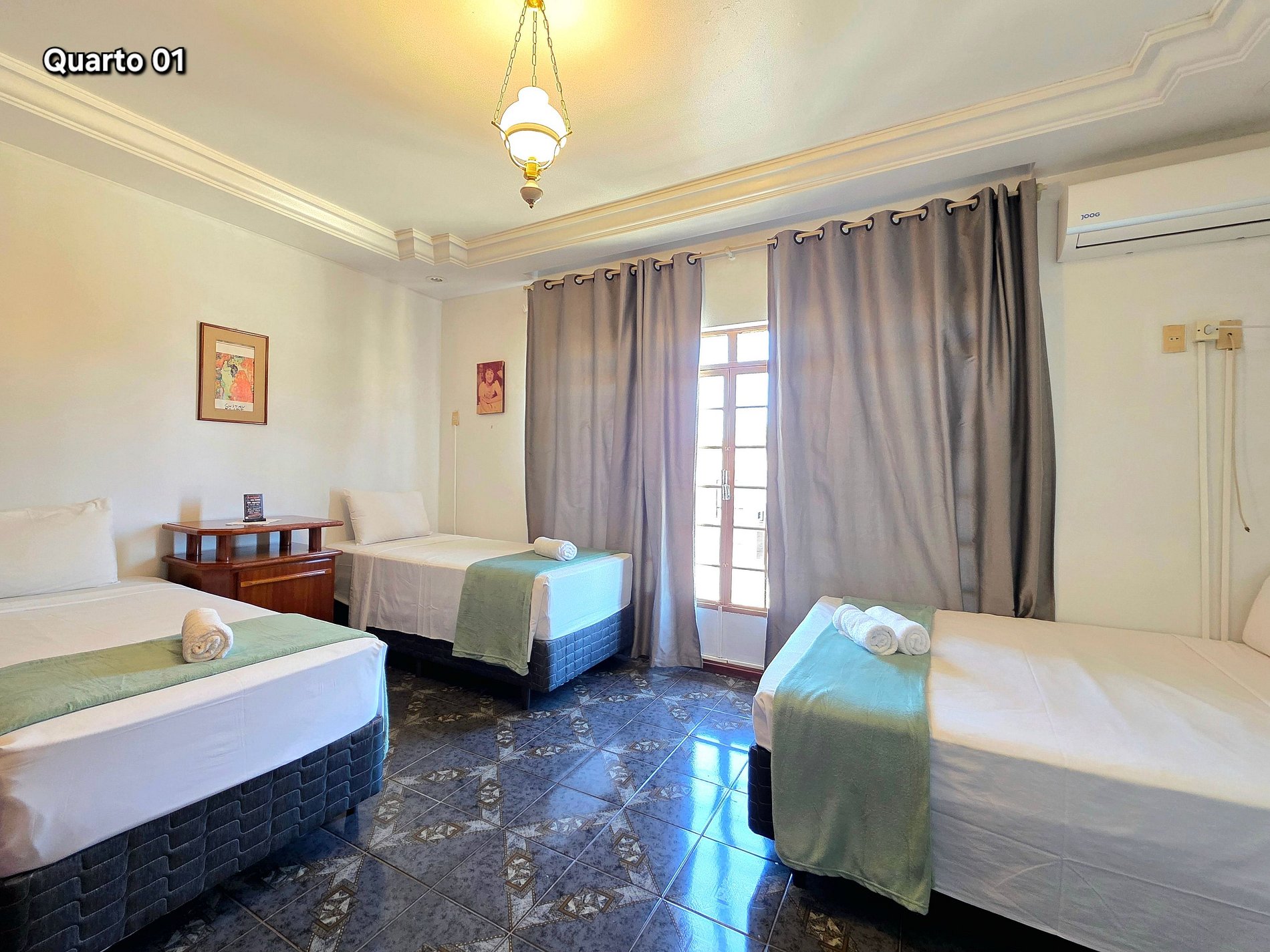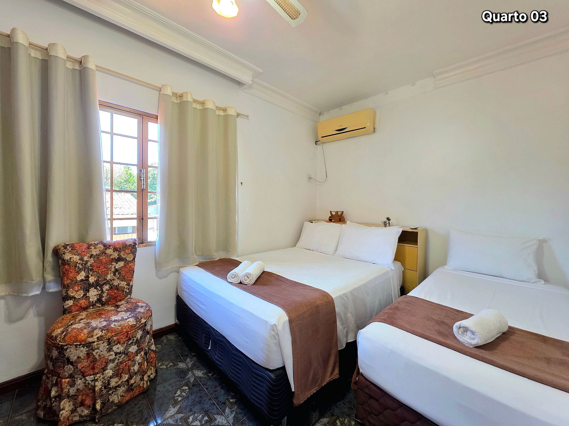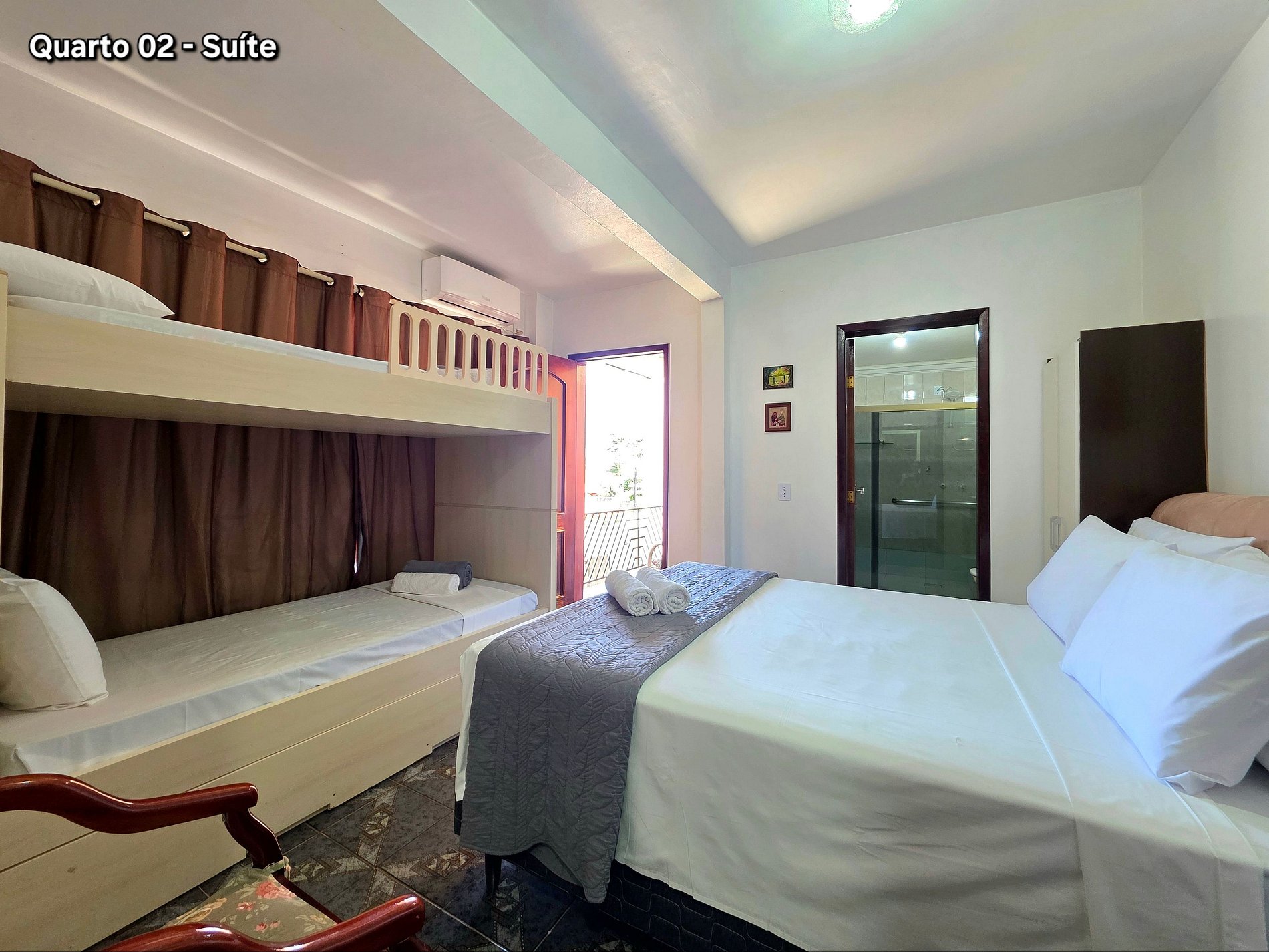 Andar de cima: Quarto 01: suite com uma cama queensize + 01 beliche para 2 pessoas (com banheiro)Quarto 02: 01 cama casal + 02 camas de solteiroQuarto 03: 01 cama casal + 01 cama de solteiroQuarto 04: 01 cama casal 02 banheiros (sendo 1 na suíte e outro social)Todos os quartos com ar condicionado.