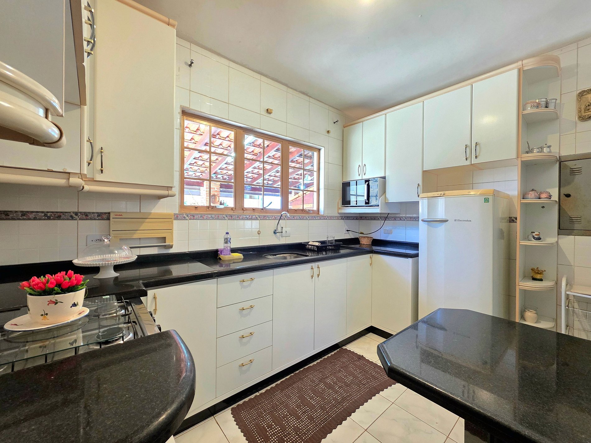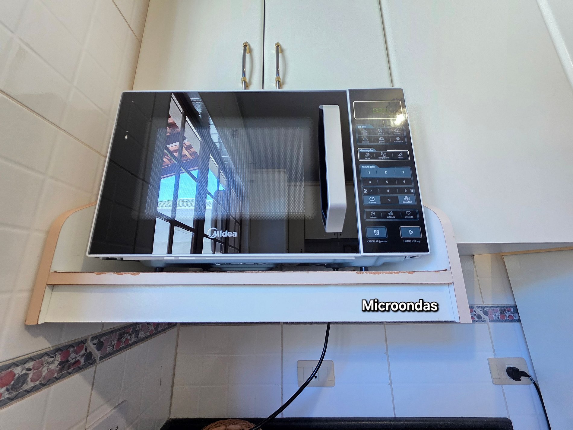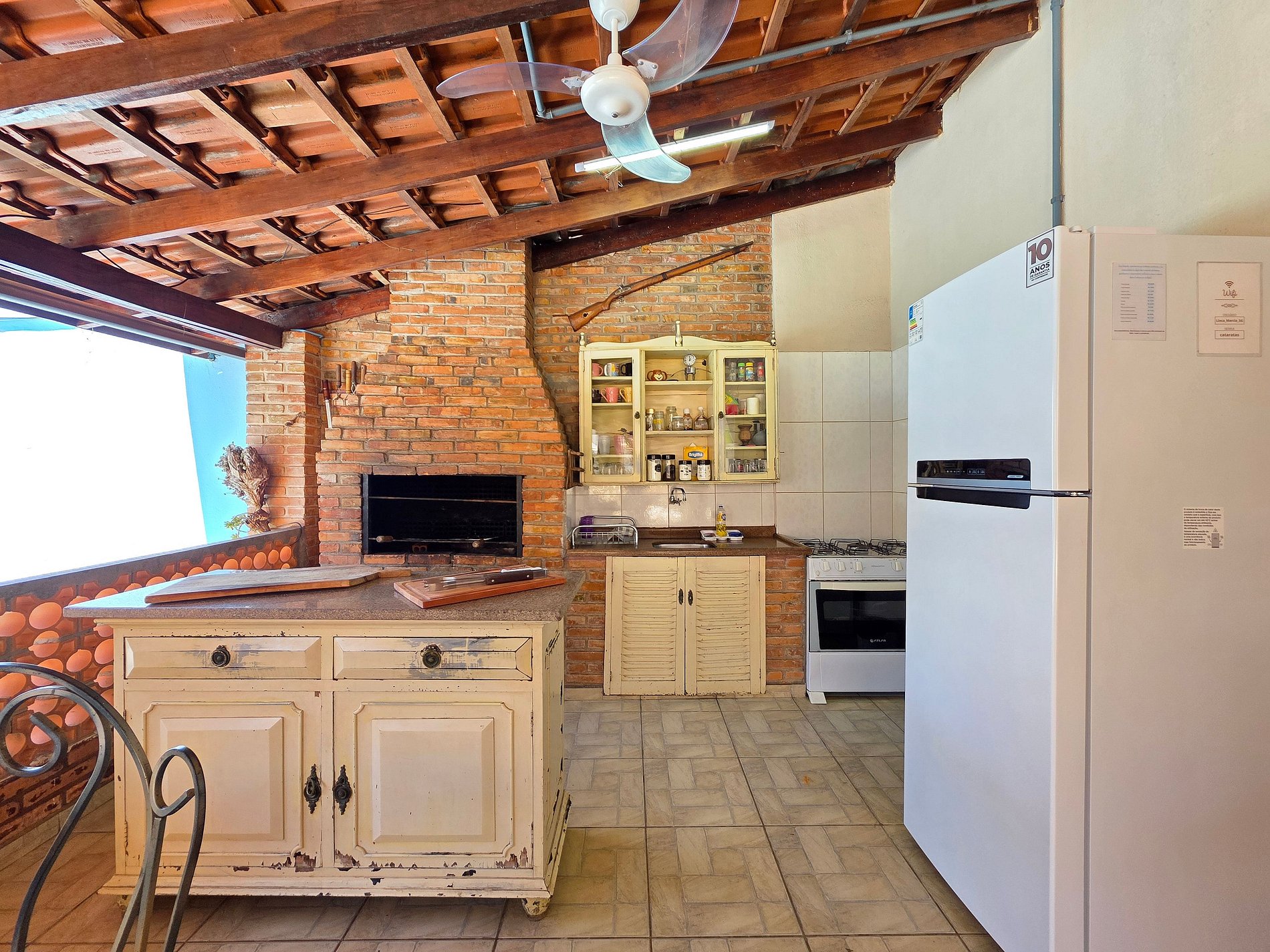 Andar debaixo Sala de estar com sala de jantar (com ar condicionado)01 lavabo Televisão com caixinha múltiplos canaisCozinha completa com utensílios e louças para as refeições, microondas, forno, liquidificador, sanduicheira.