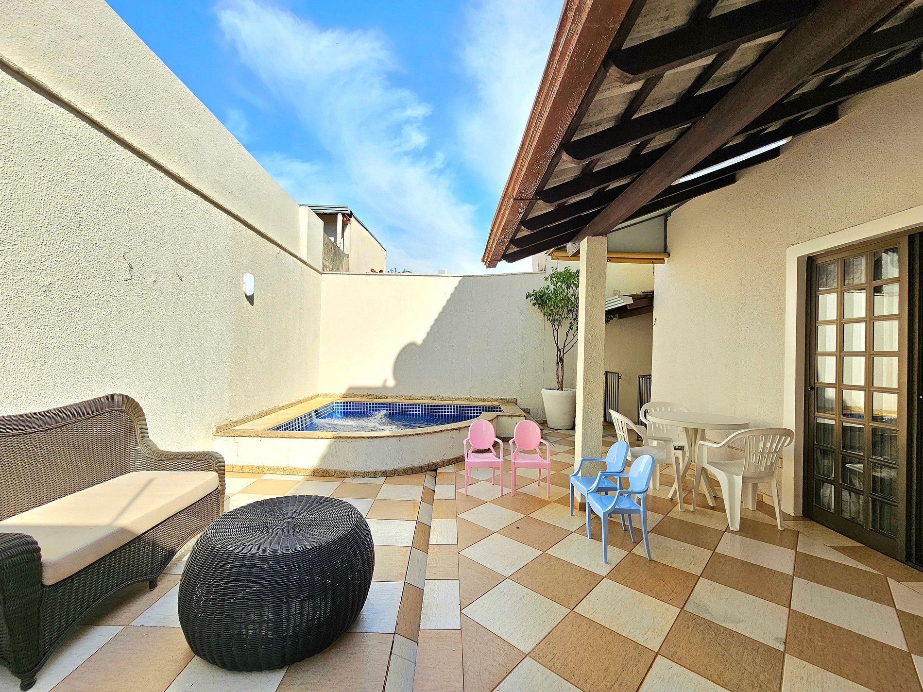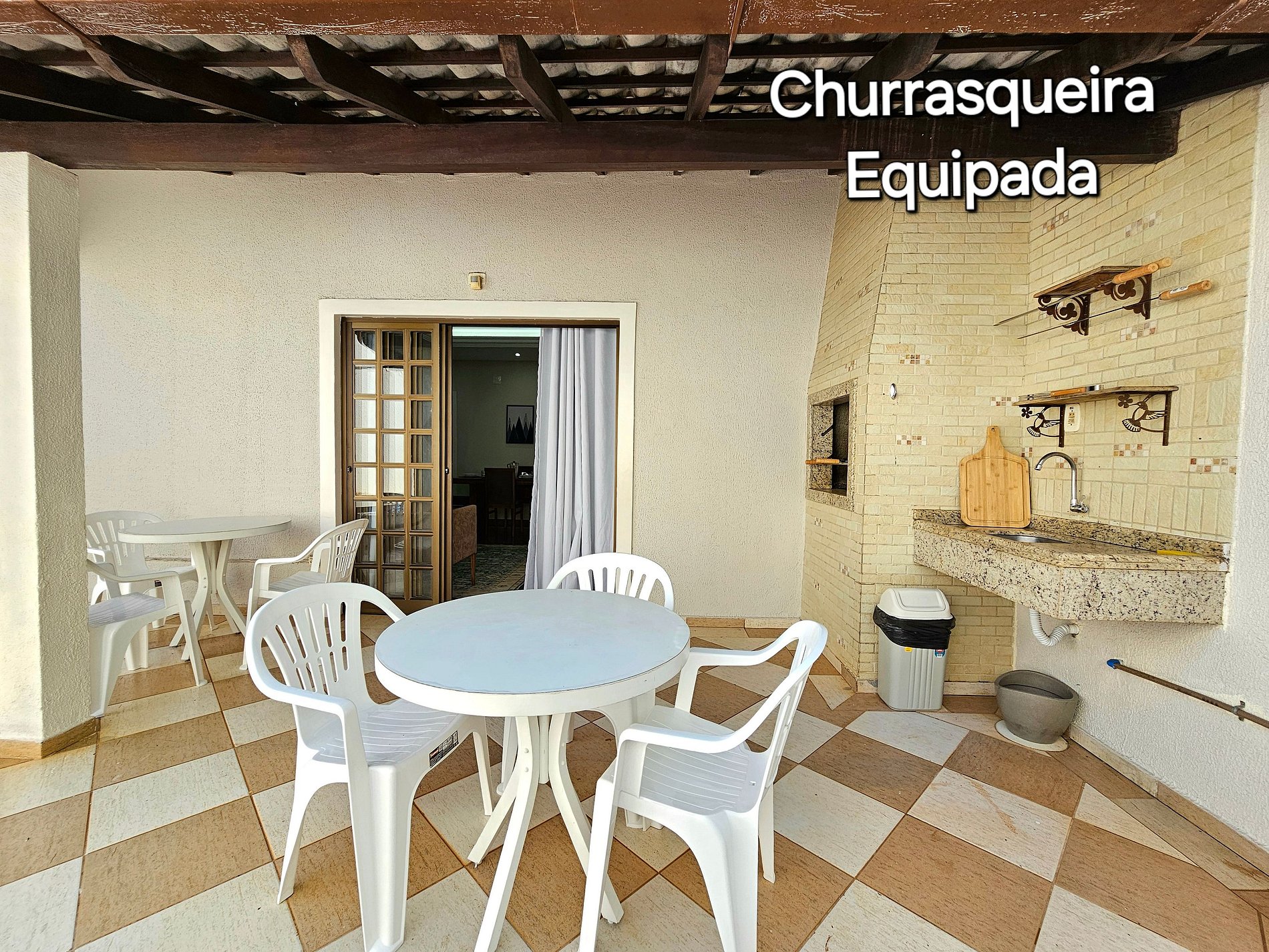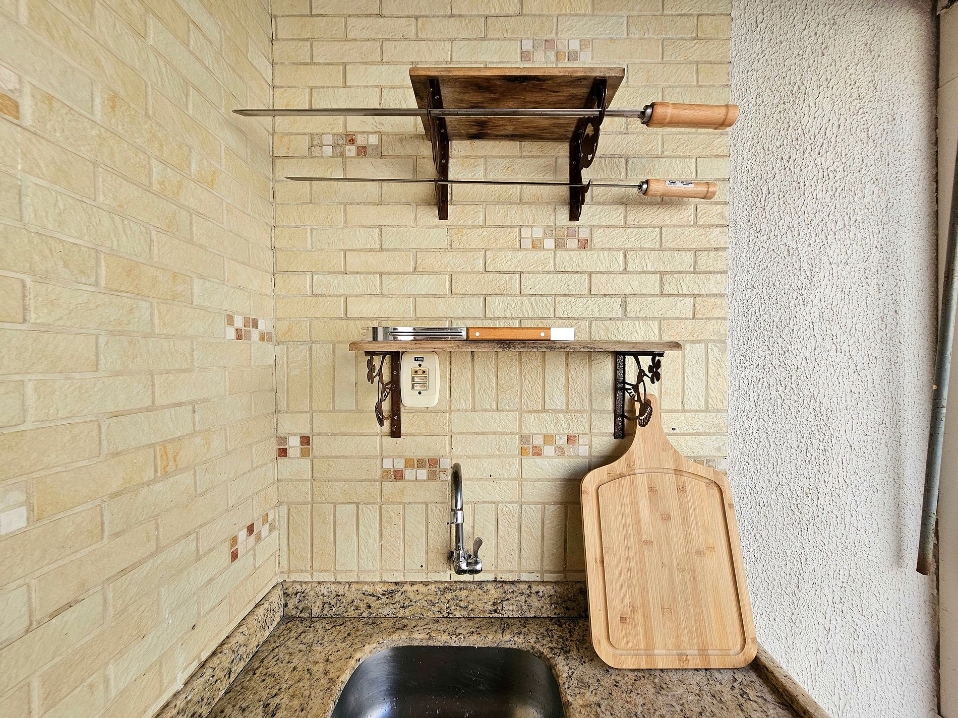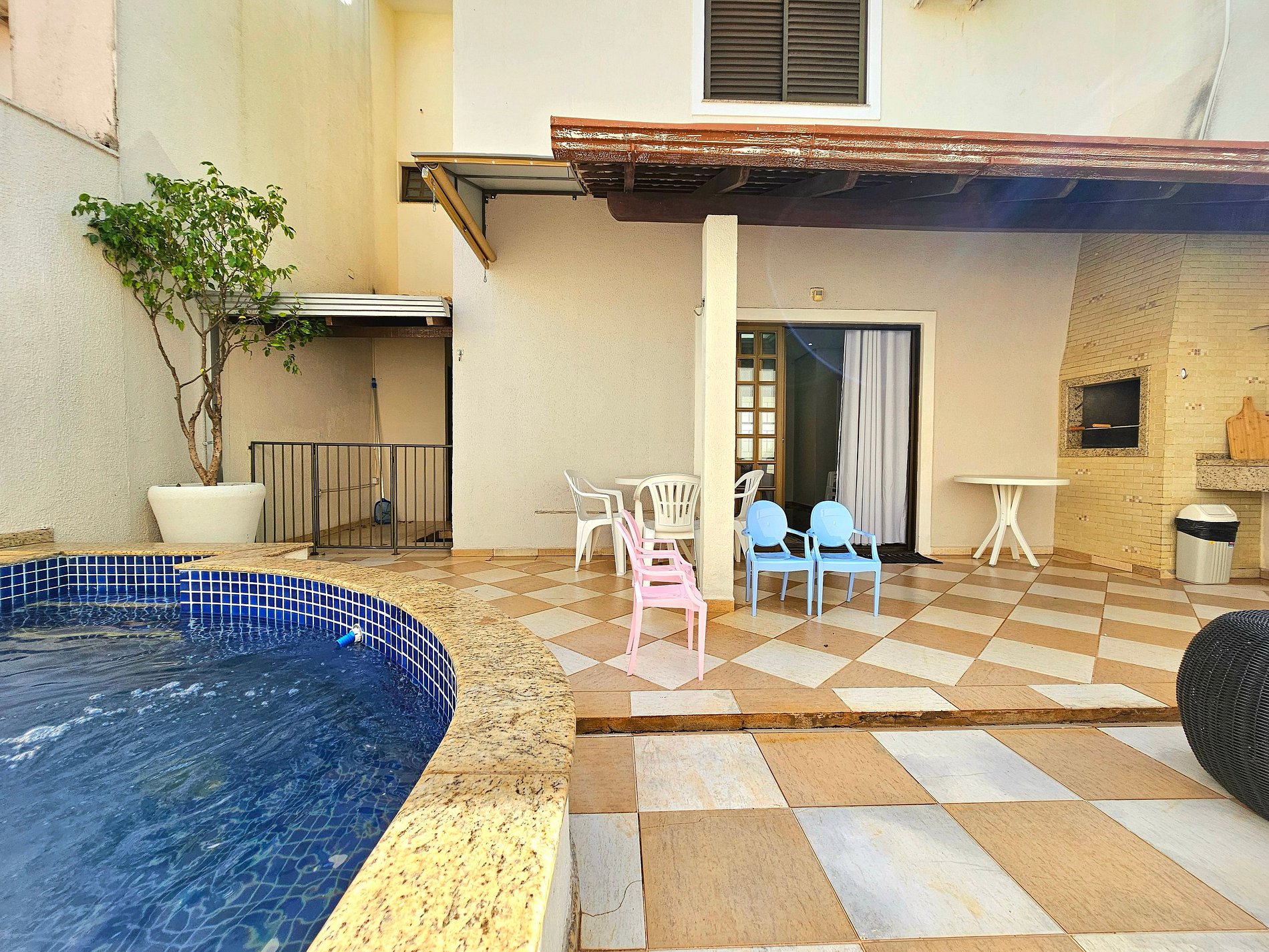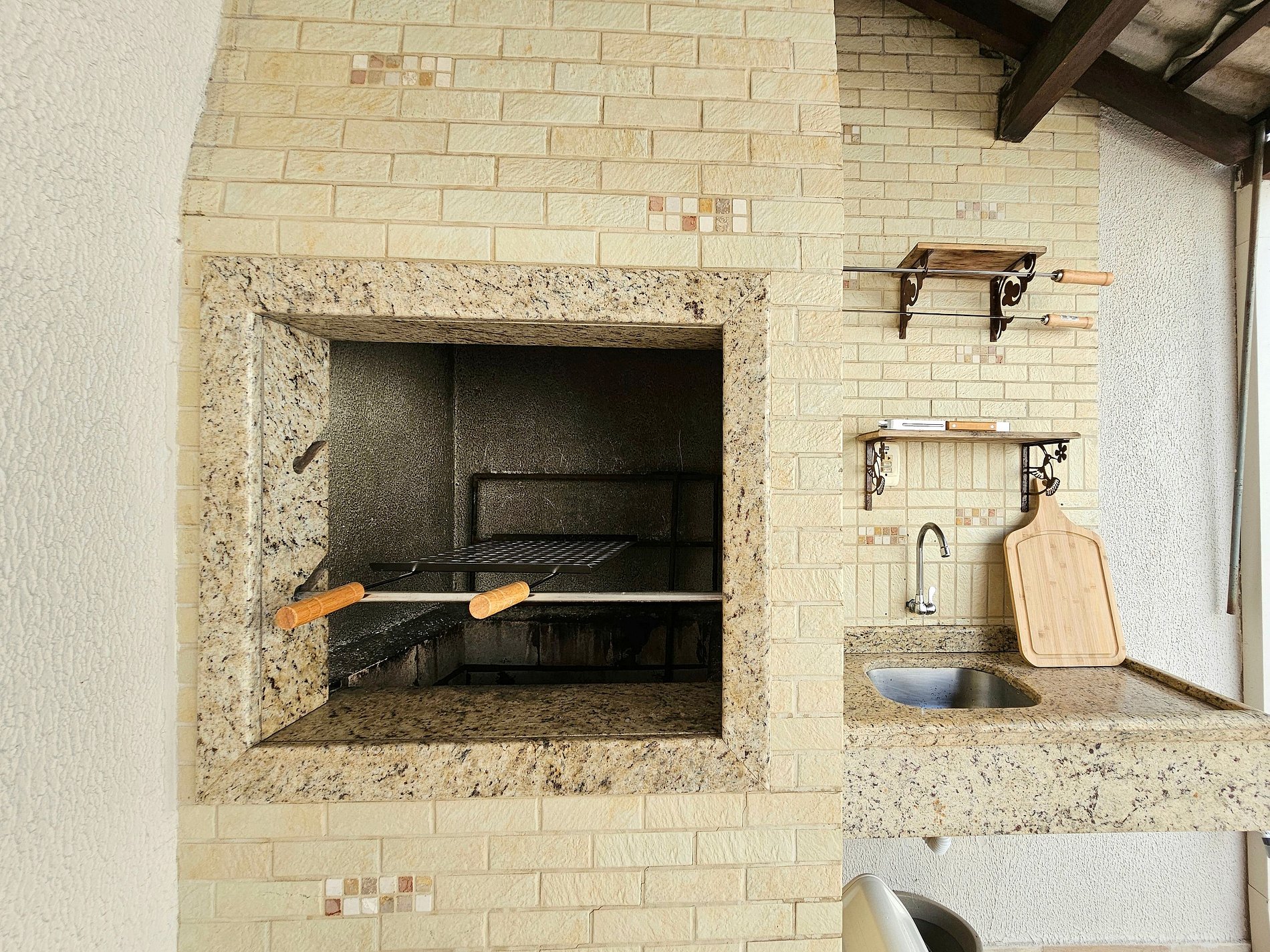 Area de lazer com piscina e churrasqueira equipada com espetos e grelha.