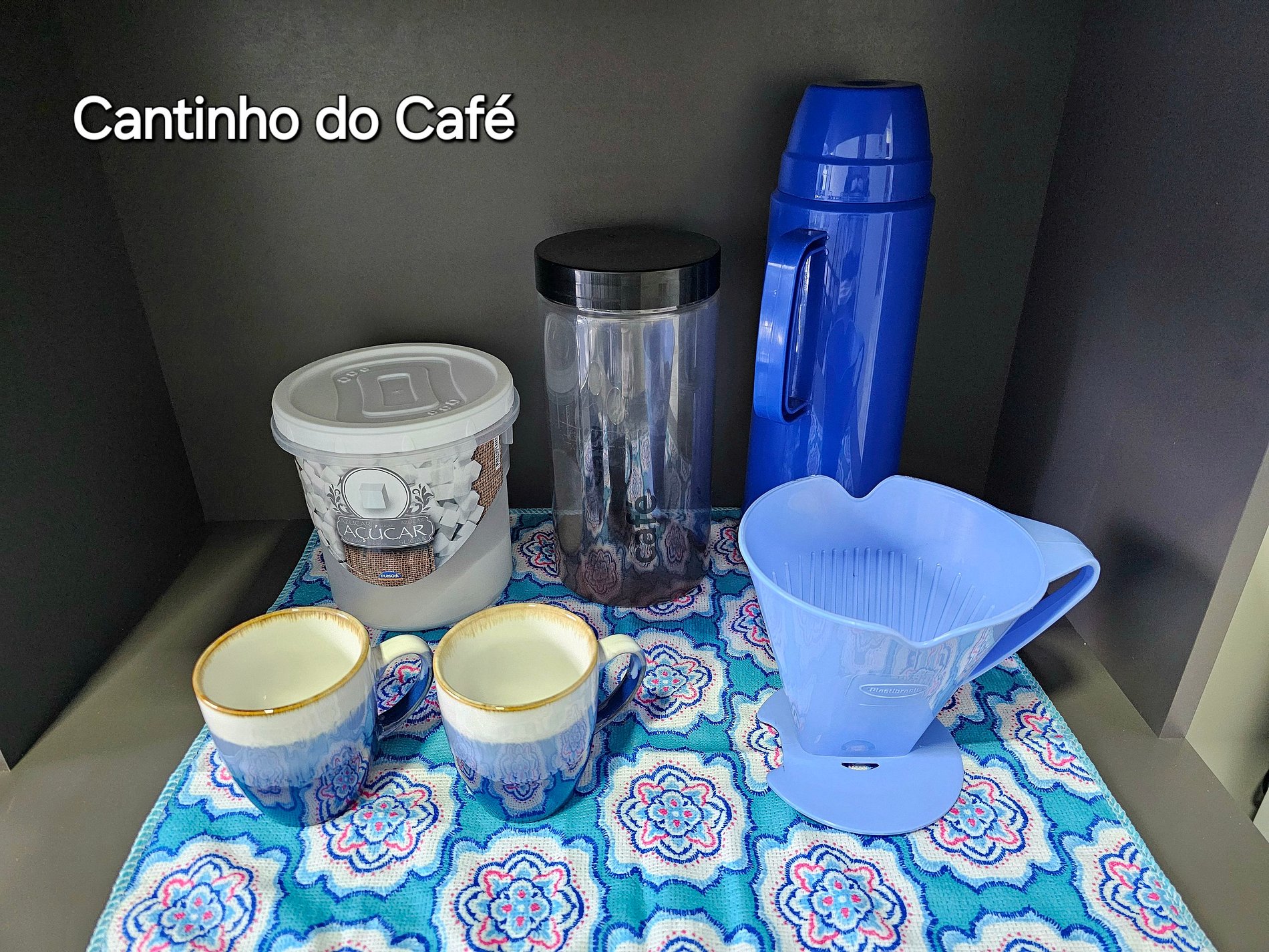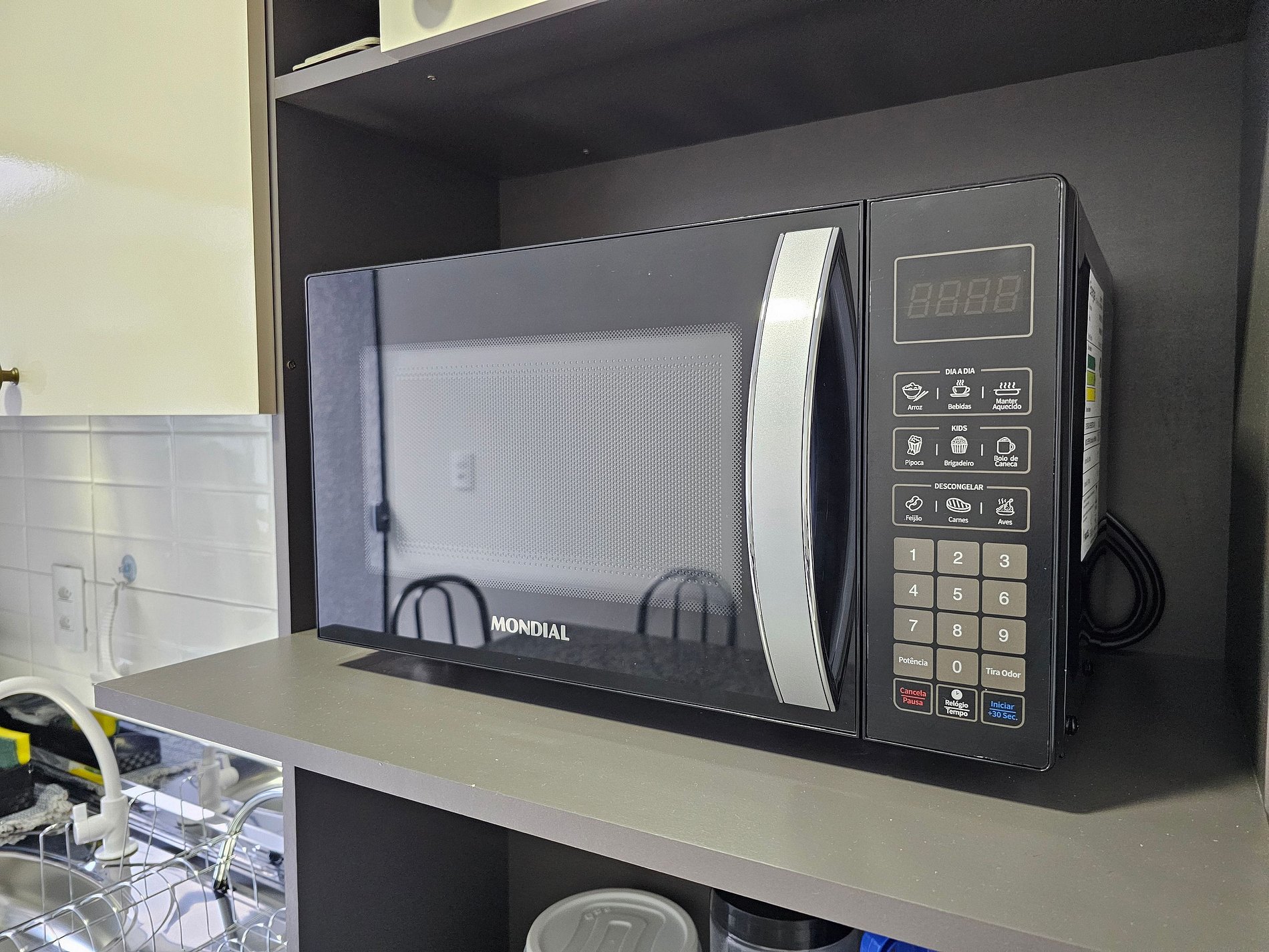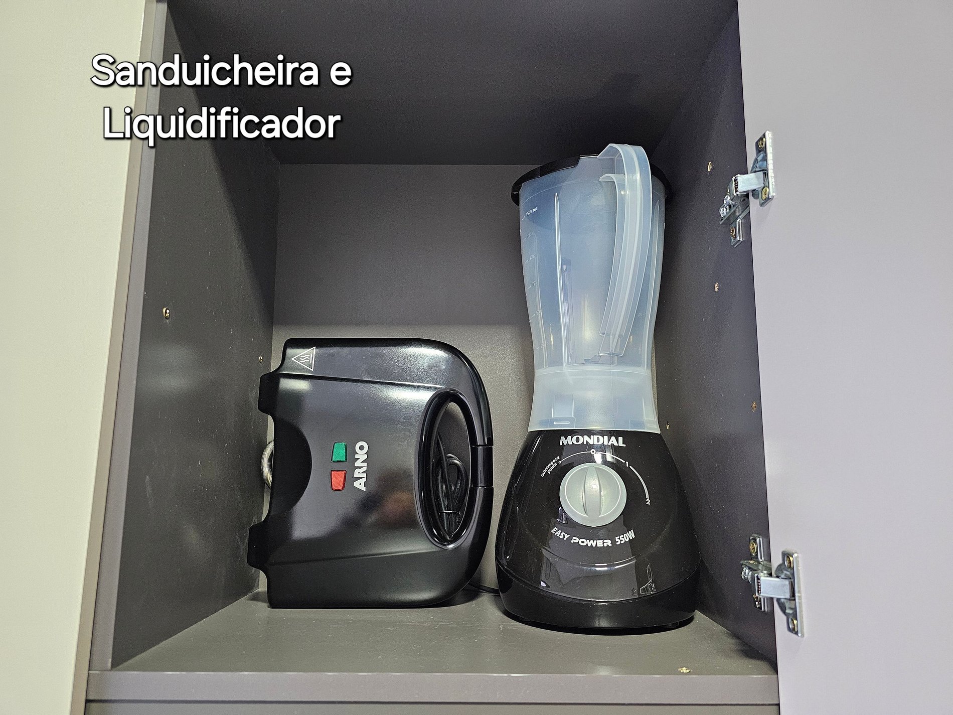 Cozinha completa com utensílios e louças para as refeições, microondas, liquidificador, sanduicheira.