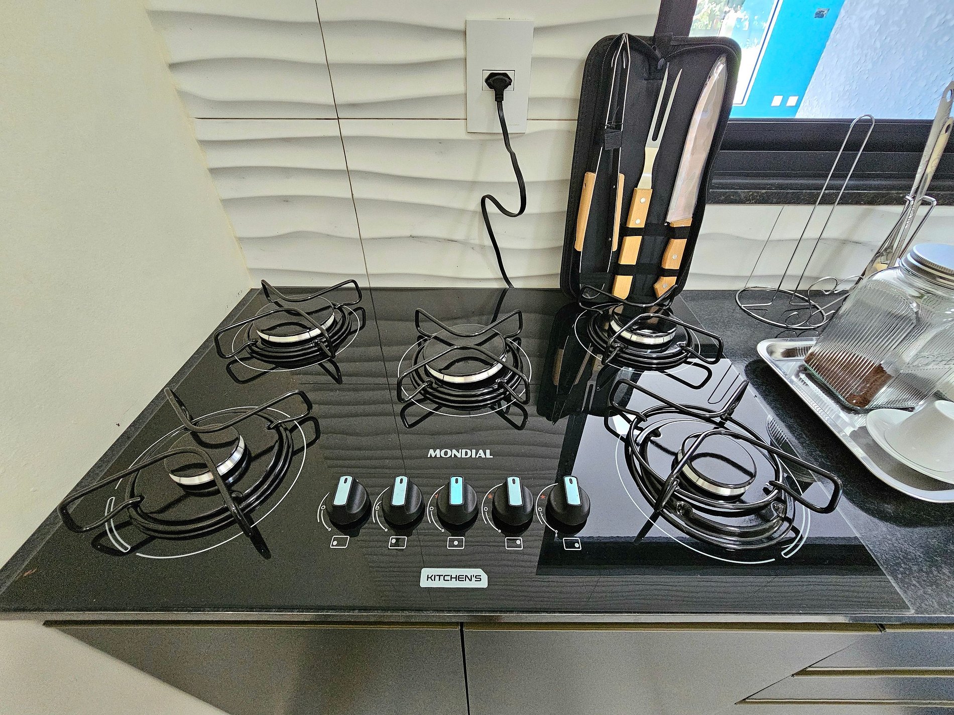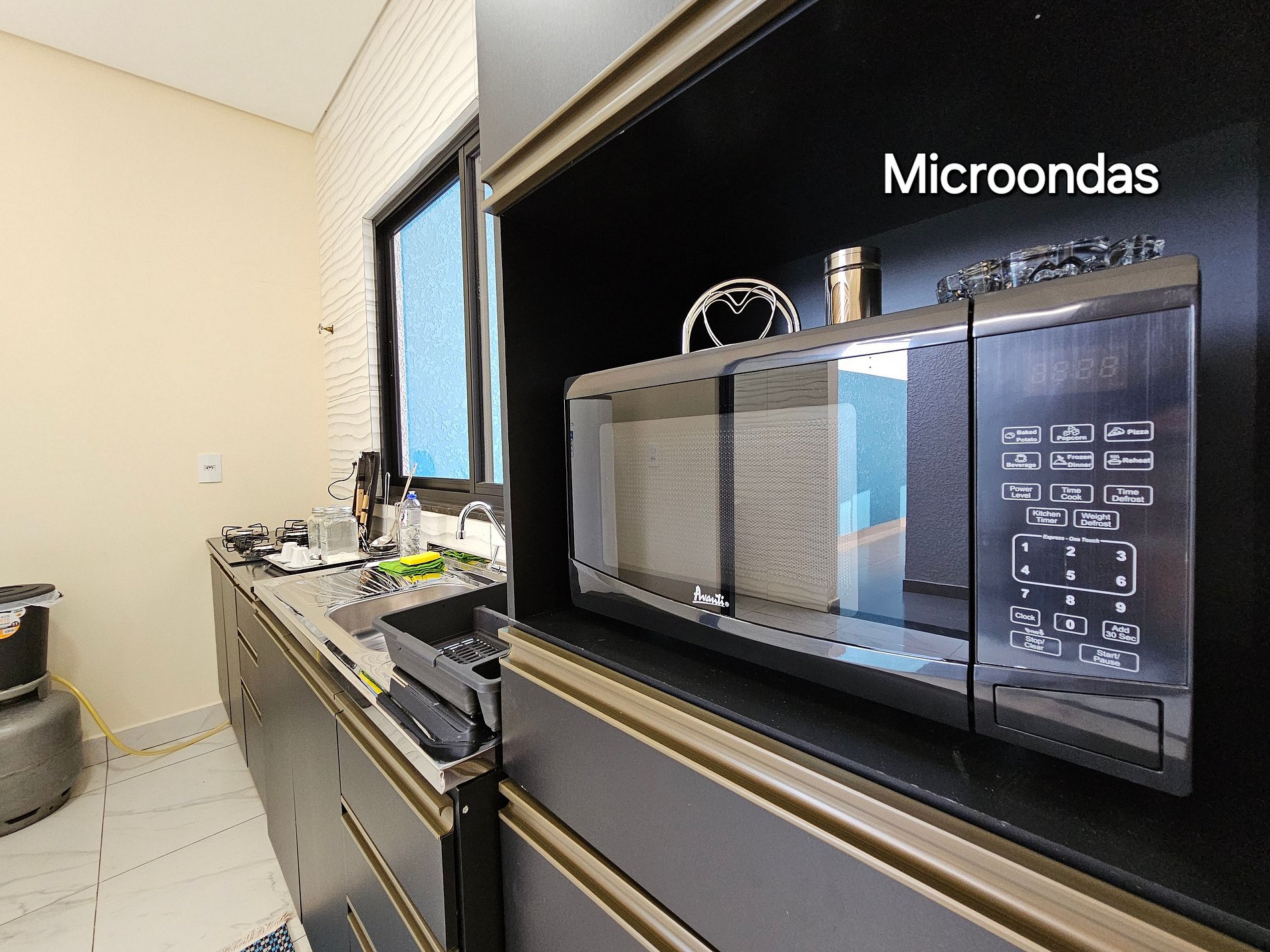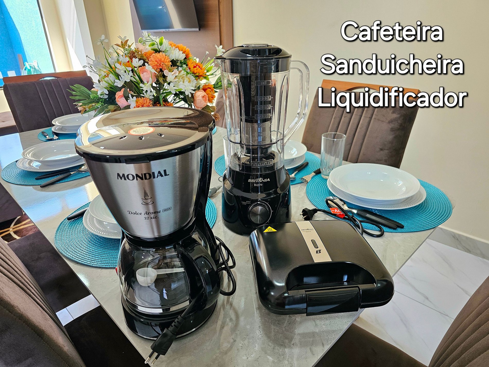 Cozinha completa com utensílios e louças para as refeições, fogão, microondas, cafeteira, sanduicheira, liquidificador.
