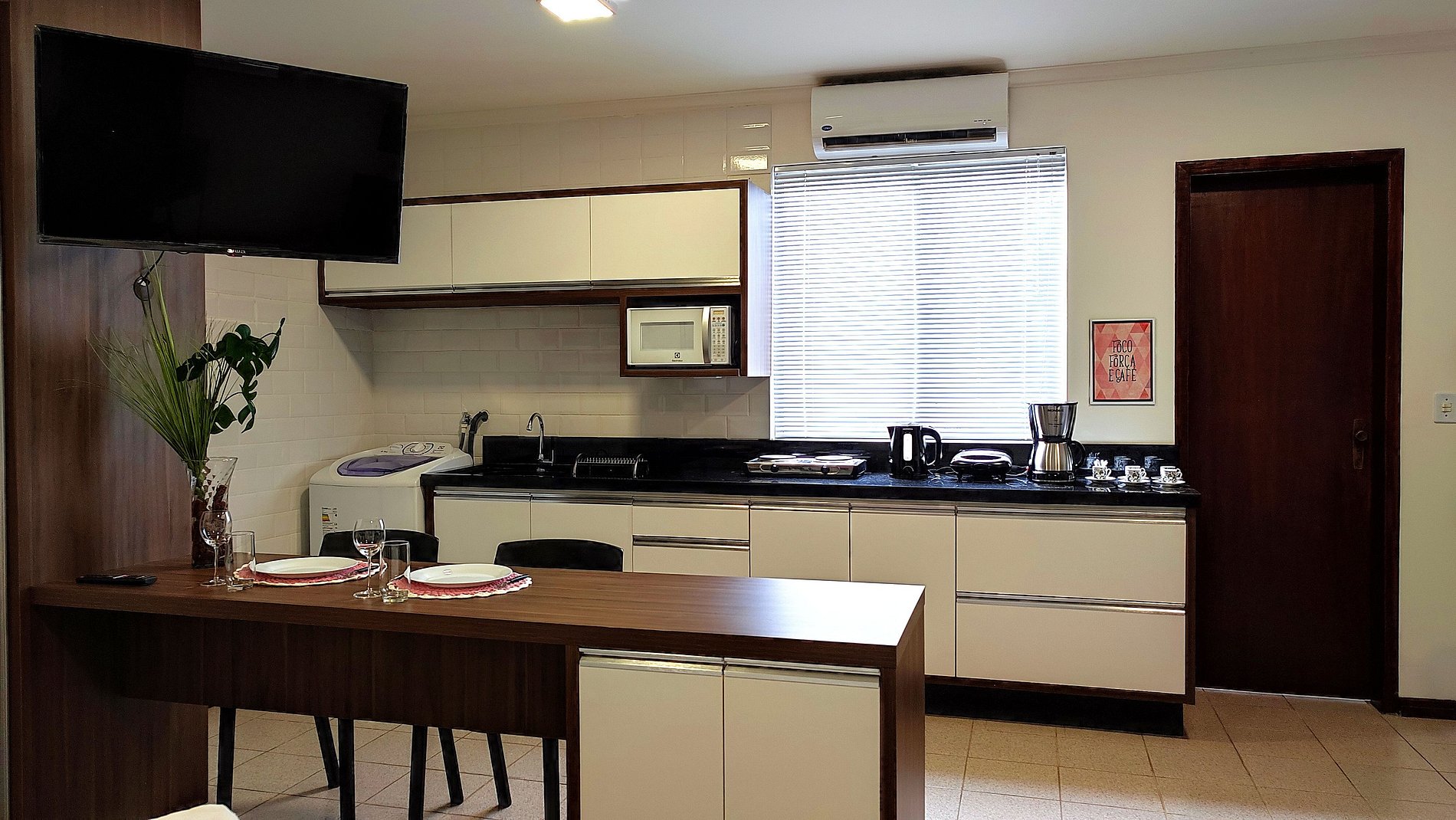 Ambiente integrado: 02 camas de casal + cozinha + banheiro
