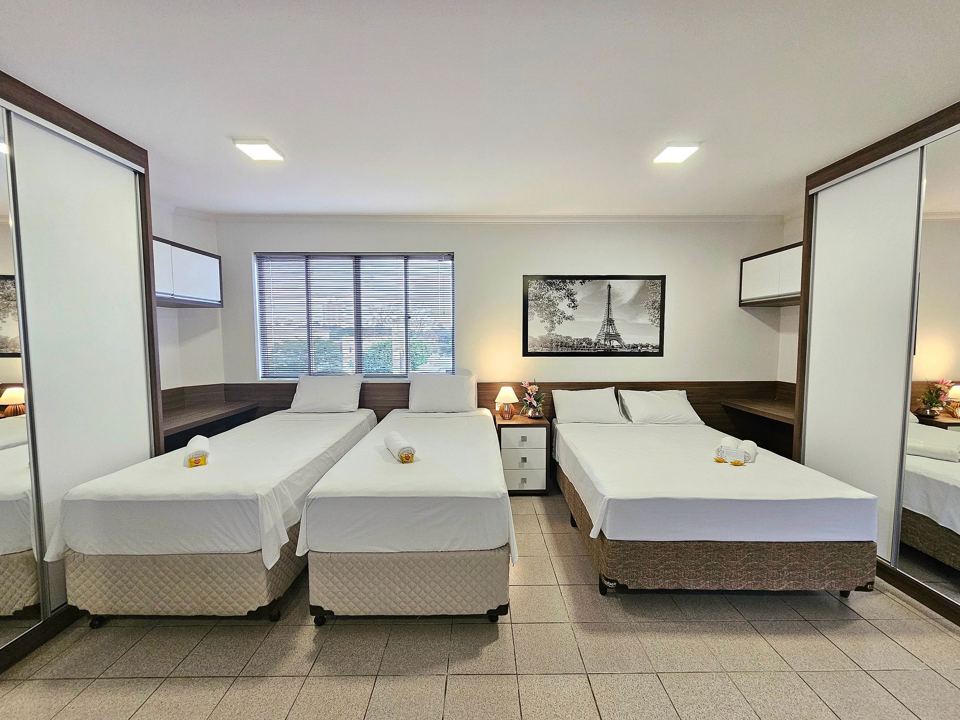 Ambiente integrado: 01 cama de casal + 02 camas de solteiro + cozinha + banheiro