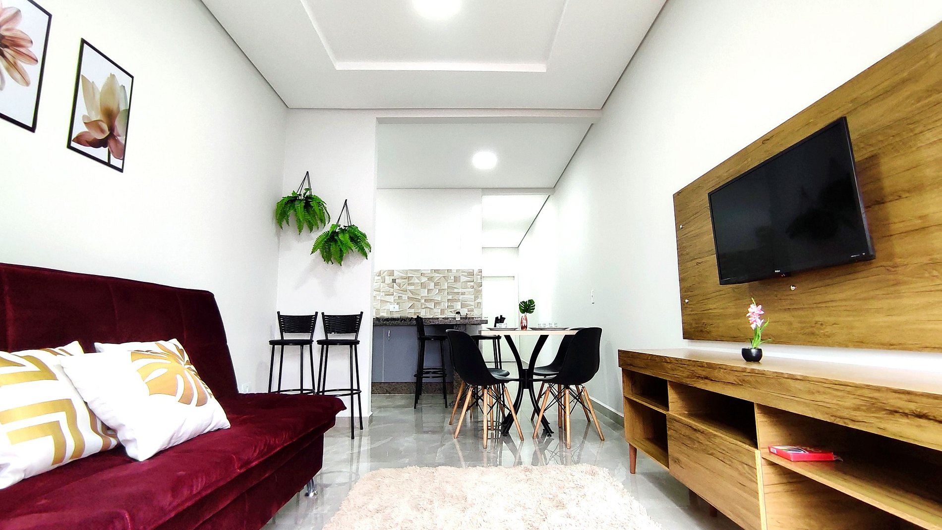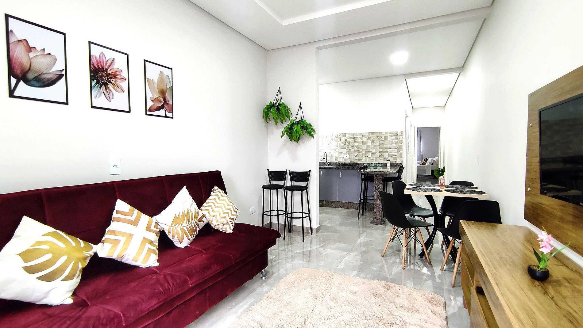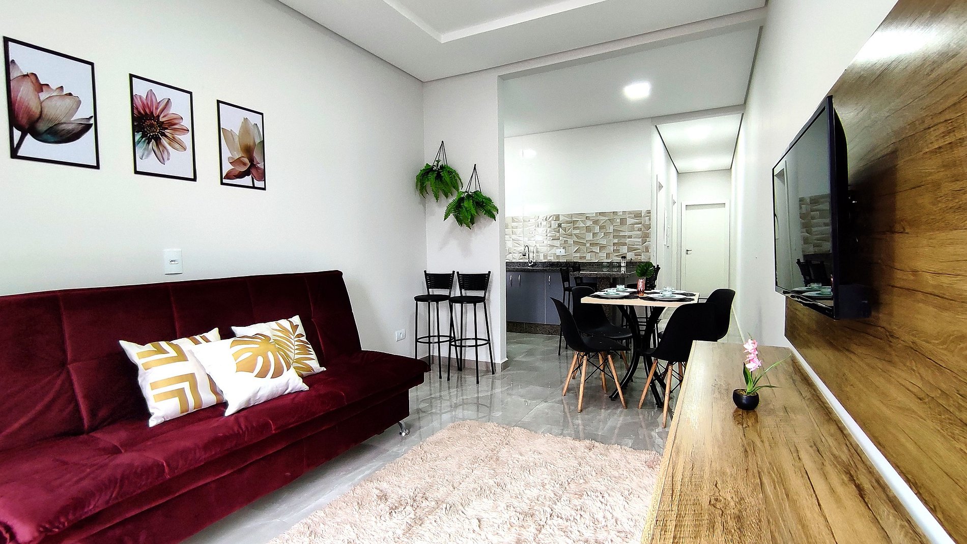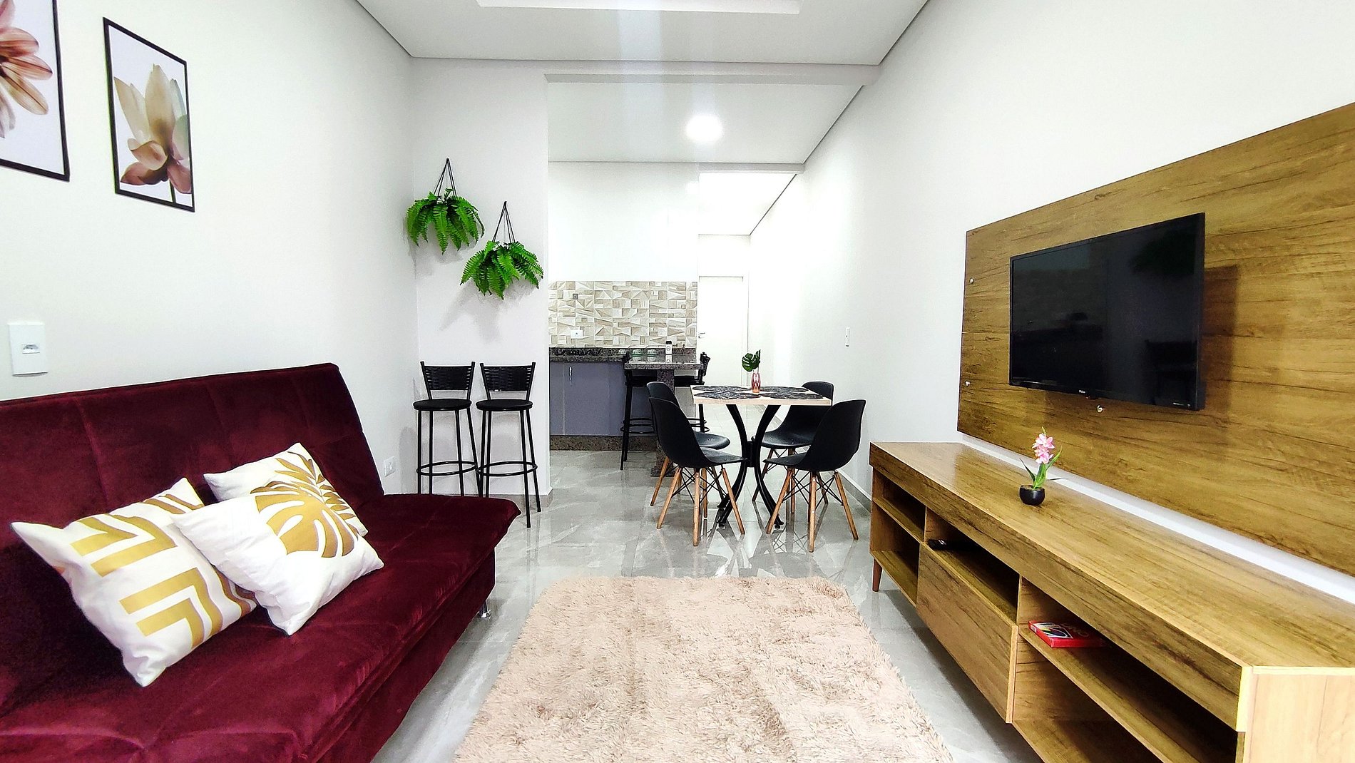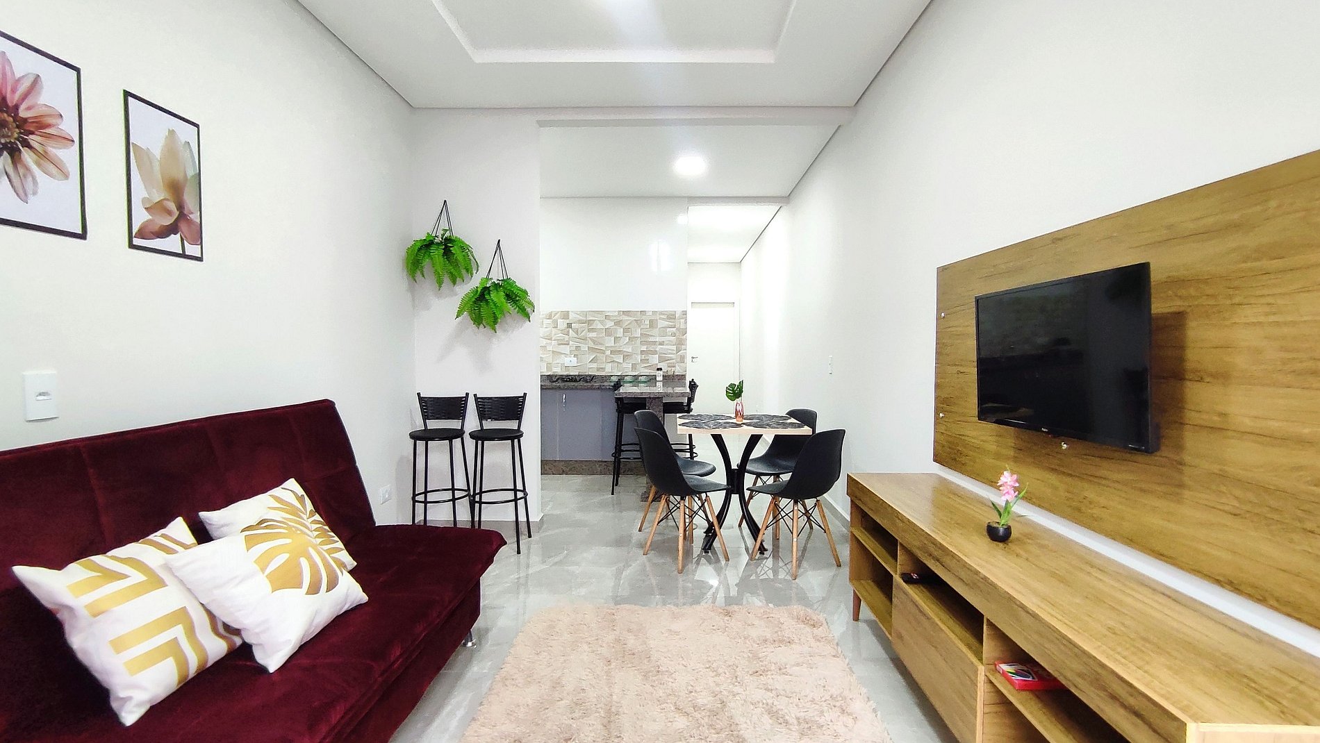 > Sala de estar e Jantar com sofá cama (2 pessoas - sofa cama com roupas de cama e travesseiros) e SmartTV.