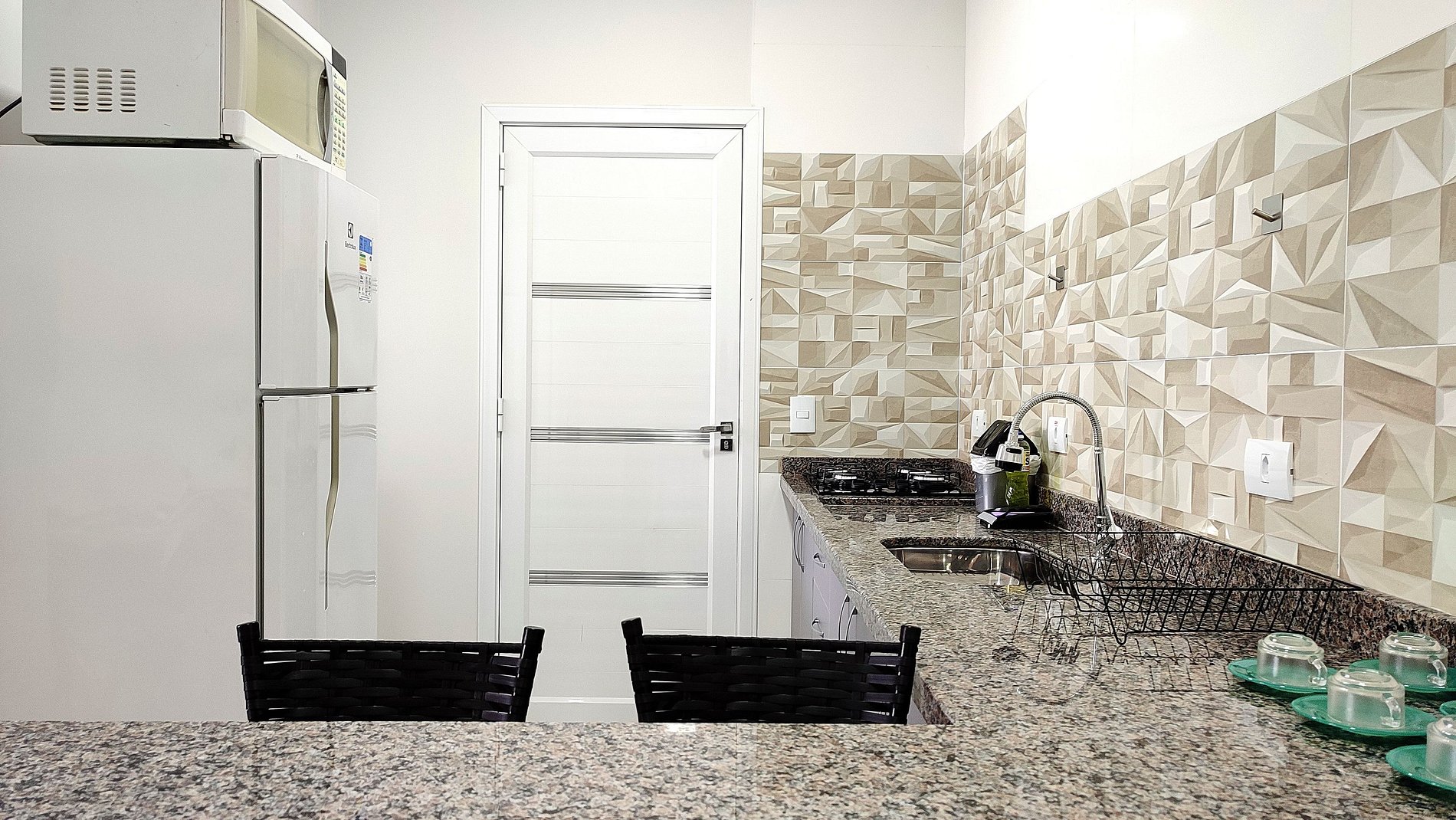 > Cozinha com geladeira, fogão, microondas, sanduicheira e todos os utensílios para cozinhar, e as louças para as refeições.