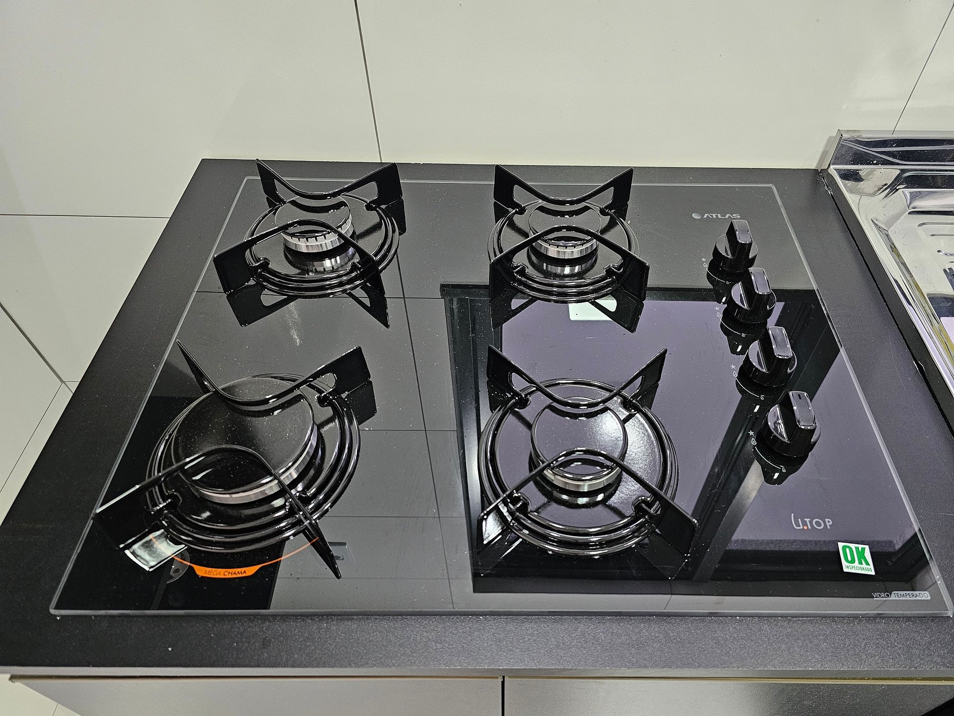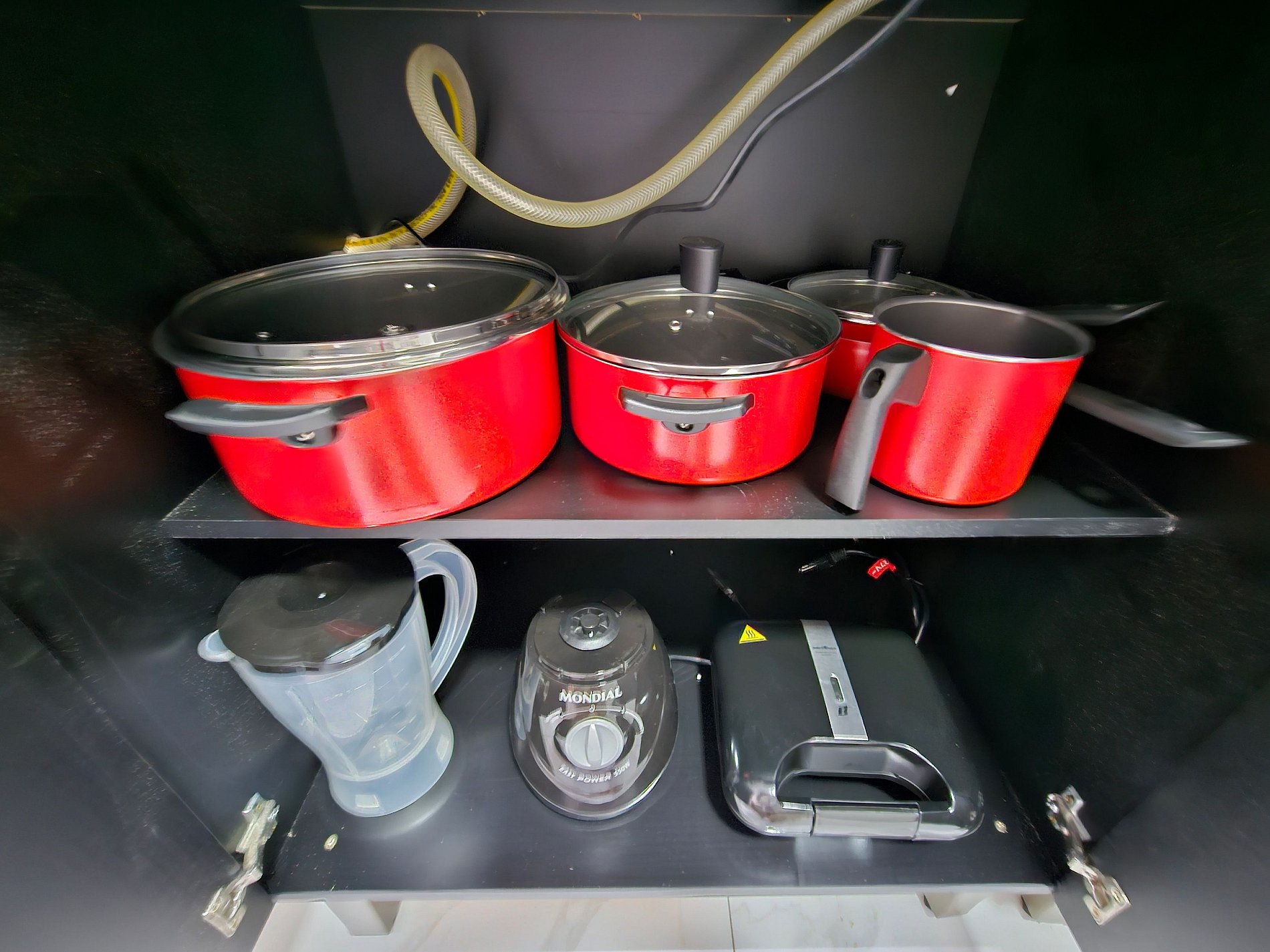 Cozinha completa com utensílios e louças para as refeições, fogão, microondas, cafeteira, sanduicheira, liquidificador.