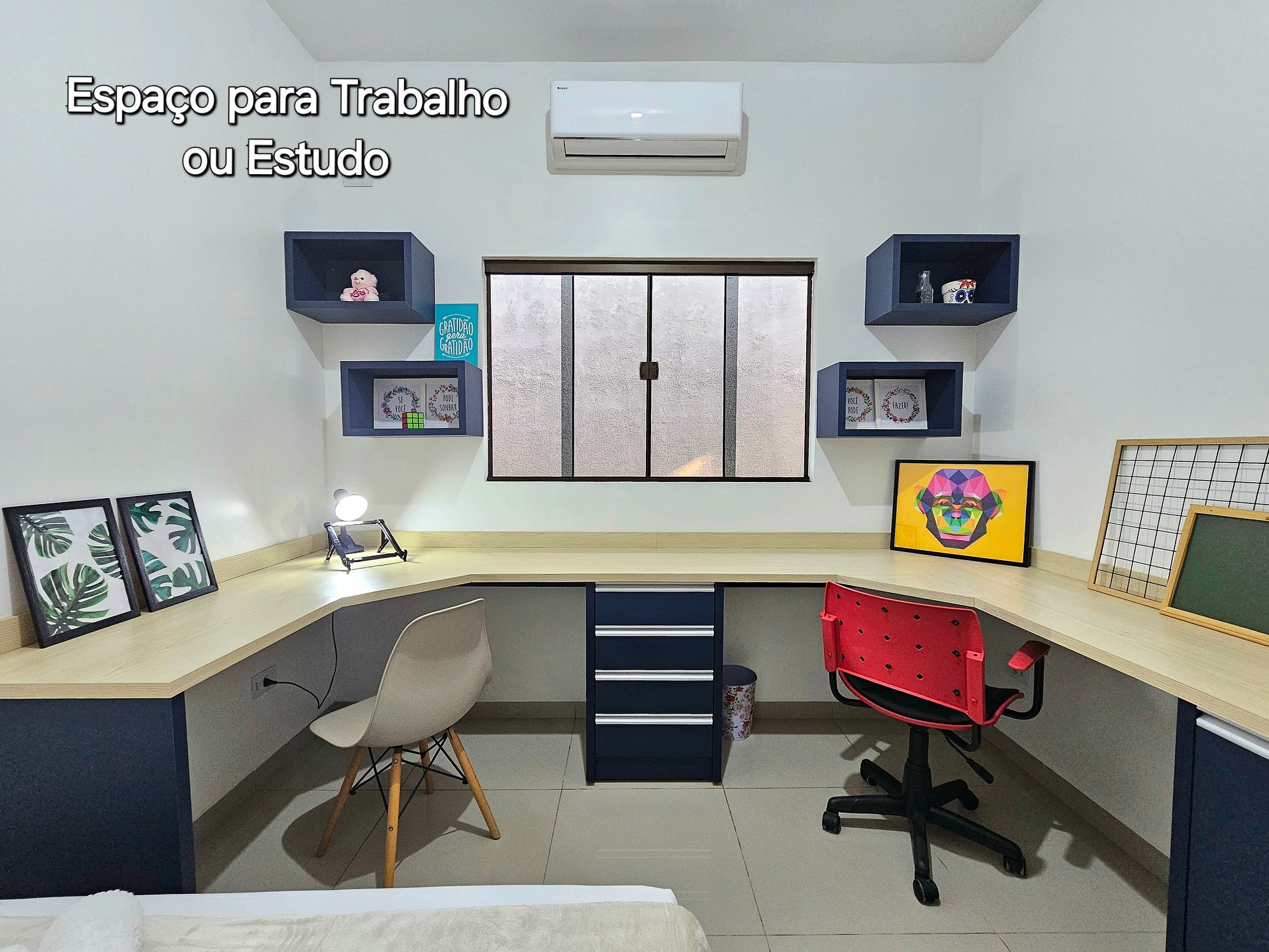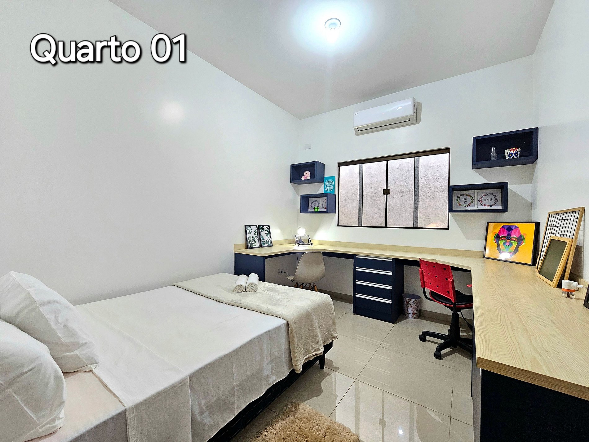 Quarto 01: 01 cama de casal + espaço de trabalho e estudo.
