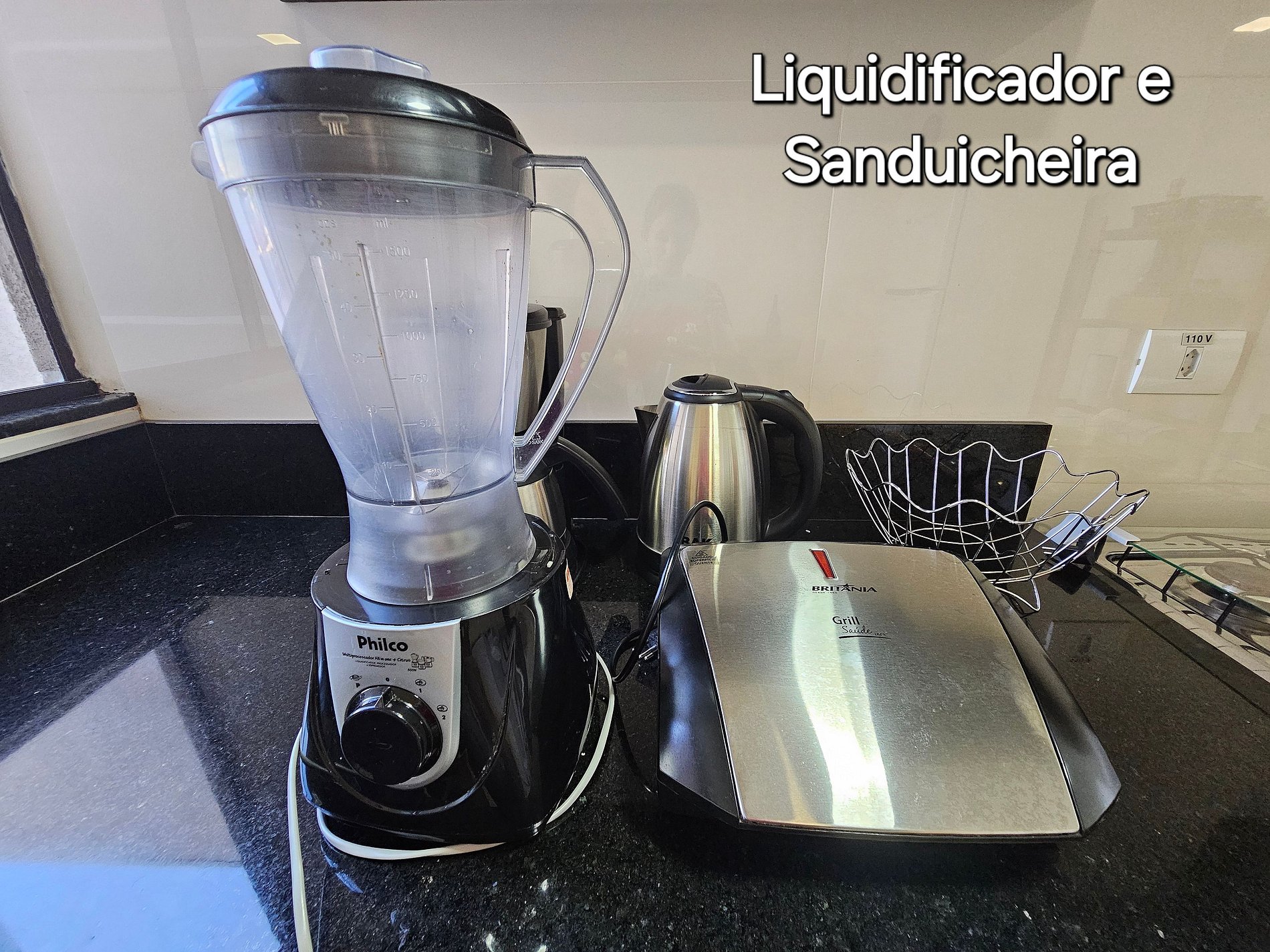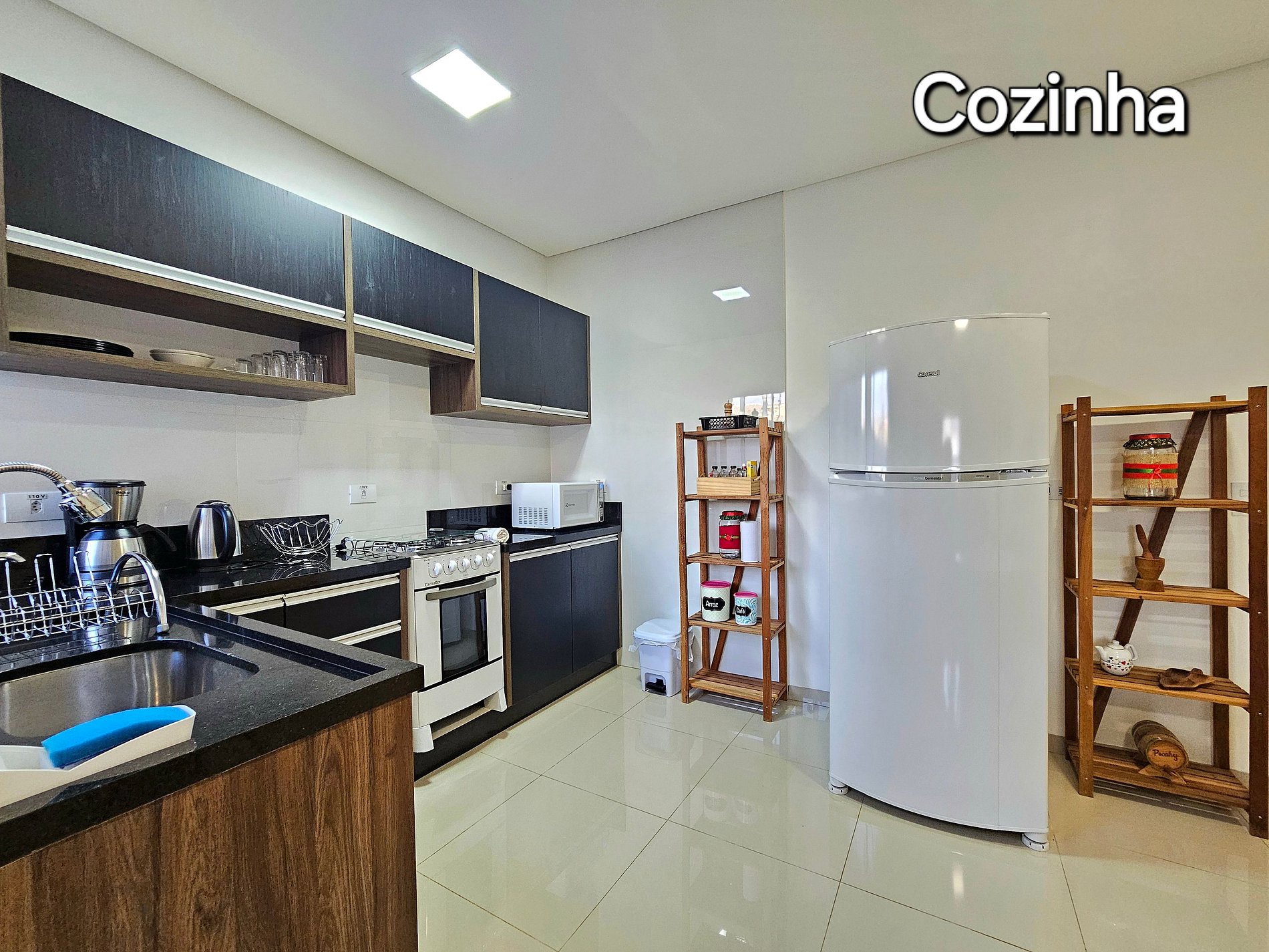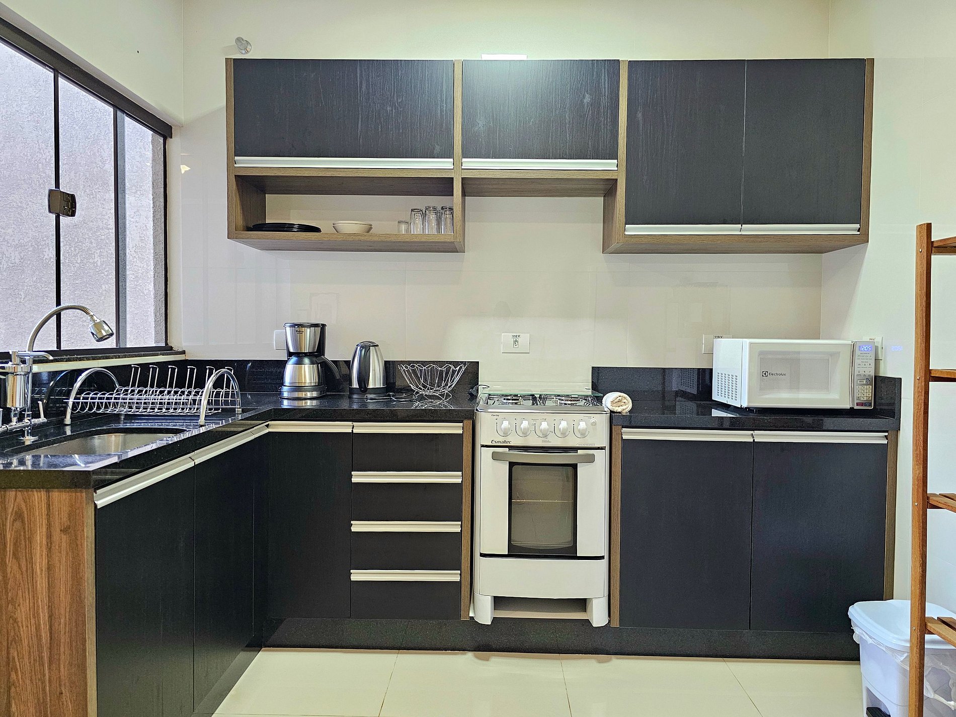 Cozinha completa com utensílios e louças para as refeições, fogão, microondas, cafeteira, sanduicheira, liquidificador.