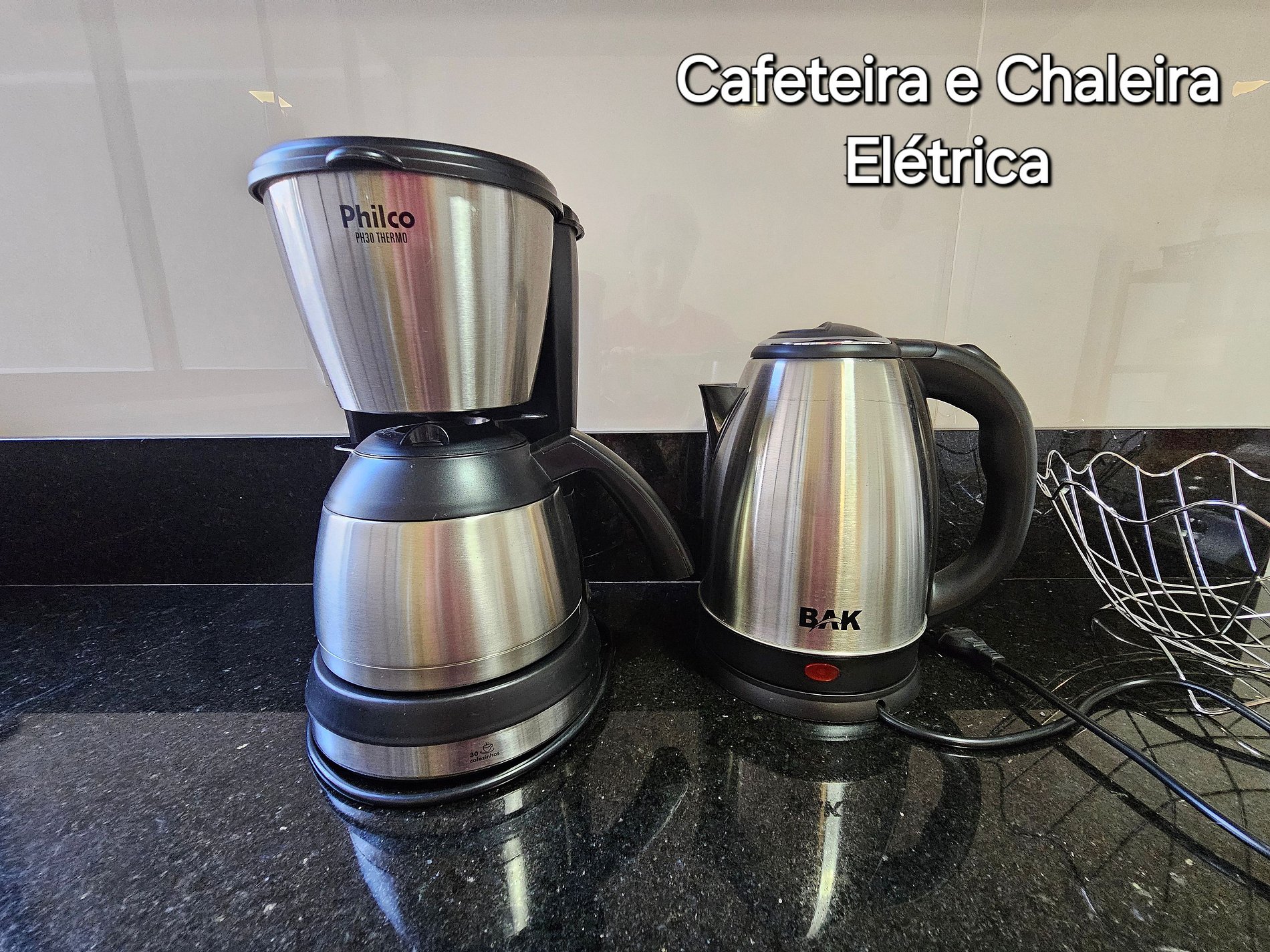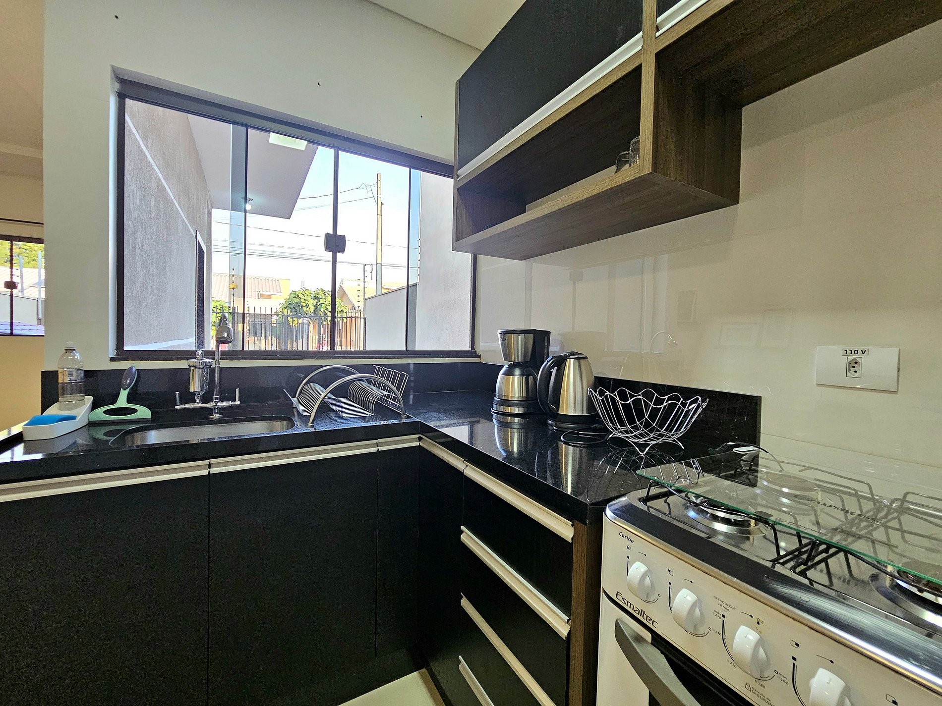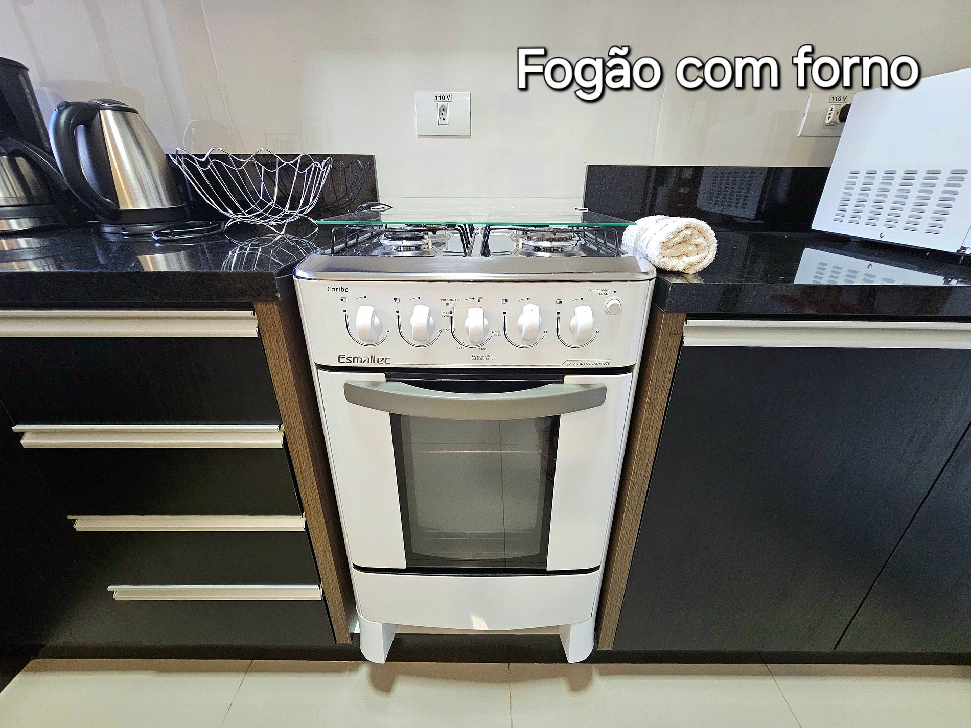 Cozinha completa com utensílios e louças para as refeições, fogão, microondas, cafeteira, sanduicheira, liquidificador.