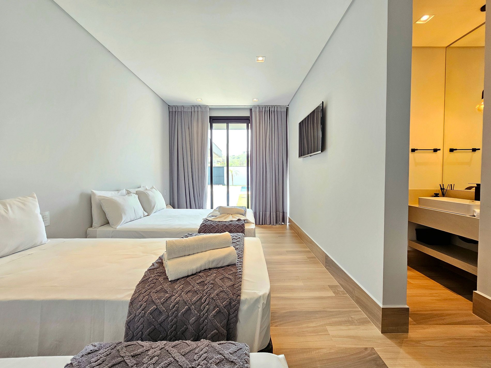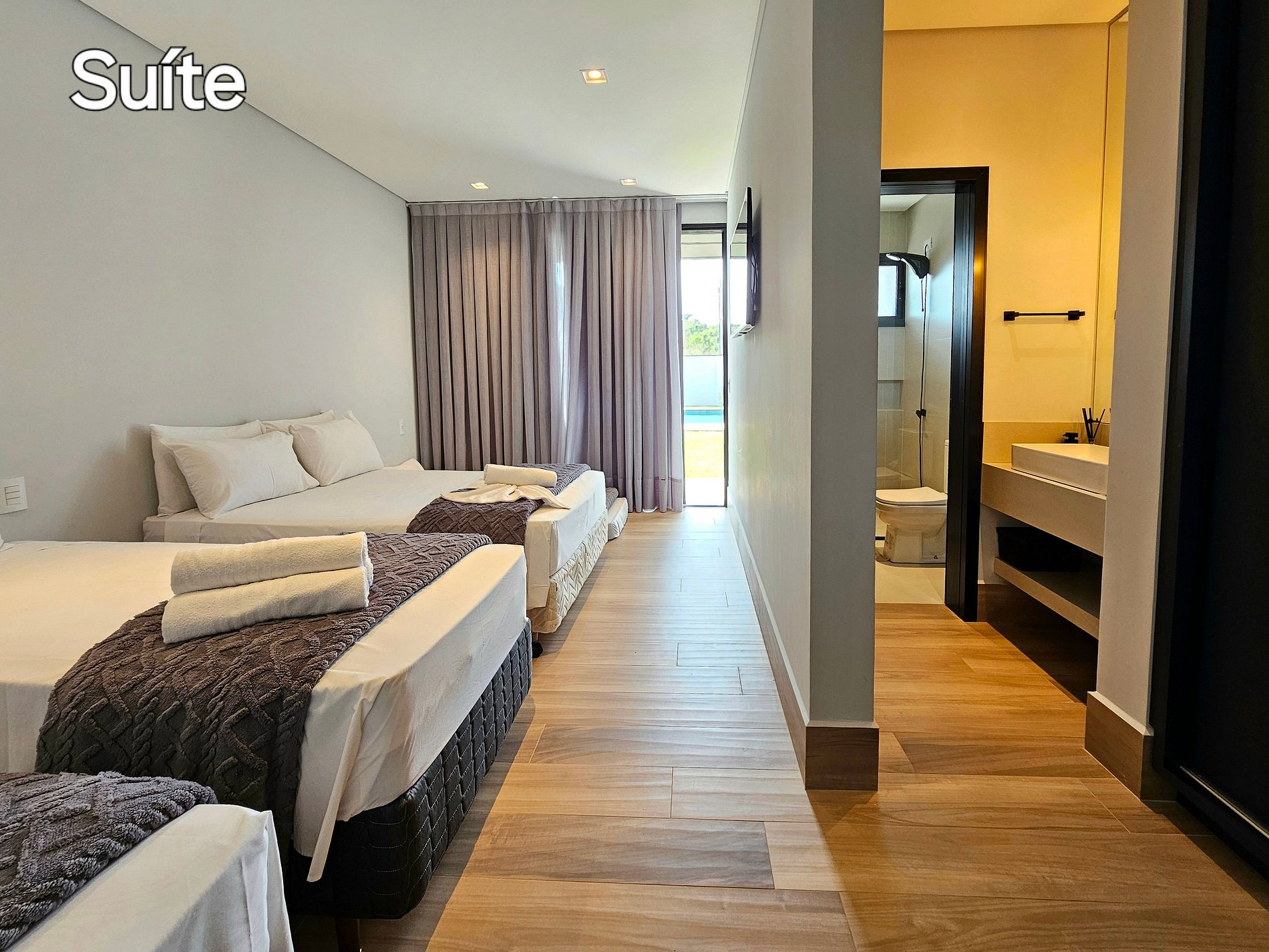 *Suite: 01 cama casal + 02 camas solteiro + 01 colchão, com banheiro, TV e ar condicionado. (deixamos roupas de cama e toalhas de banho, para o colchão também)