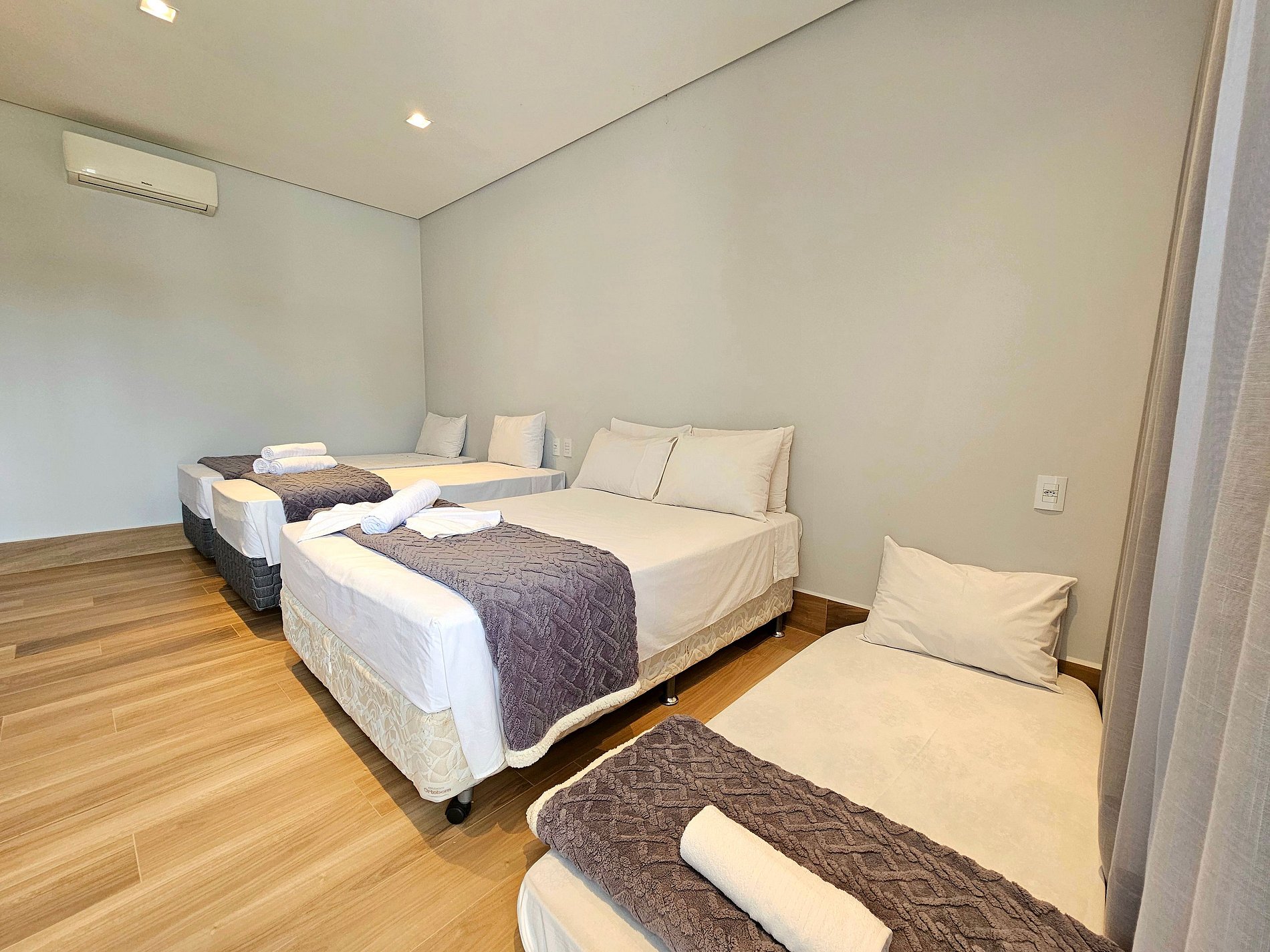 *Suite: 01 cama casal + 02 camas solteiro + 01 colchão, com banheiro, TV e ar condicionado. (deixamos roupas de cama e toalhas de banho, para o colchão também)