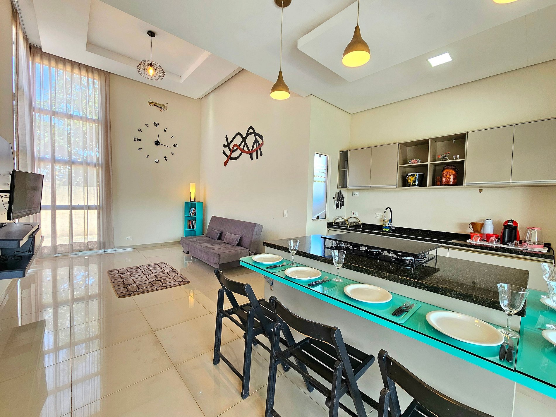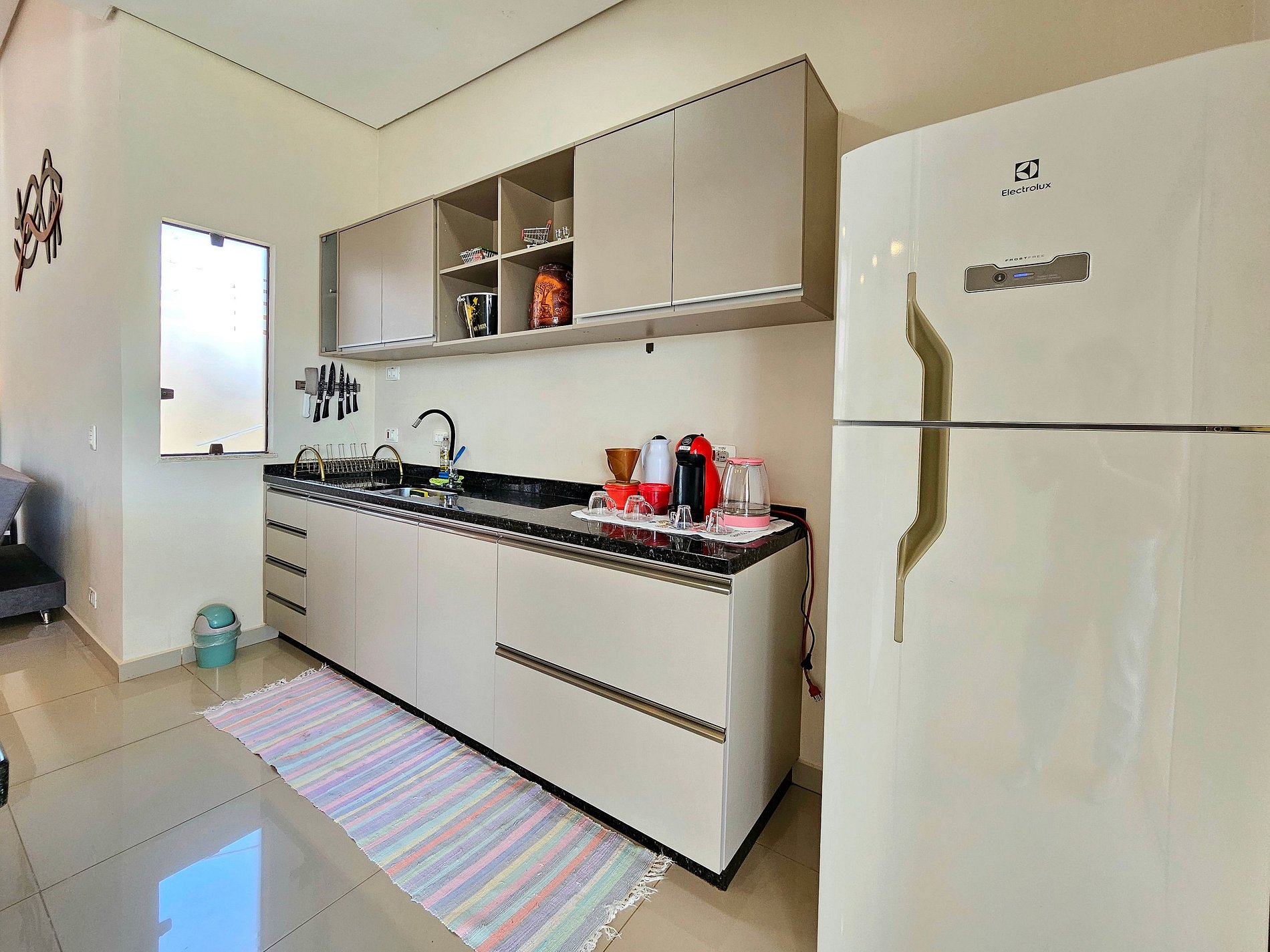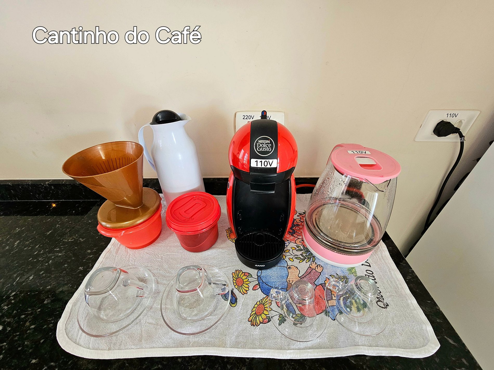 Cozinha completa com utensílios e louças para as refeições, fogão, microondas, cafeteira Dolcegusto, sanduicheira, liquidificador.