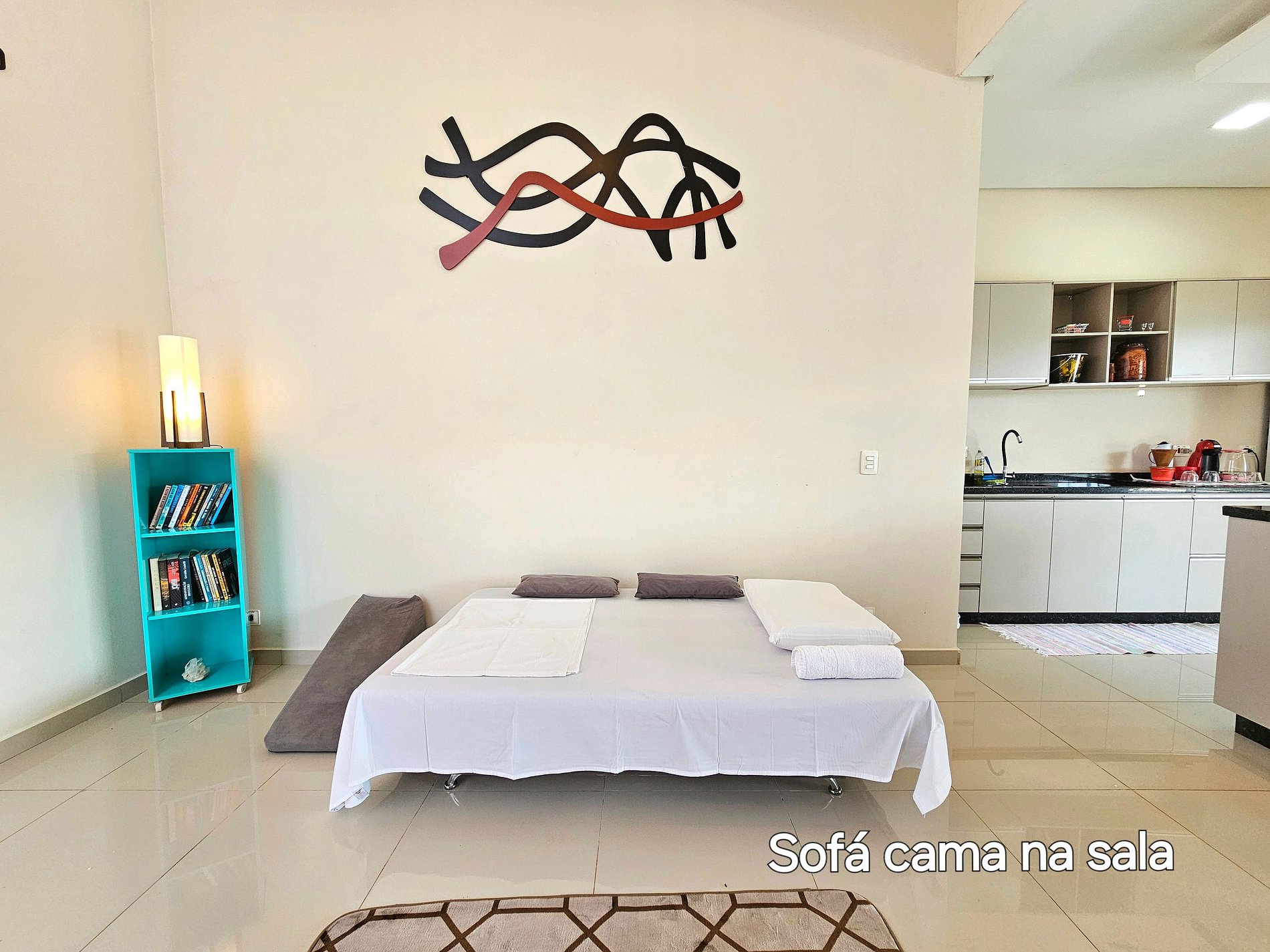 Sofá cama na sala: Para 1 pessoa com estatura grande ou 2 pessoas com estatura media e pequena, com roupa de cama também e toalha de banho.