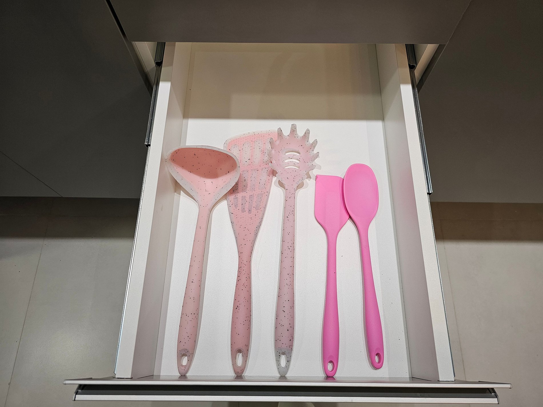 Cozinha completa com utensílios e louças para as refeições, microondas, sanduicheira, liquidificador.