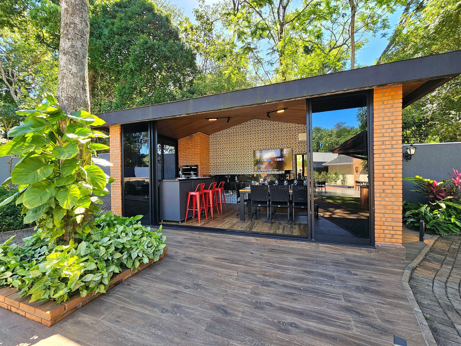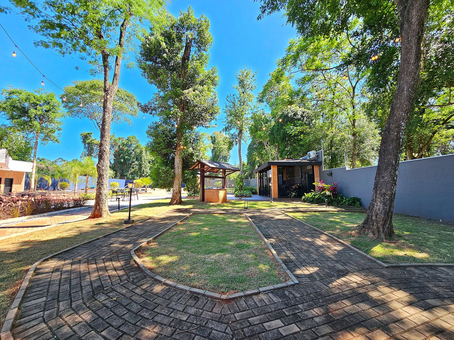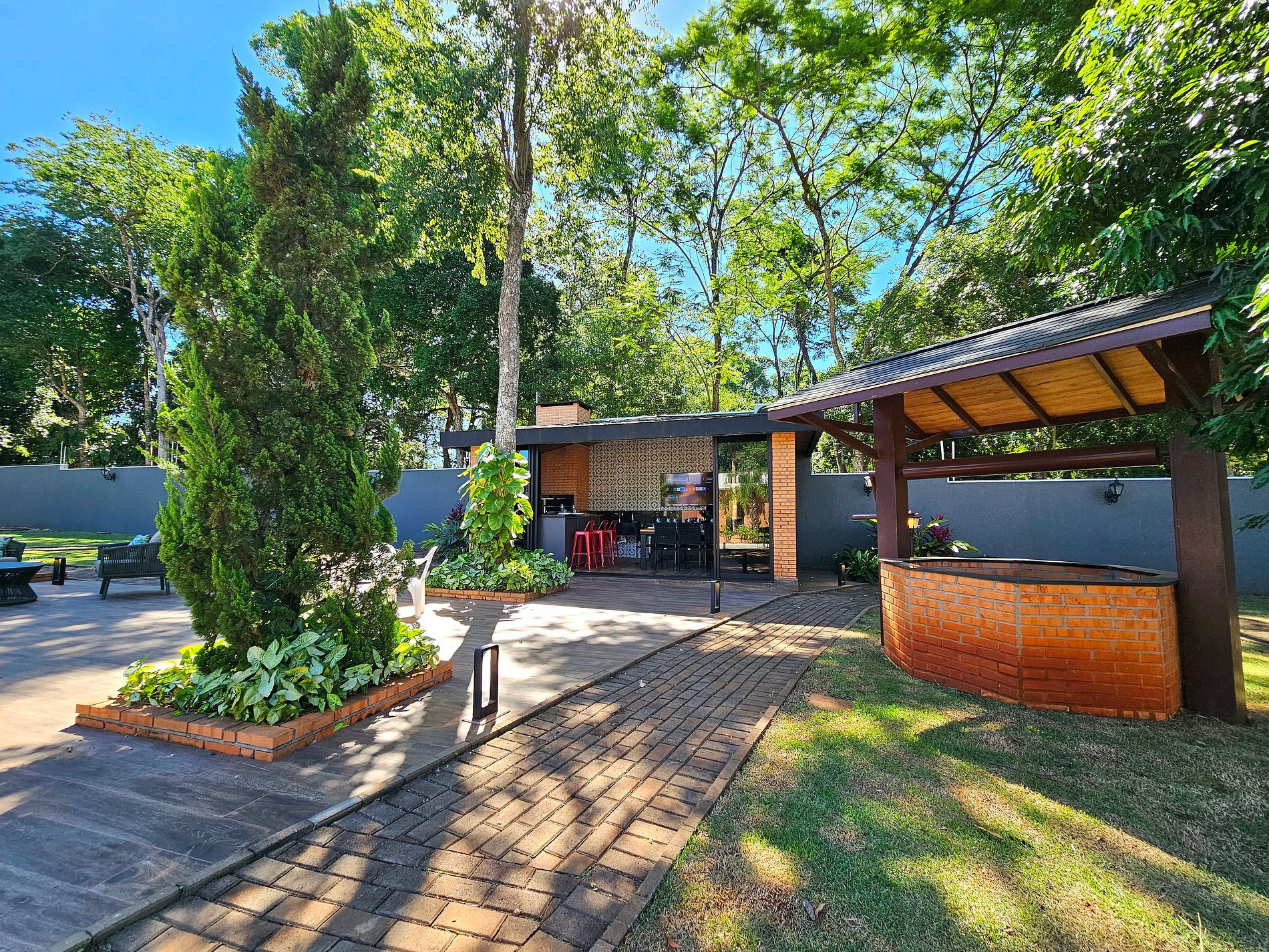 Espaço Alcázar — um refúgio sofisticado em meio à natureza, perfeito para quem busca tranquilidade e exclusividade. A propriedade oferece 3 casas integradas, acomodando de 1 a 14 pessoas com uso totalmente privativo. A poucos minutos da Av. das Cataratas, Aeroporto e Centro. Desfrute de uma linda área gourmet com churrasqueira, piscina e charmosos cantinhos para relaxar, conversar, ler e apreciar o verde. Bar opcional.