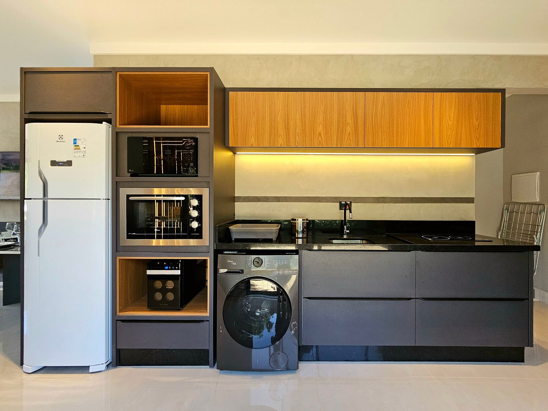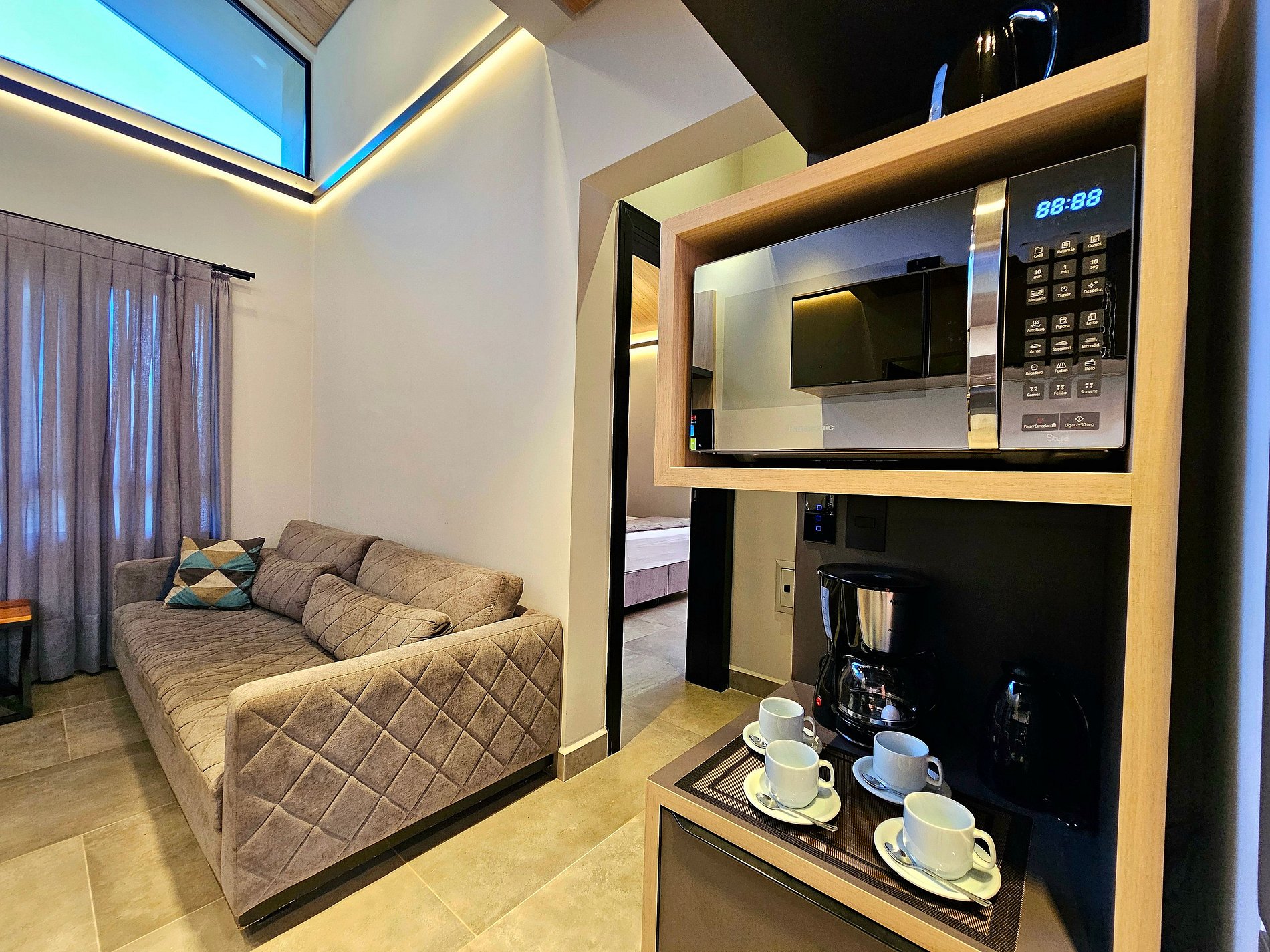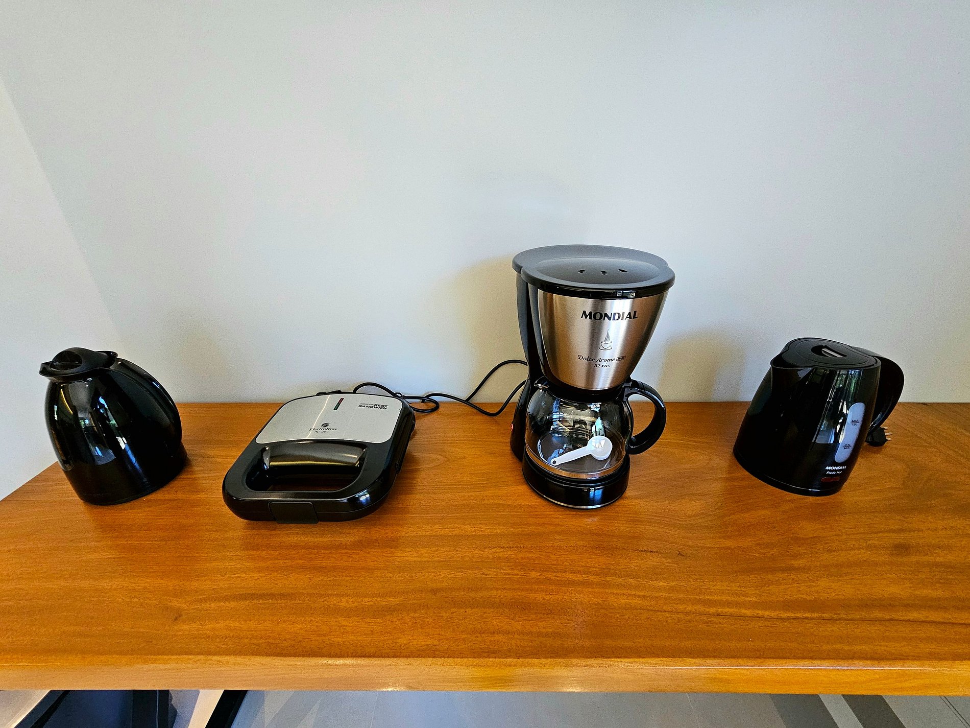 Todas as cozinhas são completa com utensílios e louças para as refeições, microondas, sanduicheira, cafeteira elétrica e chaleira elétrica.