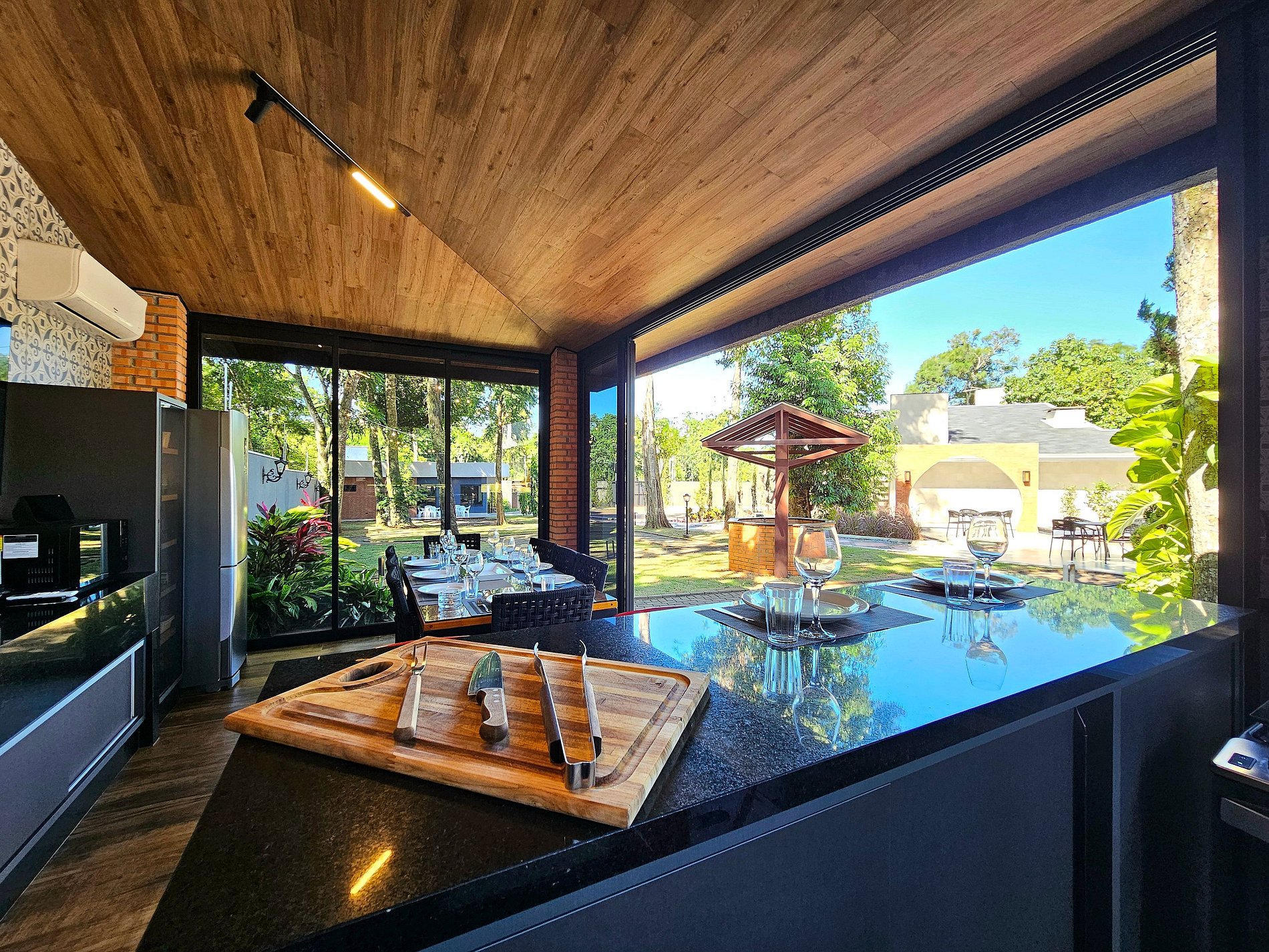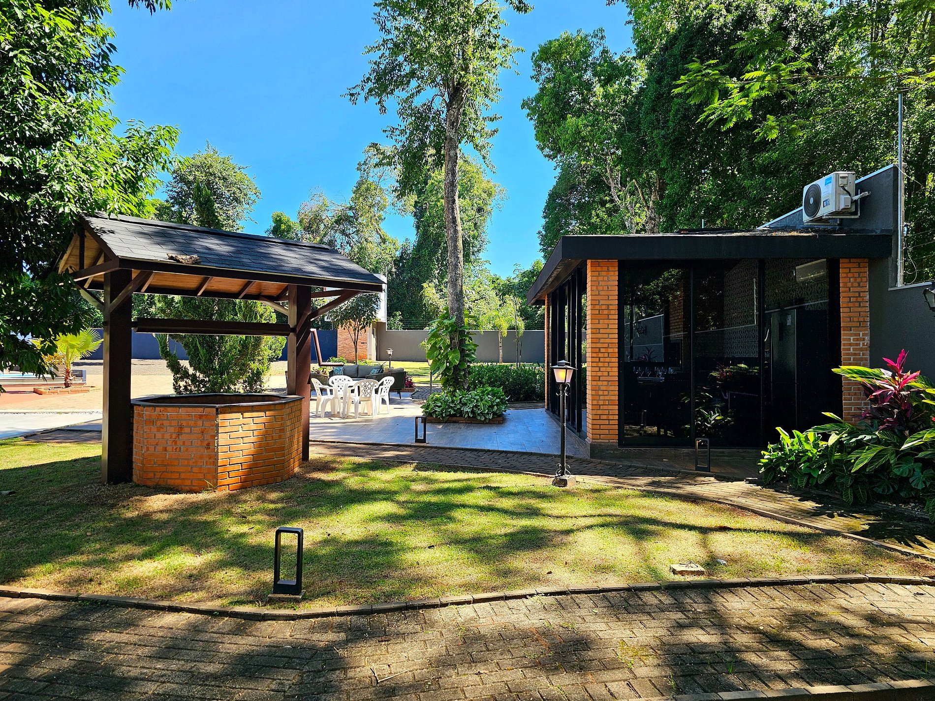 Espaço Alcazár, belíssima propriedade em meio a natureza para quem gosta de tranquilidade e sofisticação. Dentro do espaço temos 3 casas, uso de toda a propriedade exclusivamente sempre, sendo de 1 a 14 pessoas. Localização próxima da Av das Cataratas, menos de 5 minutos do aeroporto. De centro estamos cerca de 15 minutos. Área Gourmet com churrasqueira e piscina e alguns espaços especiais para sentar, conversar, ler um livro e admirar todo o verde que nos cerca. Bar - opcional.