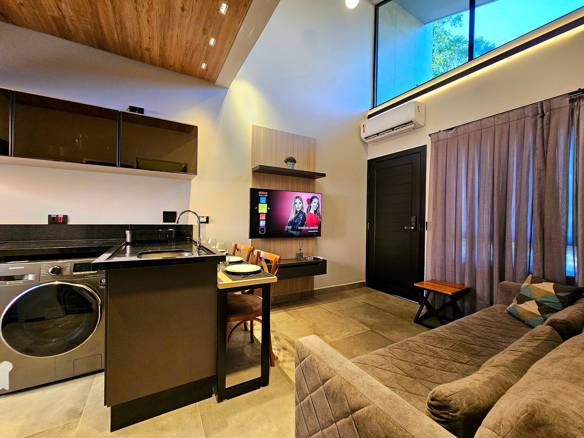 Casa 03: 01 quarto com 01 cama queensize + 01 cama solteiro + 01 sofa cama para 1 pessoa. Cozinha completa, sala de jantar e TV. 01 banheiro. Churrasqueira privada, Máquina lava e seca - roupas.