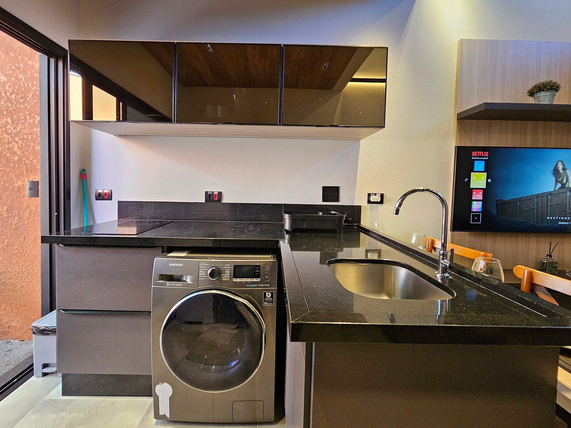 Casa 02: 01 quarto com 01 cama queensize + 01 cama solteiro + 01 sofa cama para 1 pessoa. Cozinha completa, sala de jantar e TV. 01 banheiro. Churrasqueira privada, Máquina lava e seca - roupas.